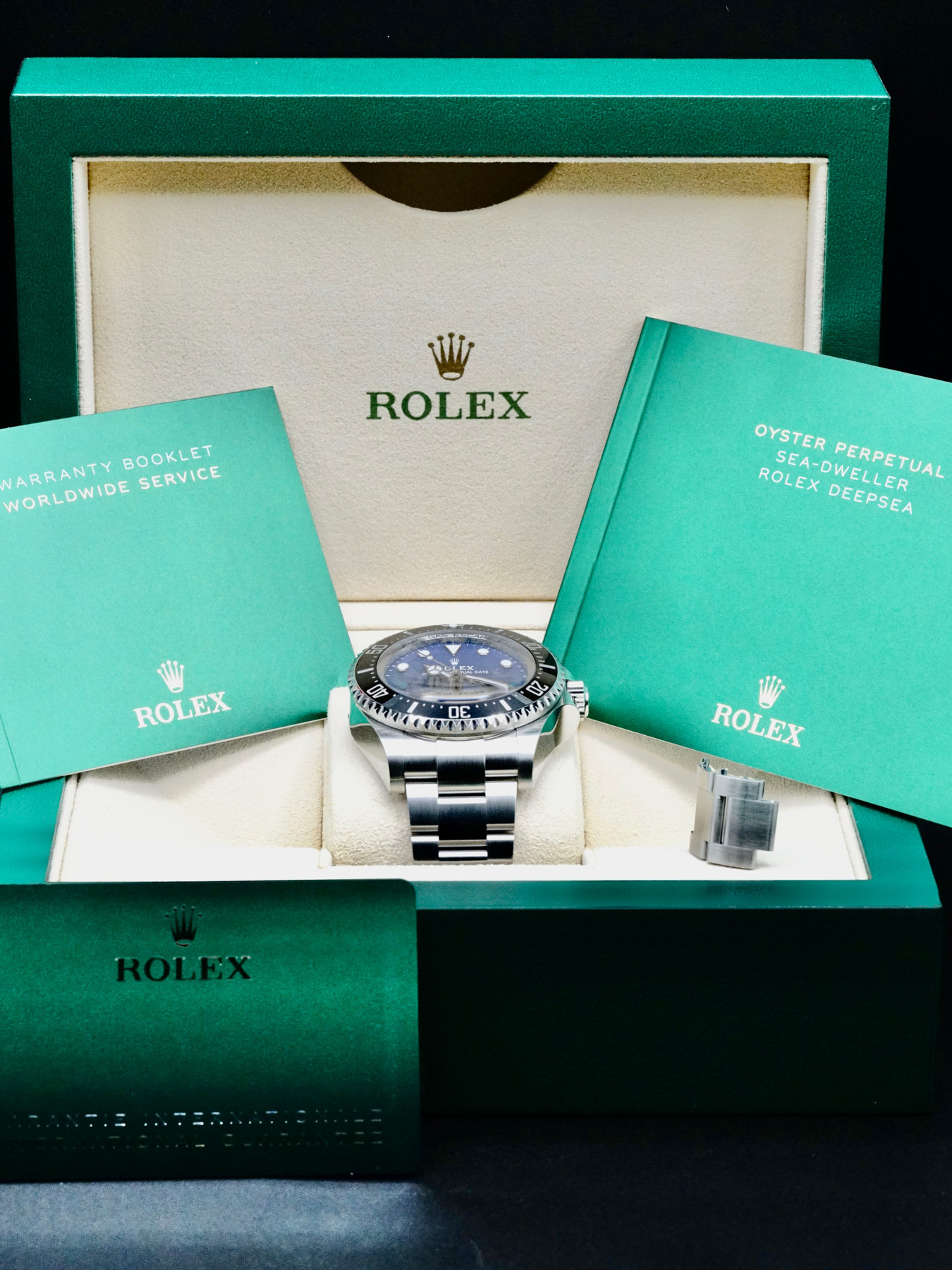 This Rolex Sea-Dweller Deepsea 126660 is in EXCELLENT condition. This watch includes its original box, instruction manual, and guarantee card dated for December 2020. Extra stainless steel bracelet links. This watch has been fully authenticated and certified by Exquisite Timepieces.