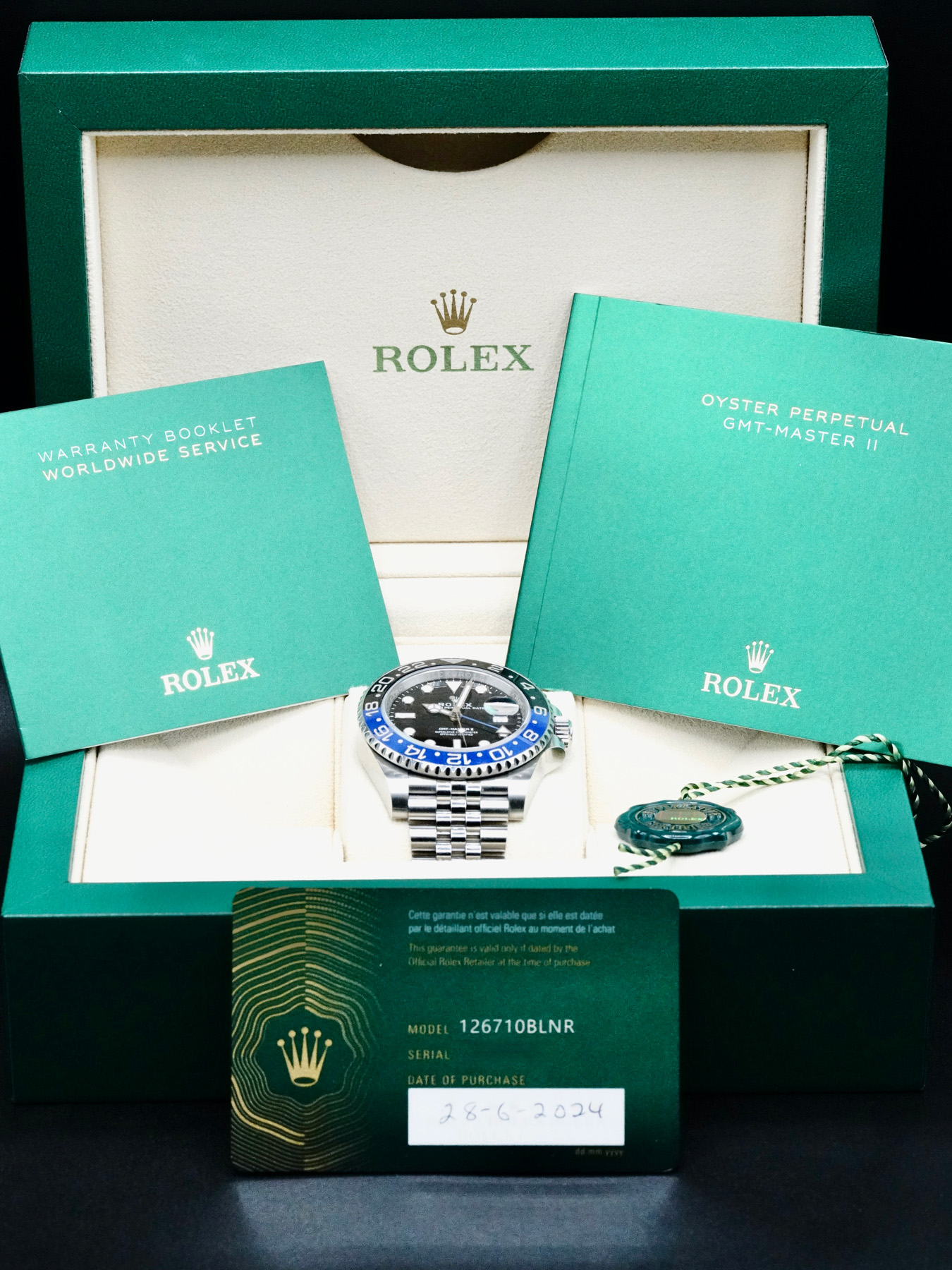This Rolex Oyster Perpetual GMT-Master II 126710BLNR is in EXCELLENT condition. This watch includes its original box, instruction manual, and warranty card dated for 2024. This Rolex watch has been fully authenticated and certified by a 3rd party organization. You’ll receive the certificate of authenticity with your purchase.