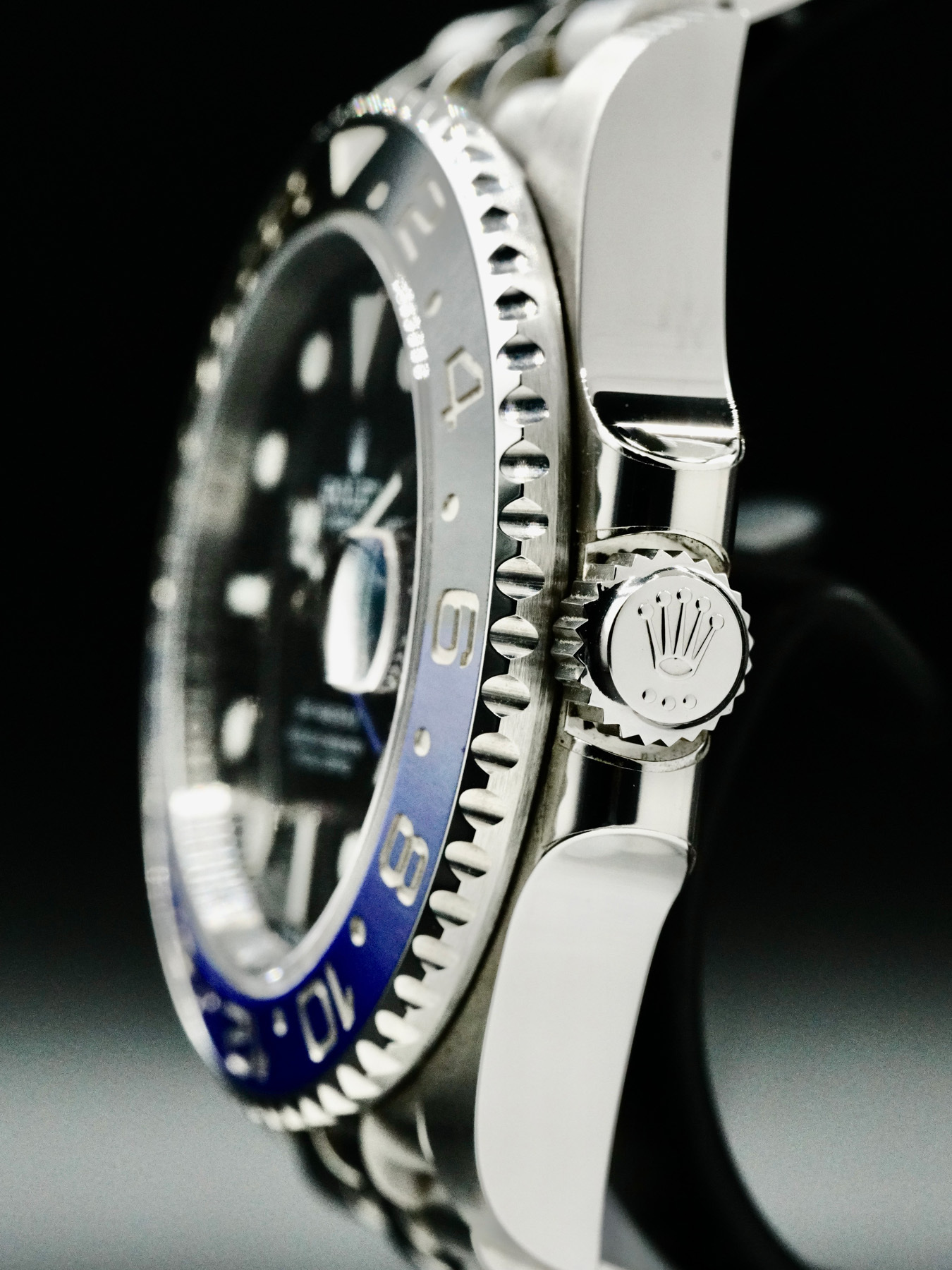 This Rolex GMT-Master II features a 40mm stainless steel case with a solid case back on a stainless steel jubilee bracelet. This watch sports a two-colour blue and black Cerachrom bidirectional bezel insert in ceramic. The dial is black with a highly legible Chromalight display with long-lasting blue luminescence covered by scratch resistant sapphire crystal.