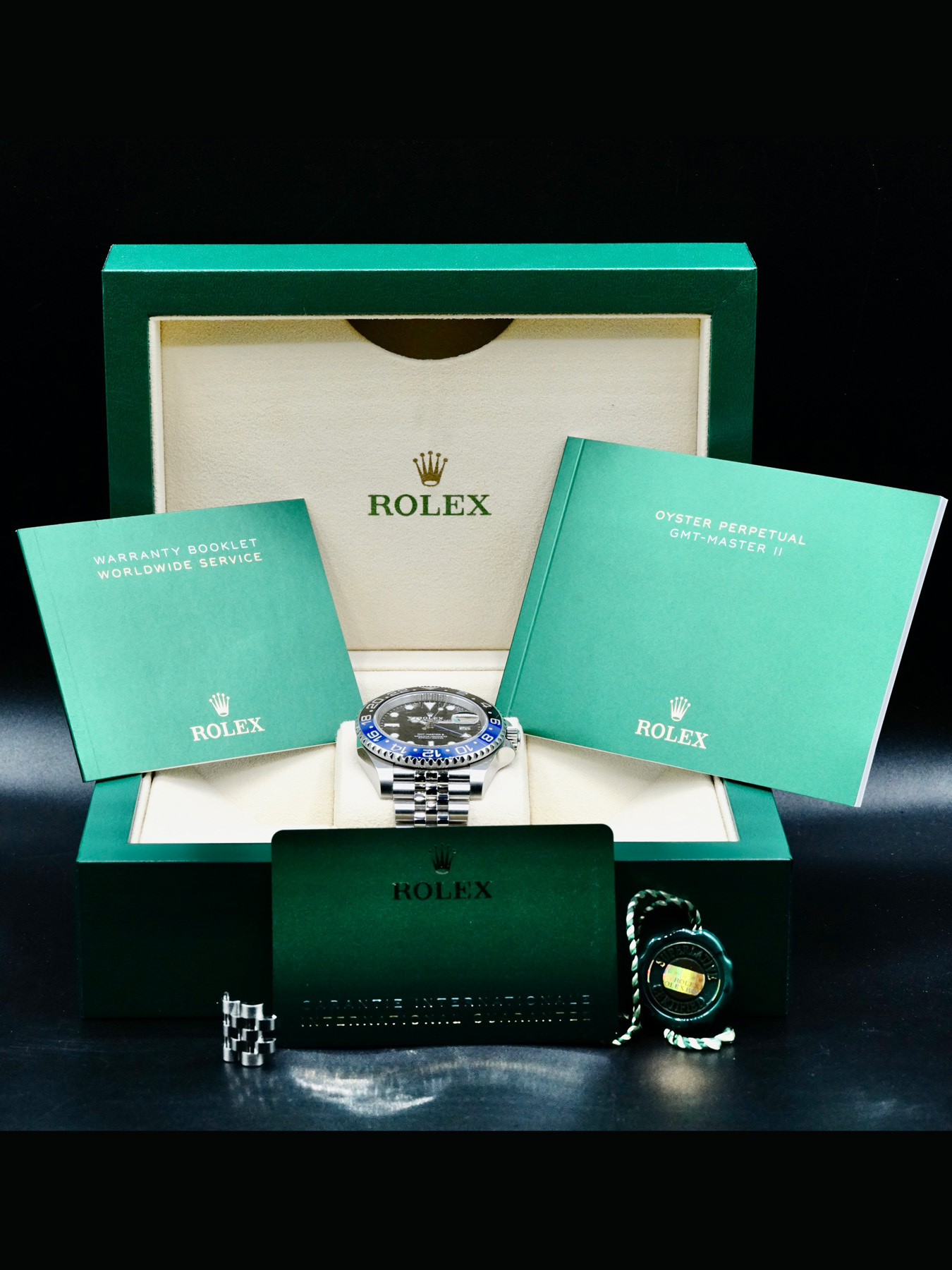 This Rolex Oyster Perpetual GMT-Master II 126710BLNR is in EXCELLENT condition. This watch includes its original box, instruction manual, warranty & worldwide service booklet, and international guarantee card dated for February 2021. Extra stainless steel bracelet link.