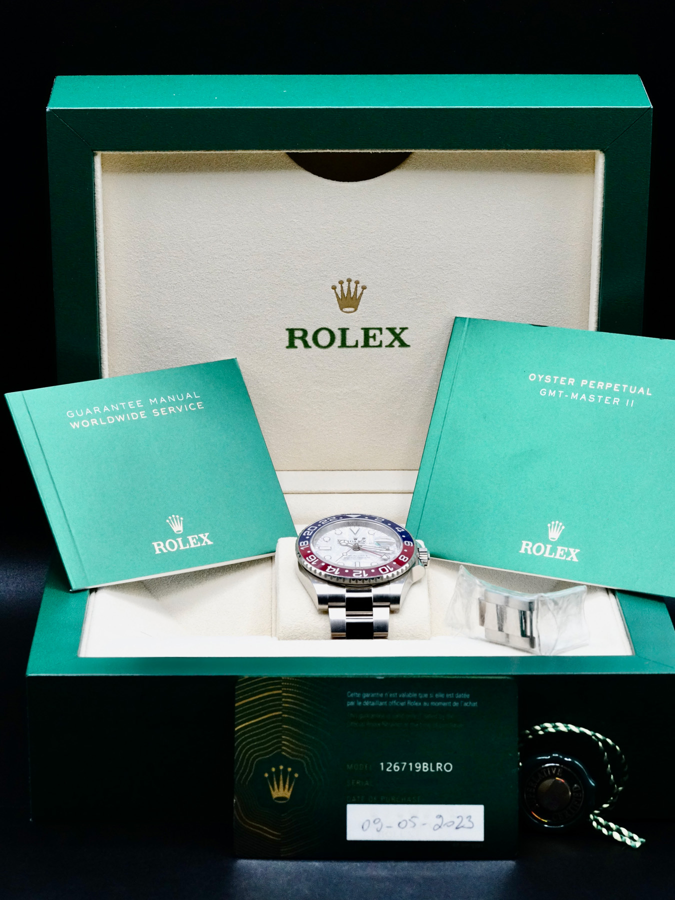 This Rolex GMT-Master II 126719BLRO is in EXCELLENT condition. This watch includes its original box, instruction manual, and warranty card dated for 2023. Extra 18k white gold bracelet links. This watch has been fully authenticated and certified by Exquisite Timepieces.