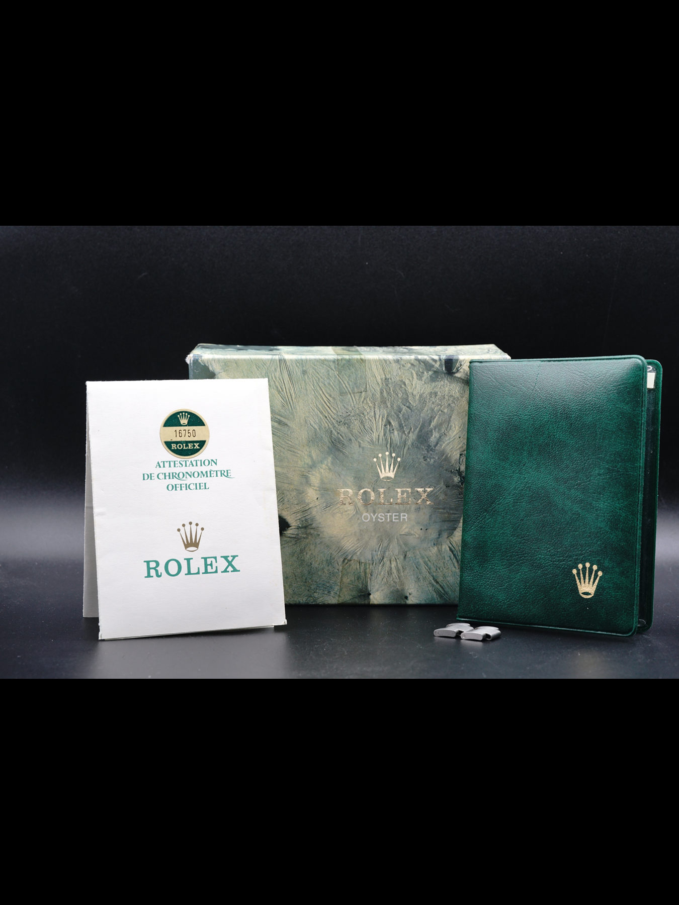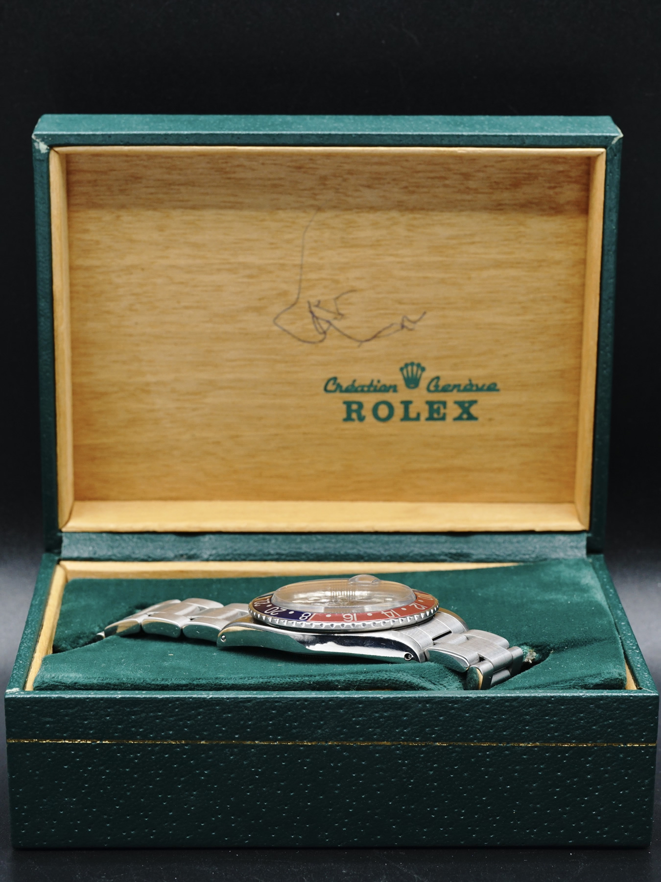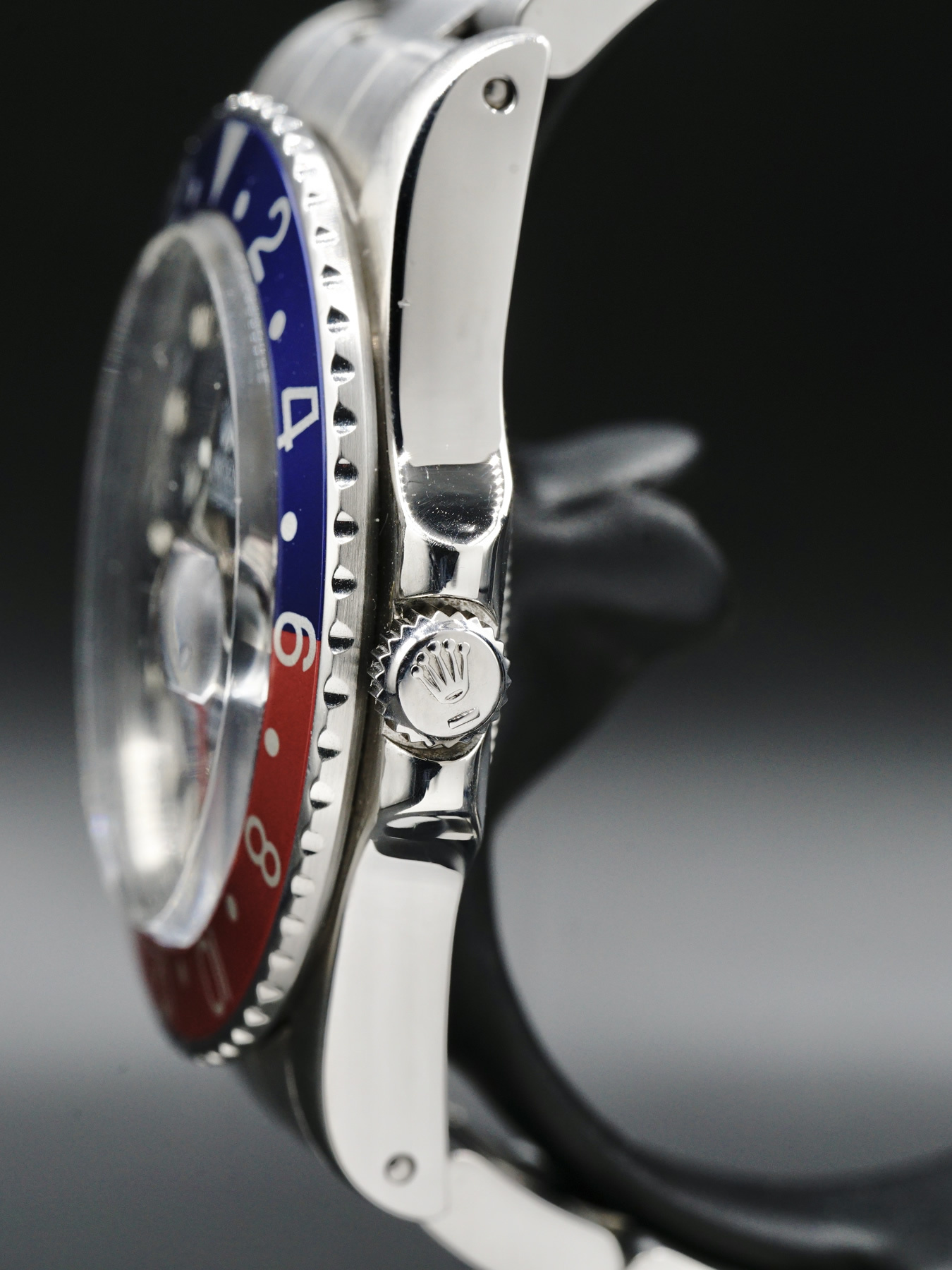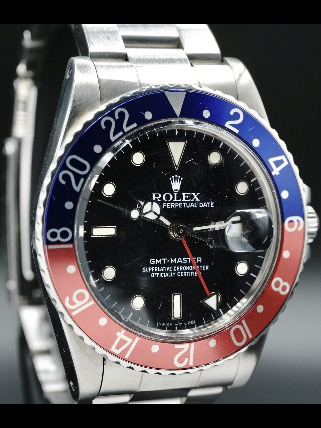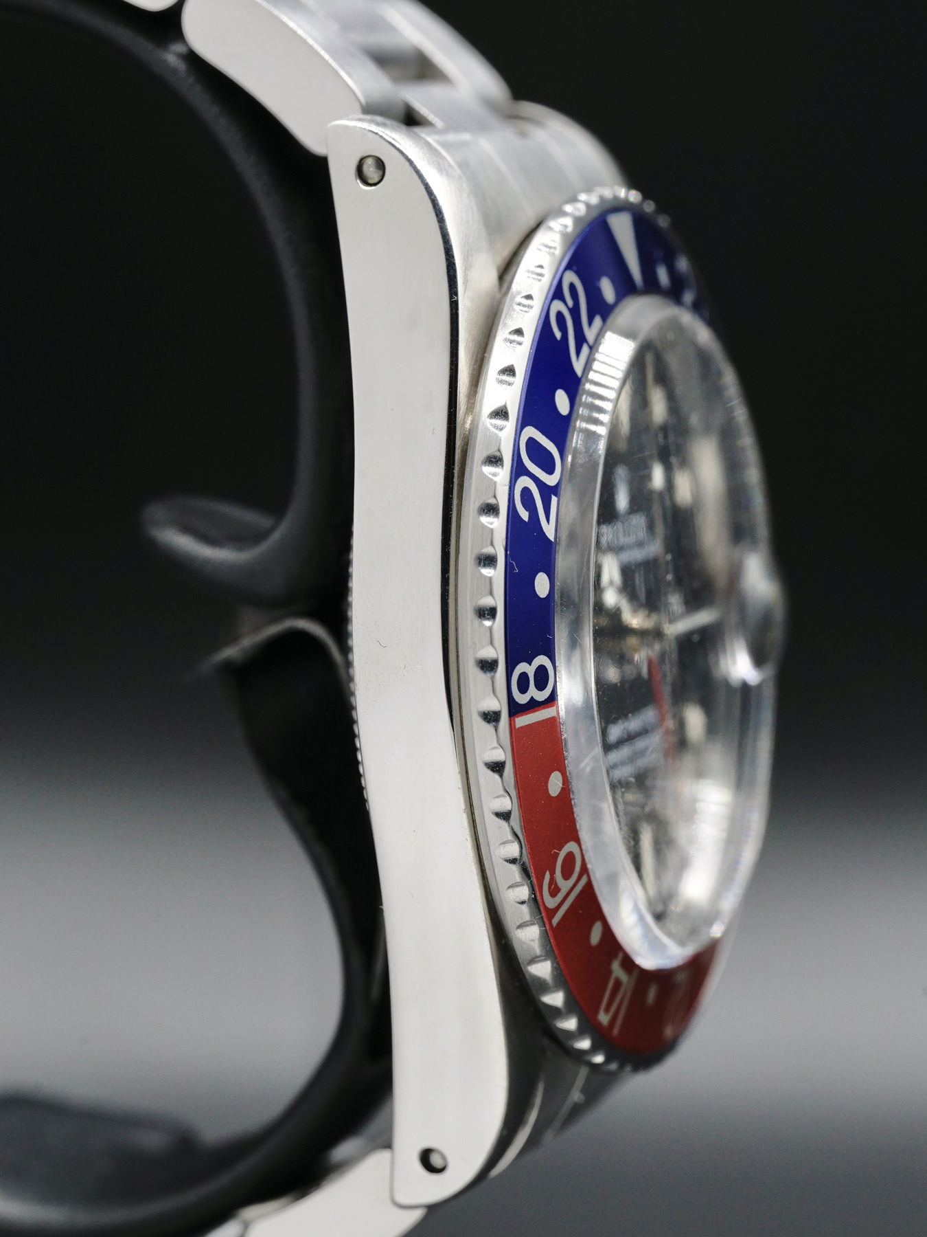 This Rolex GMT-Master Pepsi 16750 is in EXCELLENT condition. This watch includes its original box, instruction manual, and Official Rolex Chronometer Attestation. Extra stainless steel bracelet links.