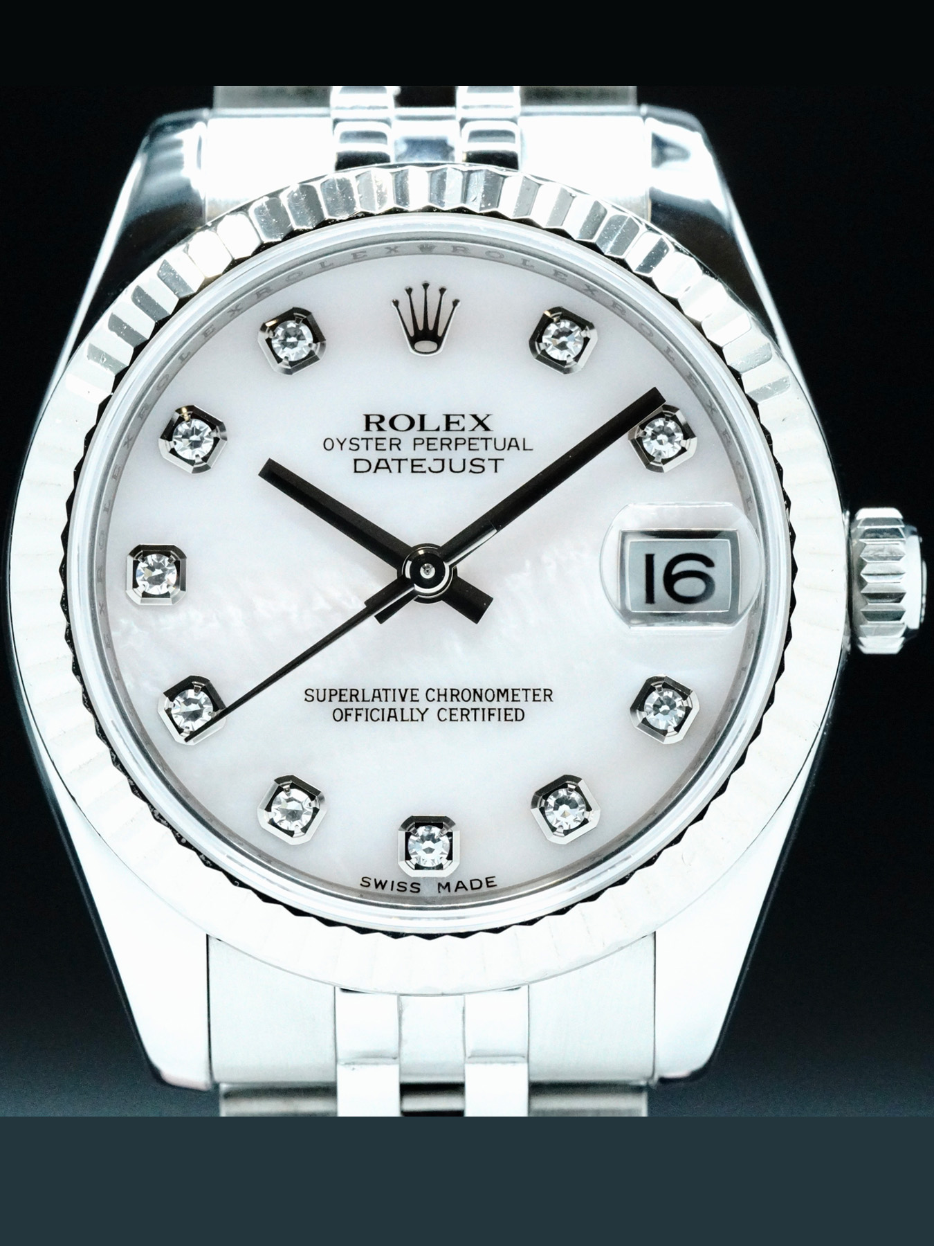 This Rolex Datejust features a 31mm stainless steel case with an 18k white gold fluted bezel on a stainless steel jubilee bracelet. This watch also sports a pink mother of pearl dial with silver-tone hands and diamond dial markers covered by scratch resistant sapphire crystal.