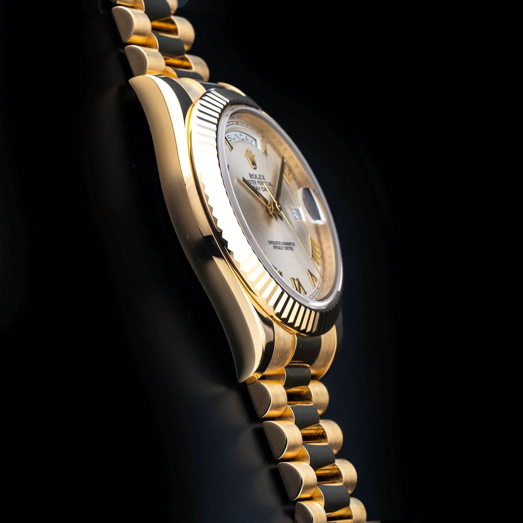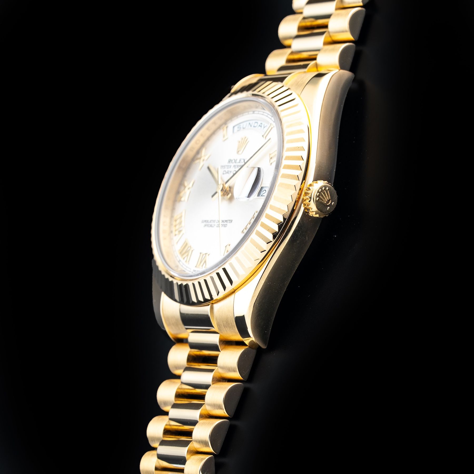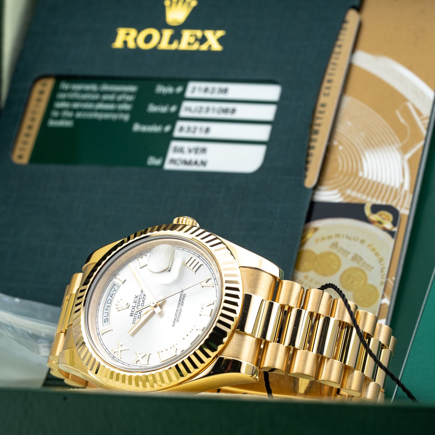 This Rolex 218238 Day-Date II is in GREAT condition. This watch includes its Original Box, Original Papers. This Rolex watch has been fully authenticated and certified by a 3rd party organization. You’ll receive the certificate of authenticity with your purchase. Please note, the photos shown are of the actual watch you will receive.