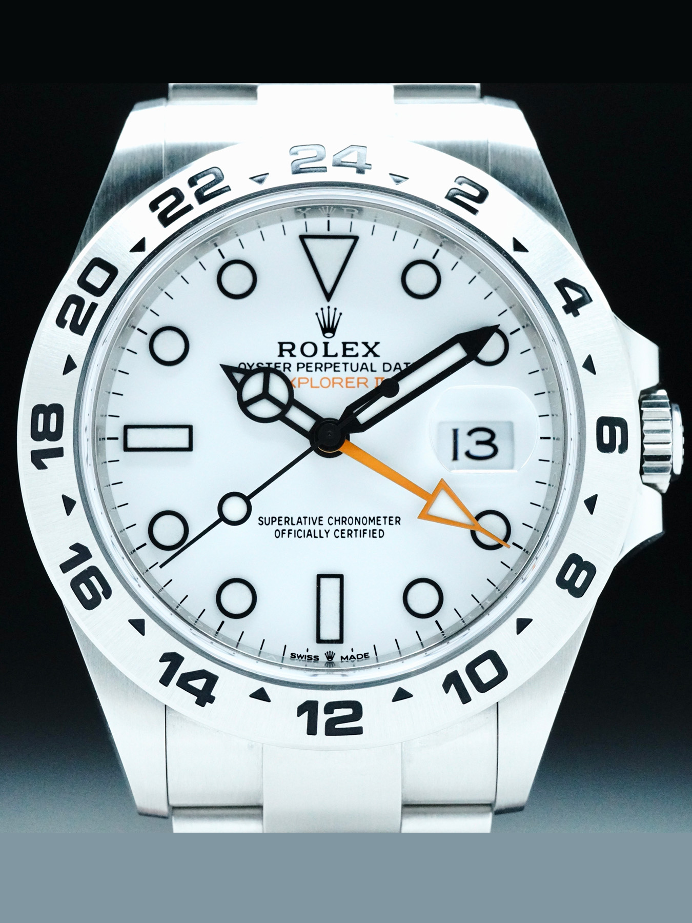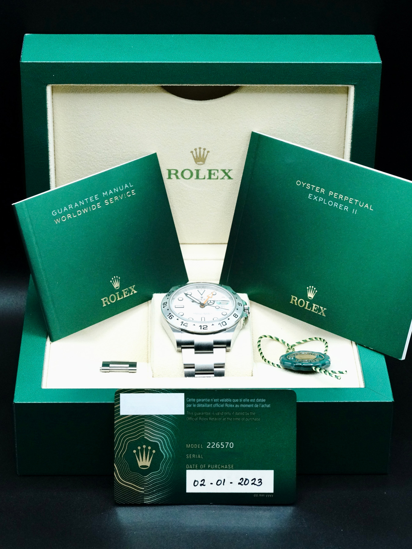 This Rolex 226570 Explorer II Polar is in GREAT condition. This watch includes its original box, original papers, and warranty card dated for January 2023. Extra bracelet link. This Rolex watch has been fully authenticated and certified by a 3rd party organization. You’ll receive the certificate of authenticity with your purchase.