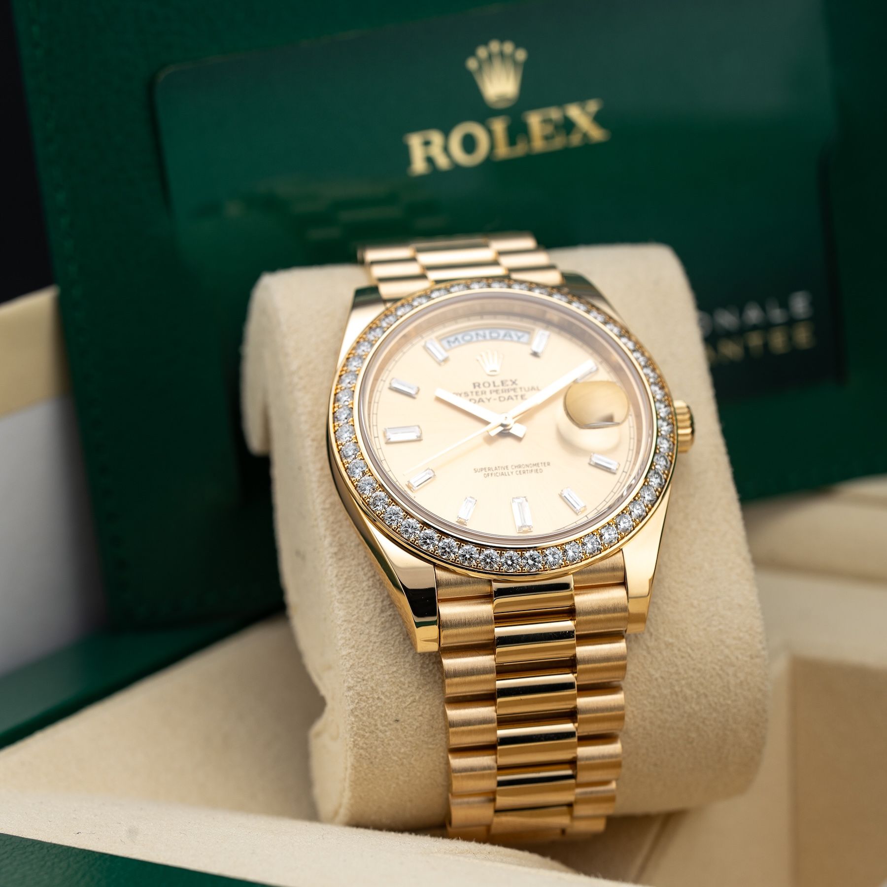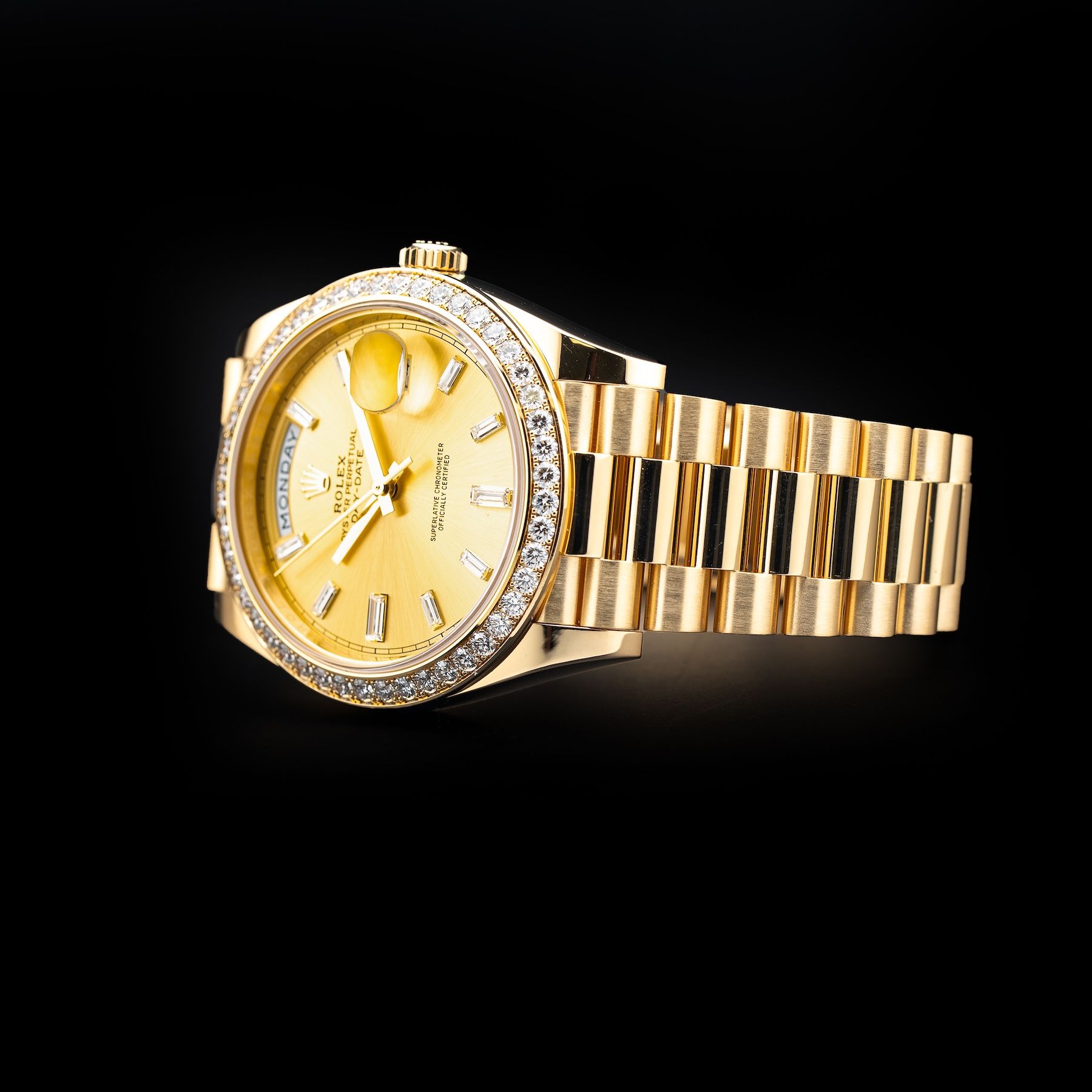This watch features a 40mm 18 kt yellow gold case on 18kt yellow gold bracelet. This watch also sports a champagne dial dial. Powered by a perpetual, mechanical, self-winding movement. Water resistance up to 100 meters.