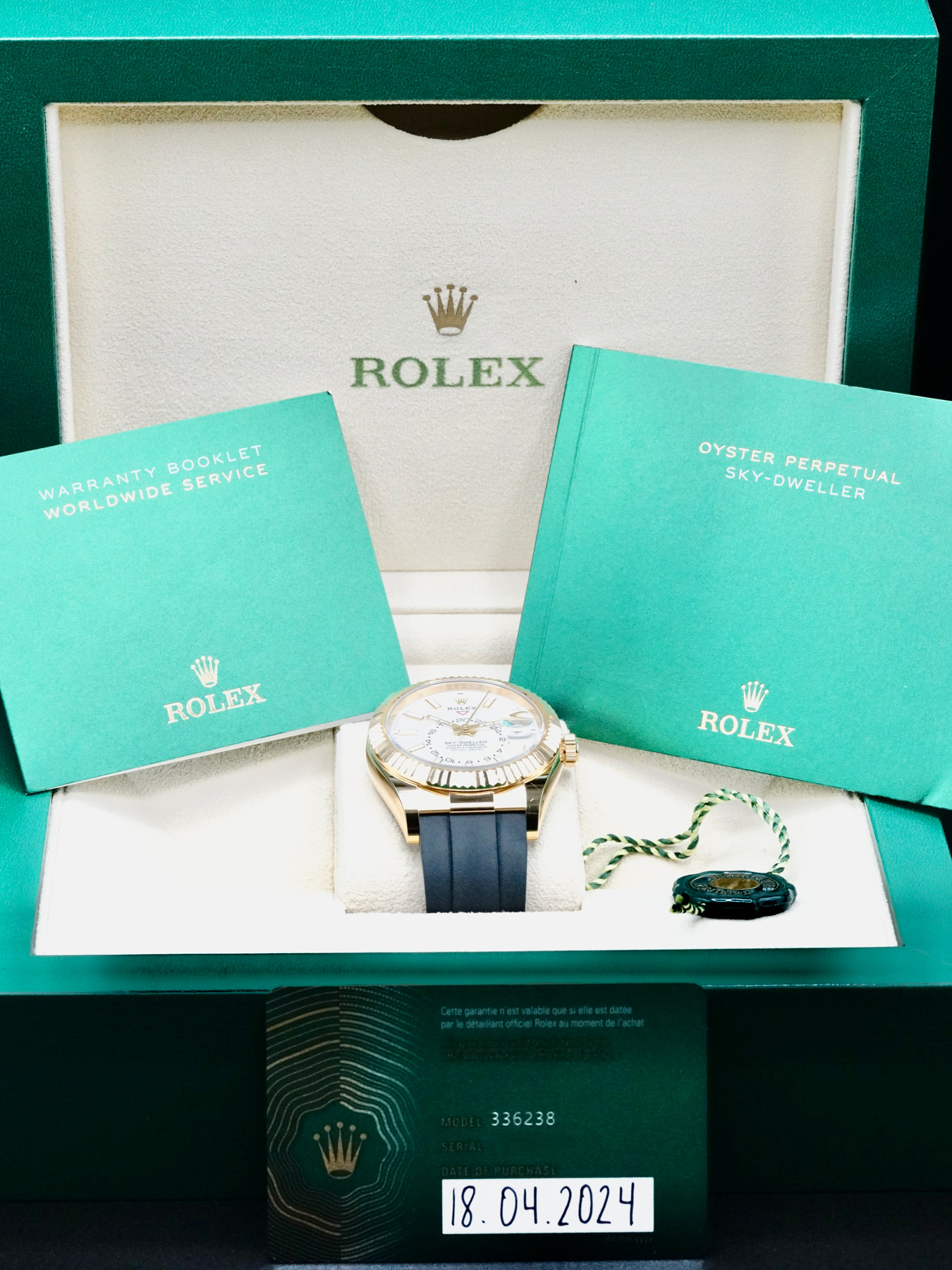 This Rolex Sky-Dweller 336238 is in GREAT condition. This watch includes its original box, instruction manual, and warranty card dated for 2024. This Rolex watch has been fully authenticated and certified by a 3rd party organization. You’ll receive the certificate of authenticity with your purchase.