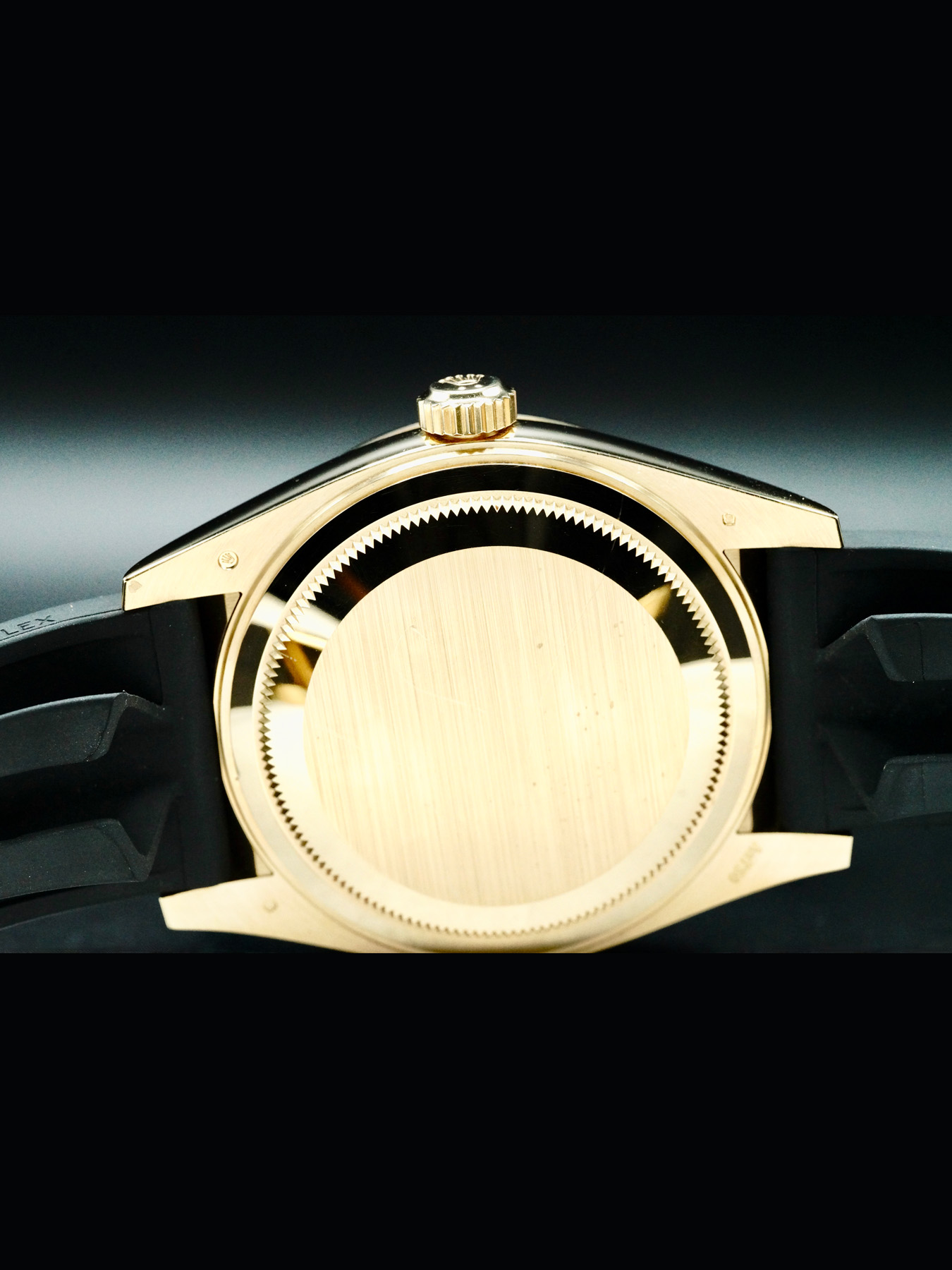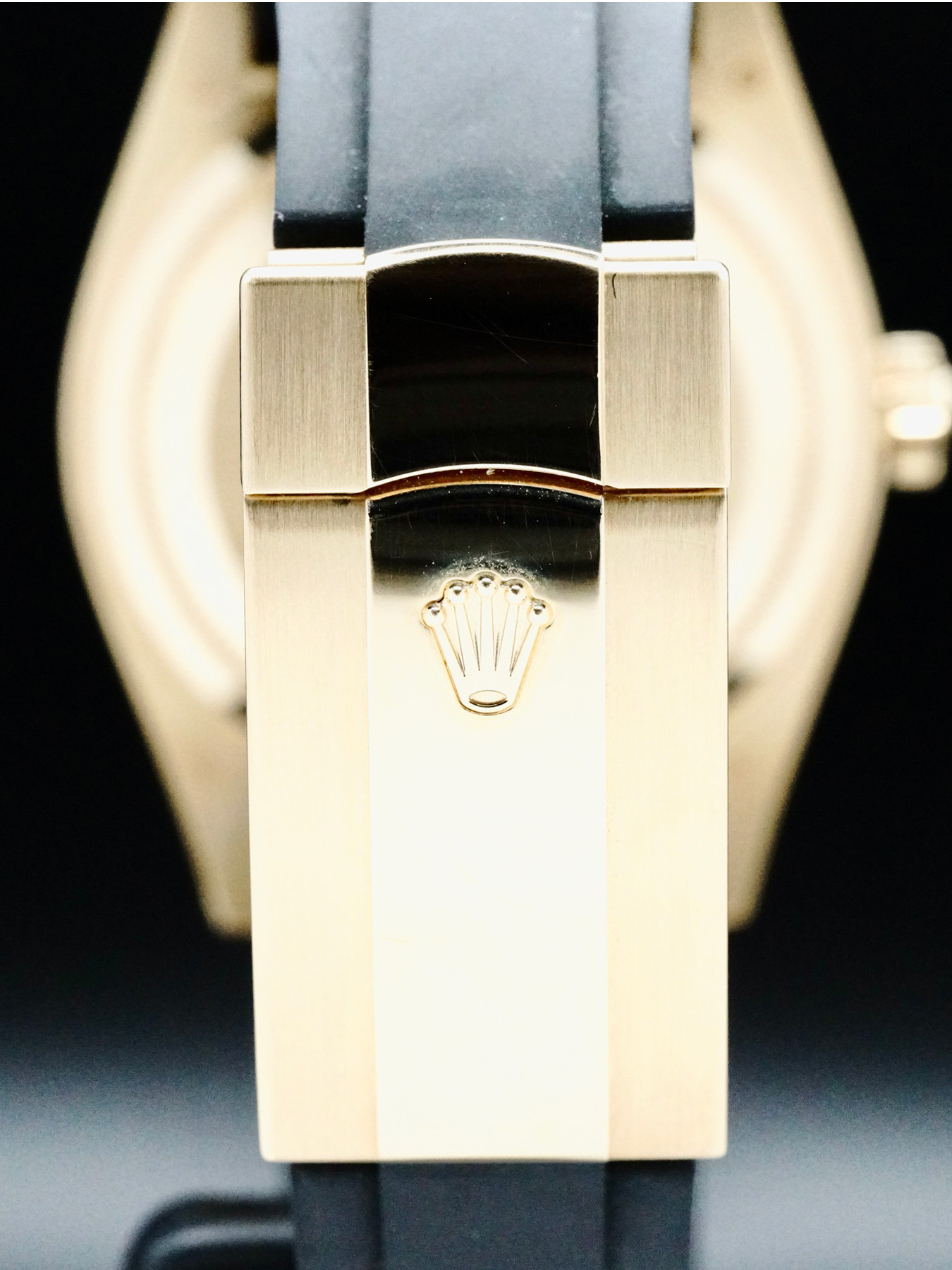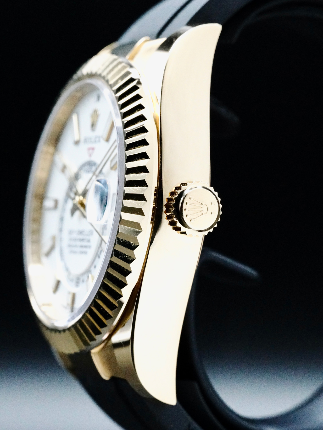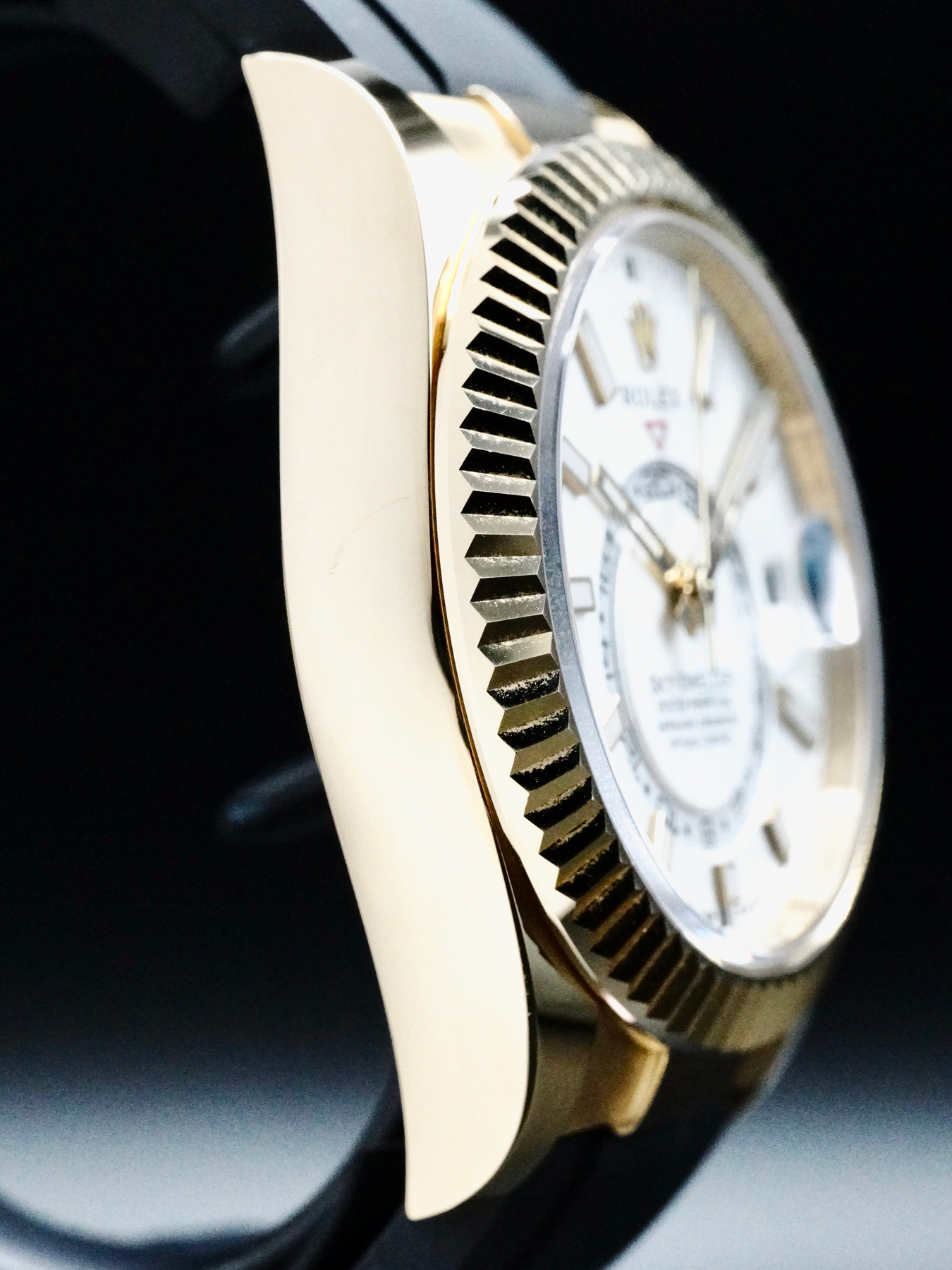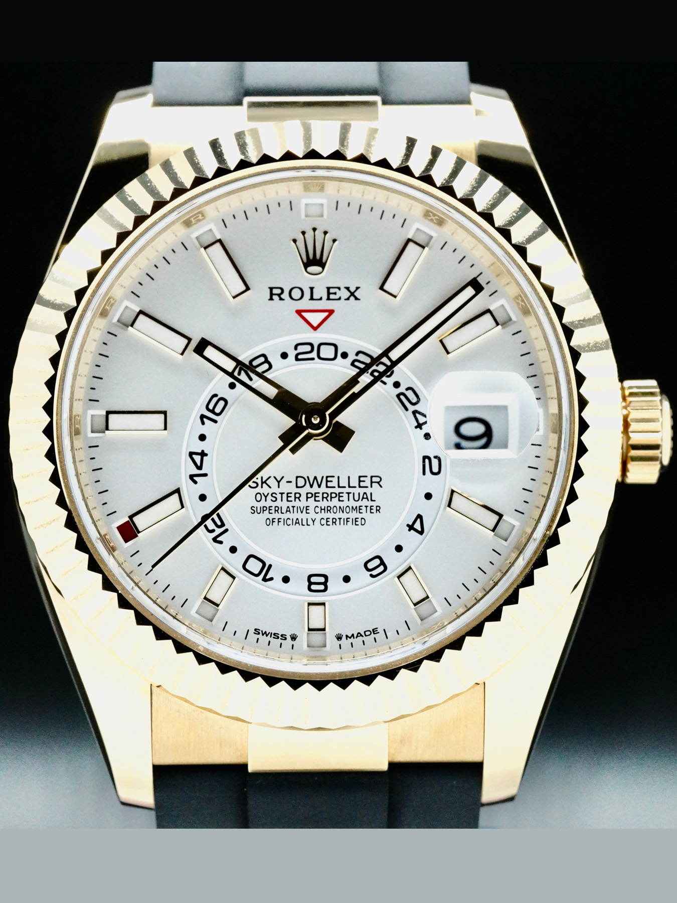 This Rolex Sky-Dweller features a 42mm 18k yellow gold case with a solid case back on a black rubber strap. This watch also sports a white dial with luminous hands and index dial markers covered by scratch resistant sapphire crystal.