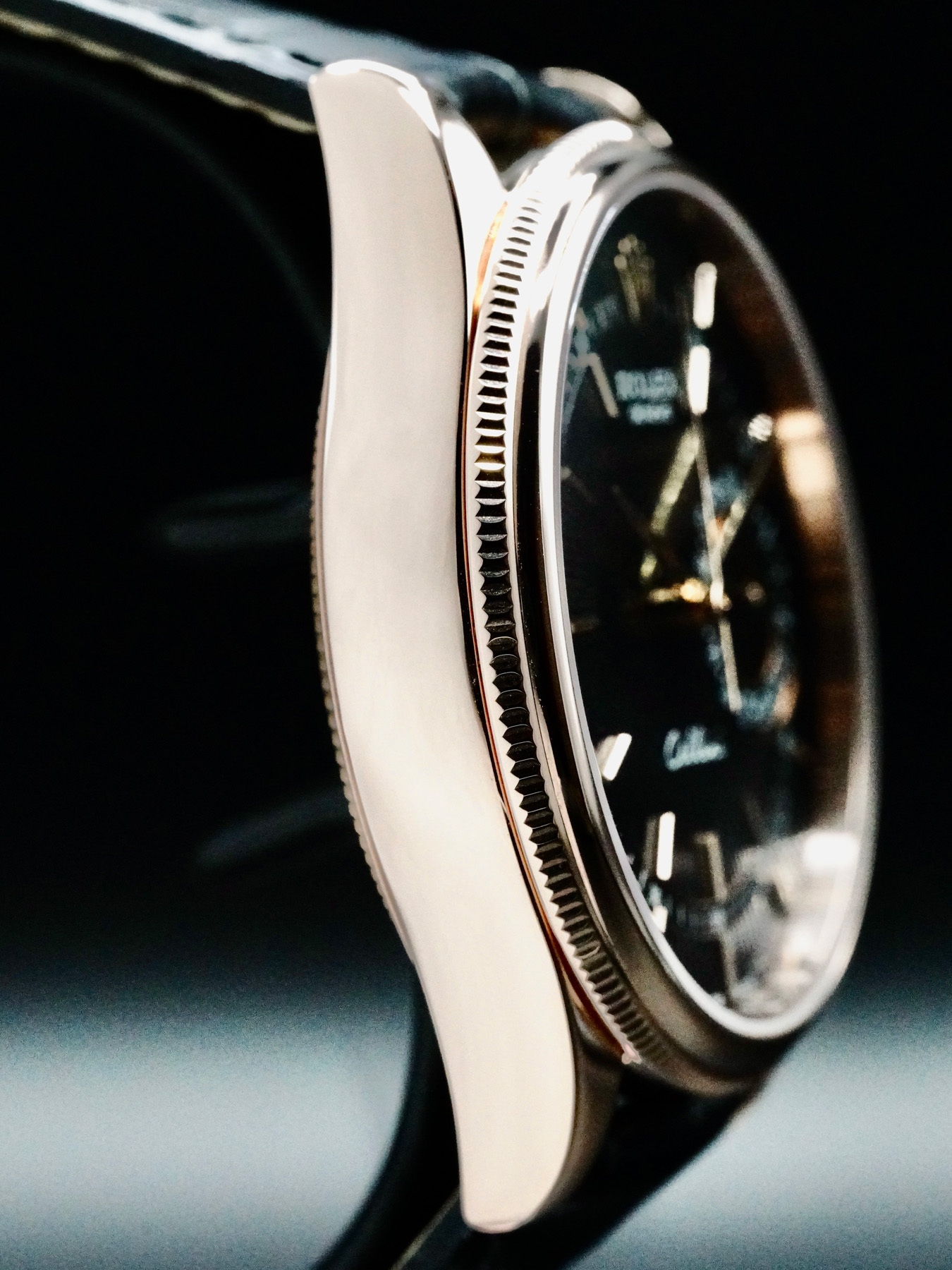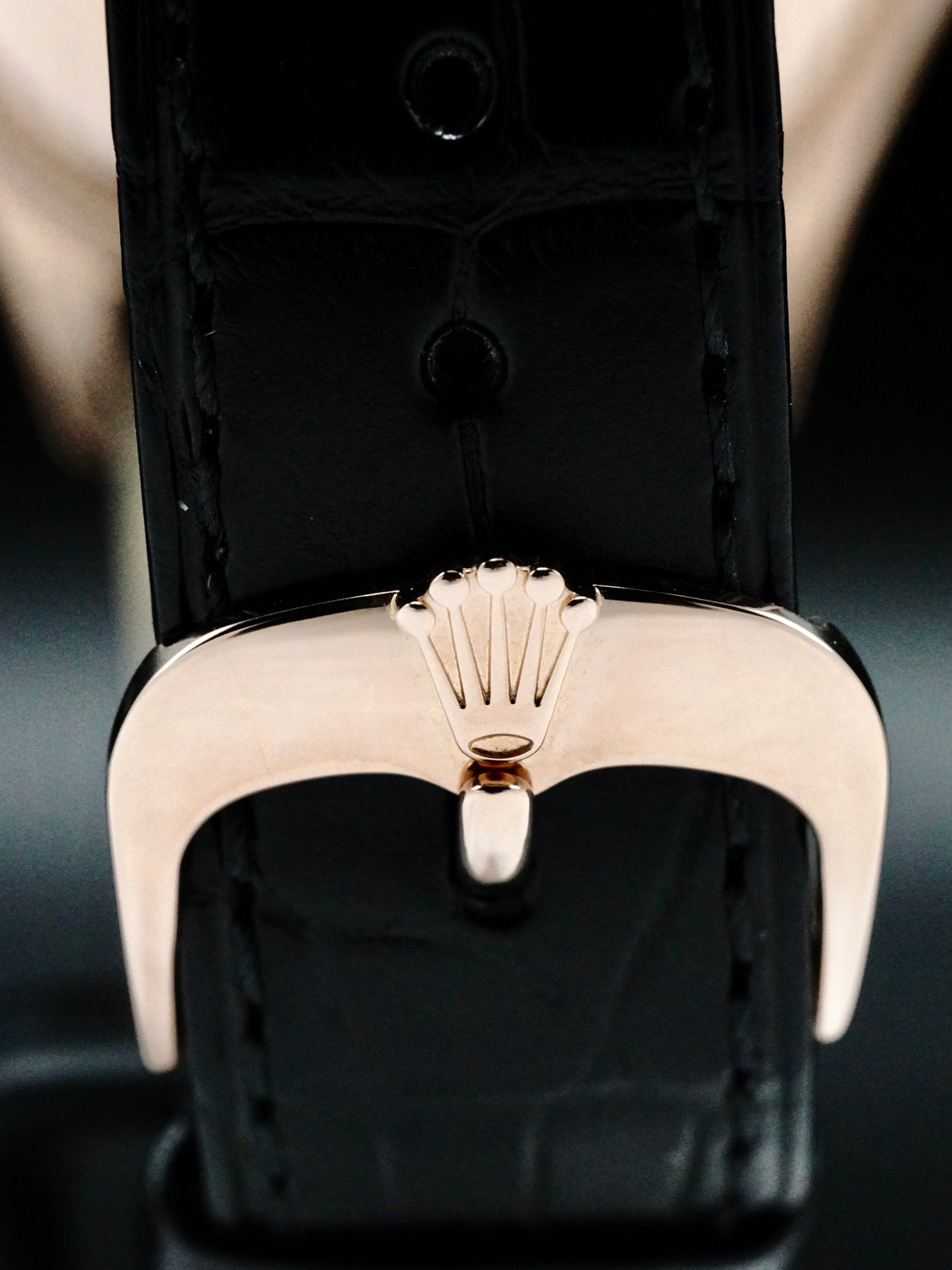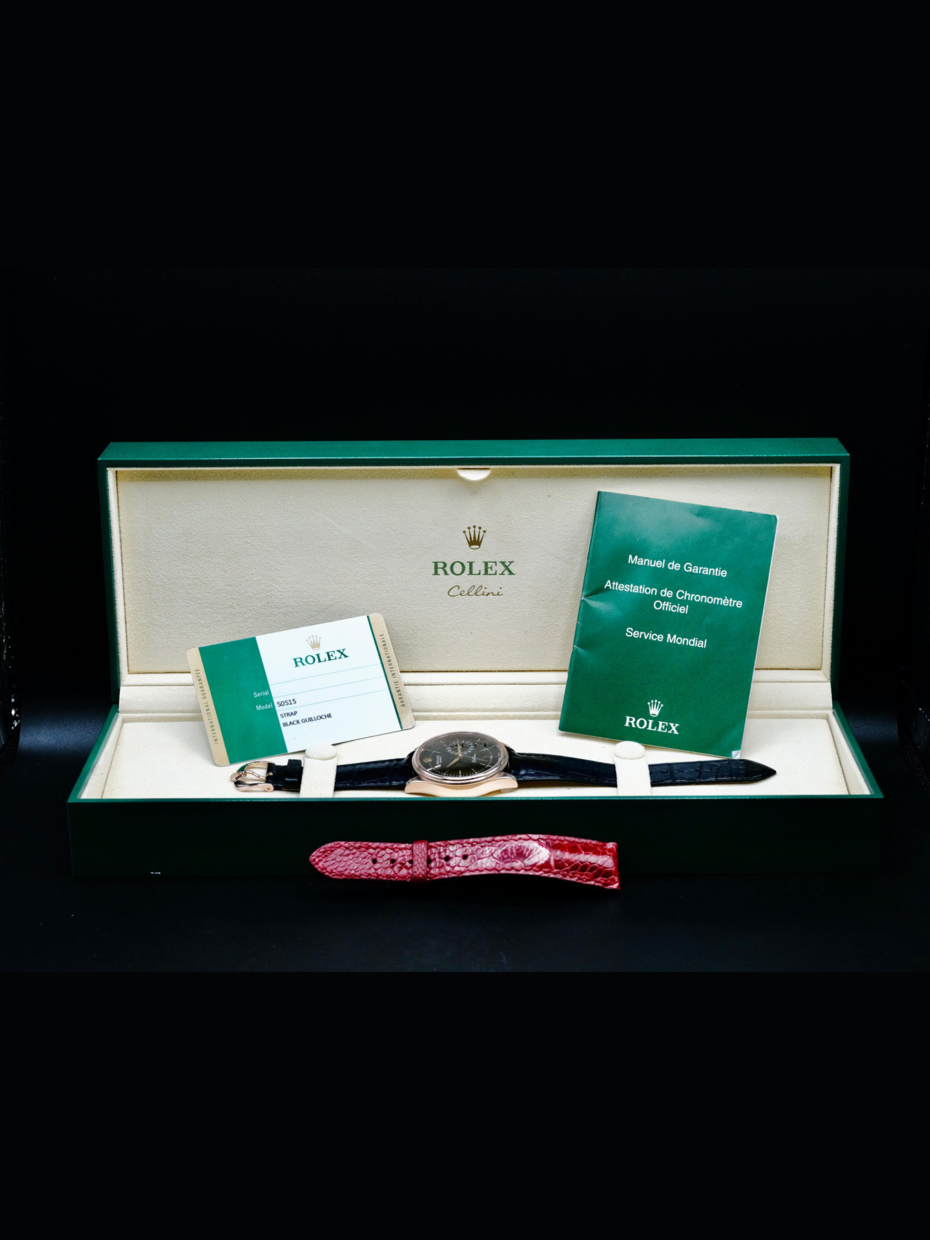 This Rolex 50515 Cellini is in EXCELLENT condition. This watch includes original box, papers and warranty card dated 2015. Extra burgundy leather strap. This Rolex watch has been fully authenticated and certified by a 3rd party organization. You’ll receive the certificate of authenticity with your purchase.