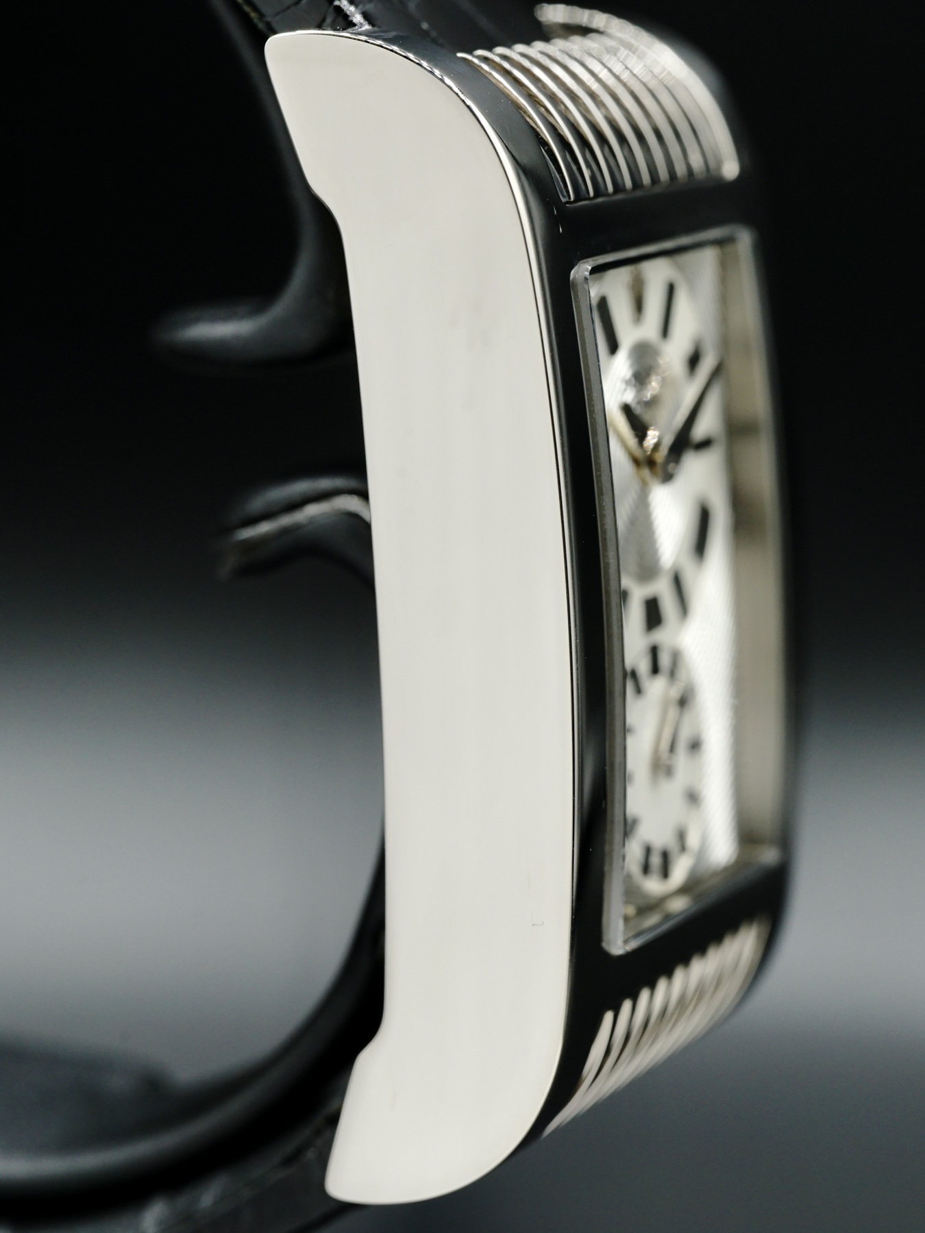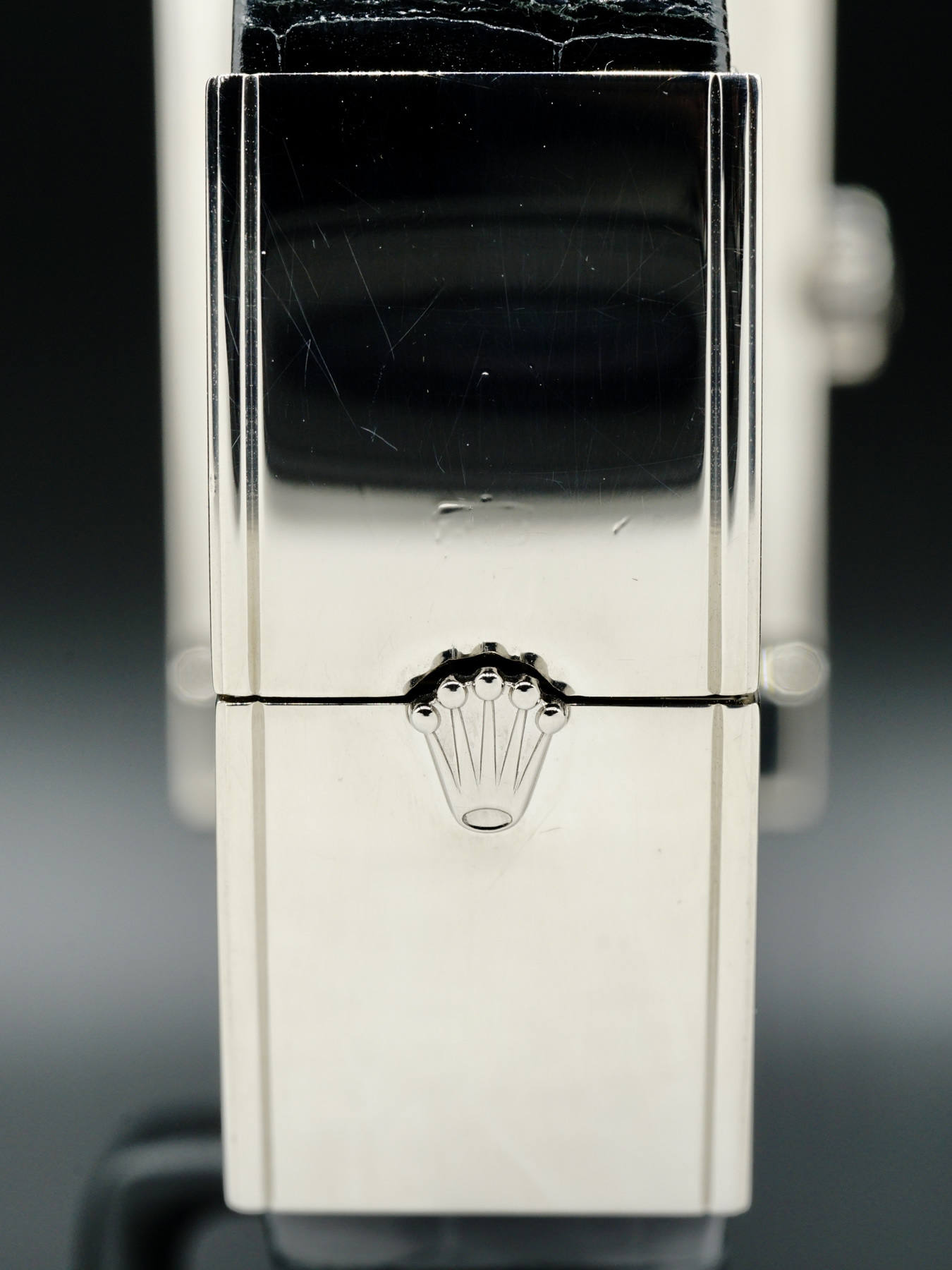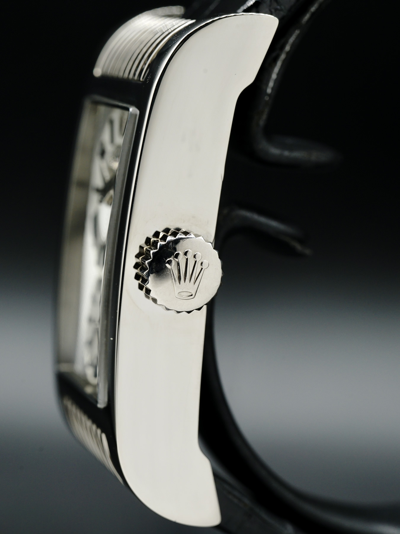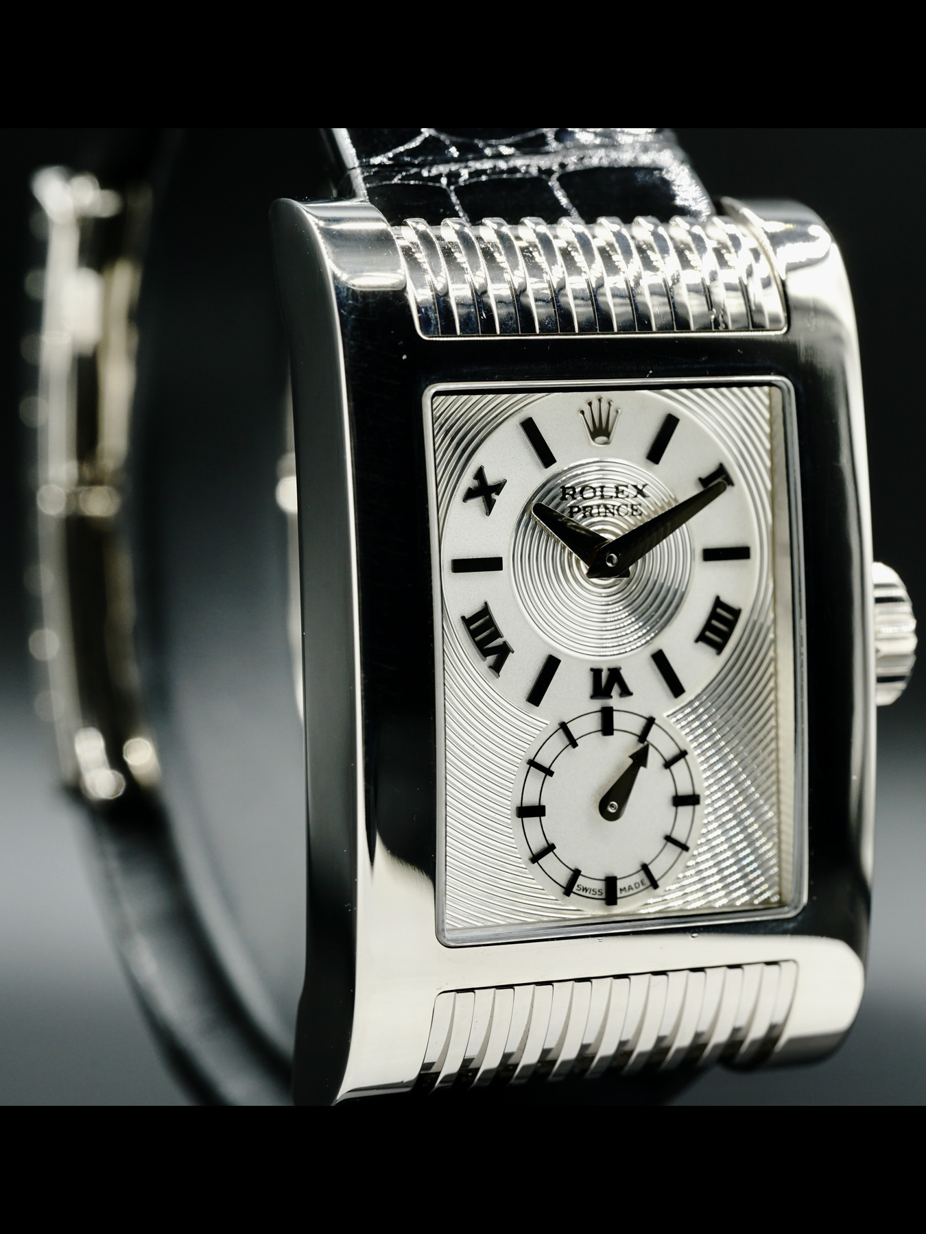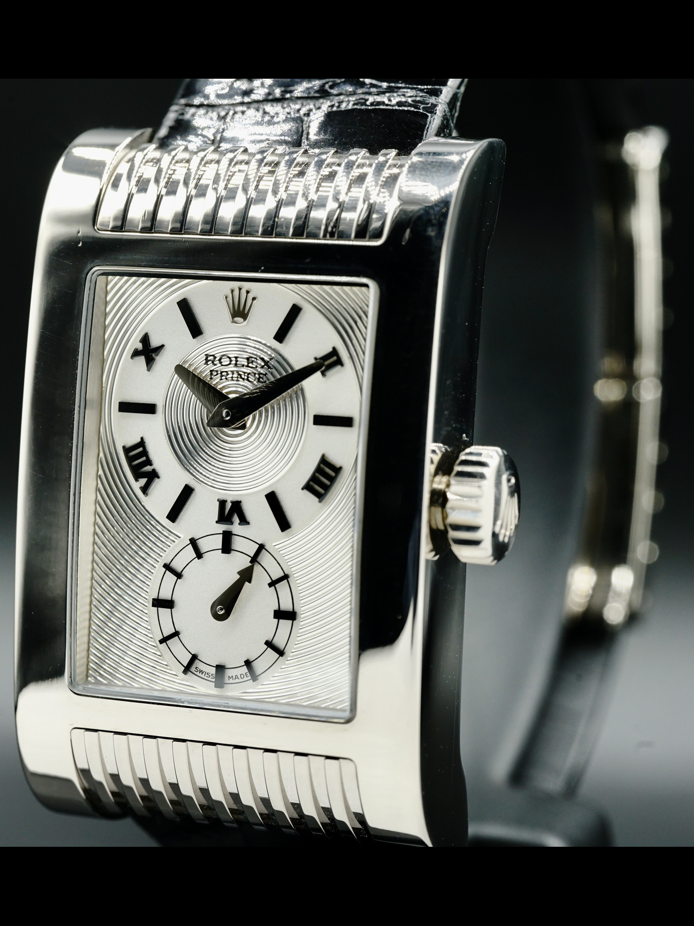 This Rolex Cellini Prince features a 27 x 42mm 18k white gold rectangular case and a transparent sapphire case back on a black leather strap with an 18k white gold Rolex clasp. This watch also sports a silver concentric dial with black roman numeral hour markers and a small sub-dial covered by scratch resistant sapphire crystal.