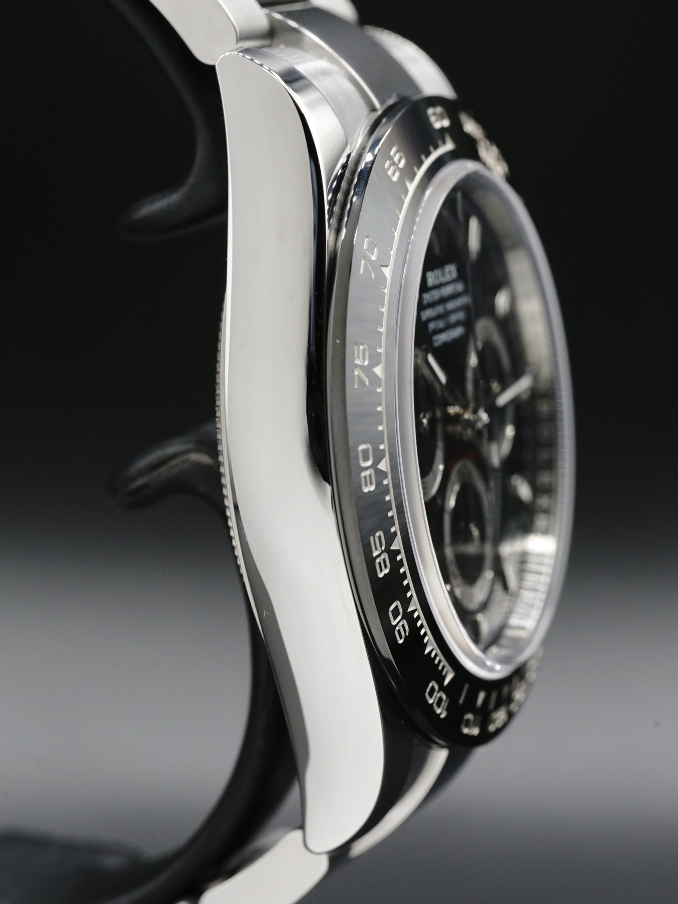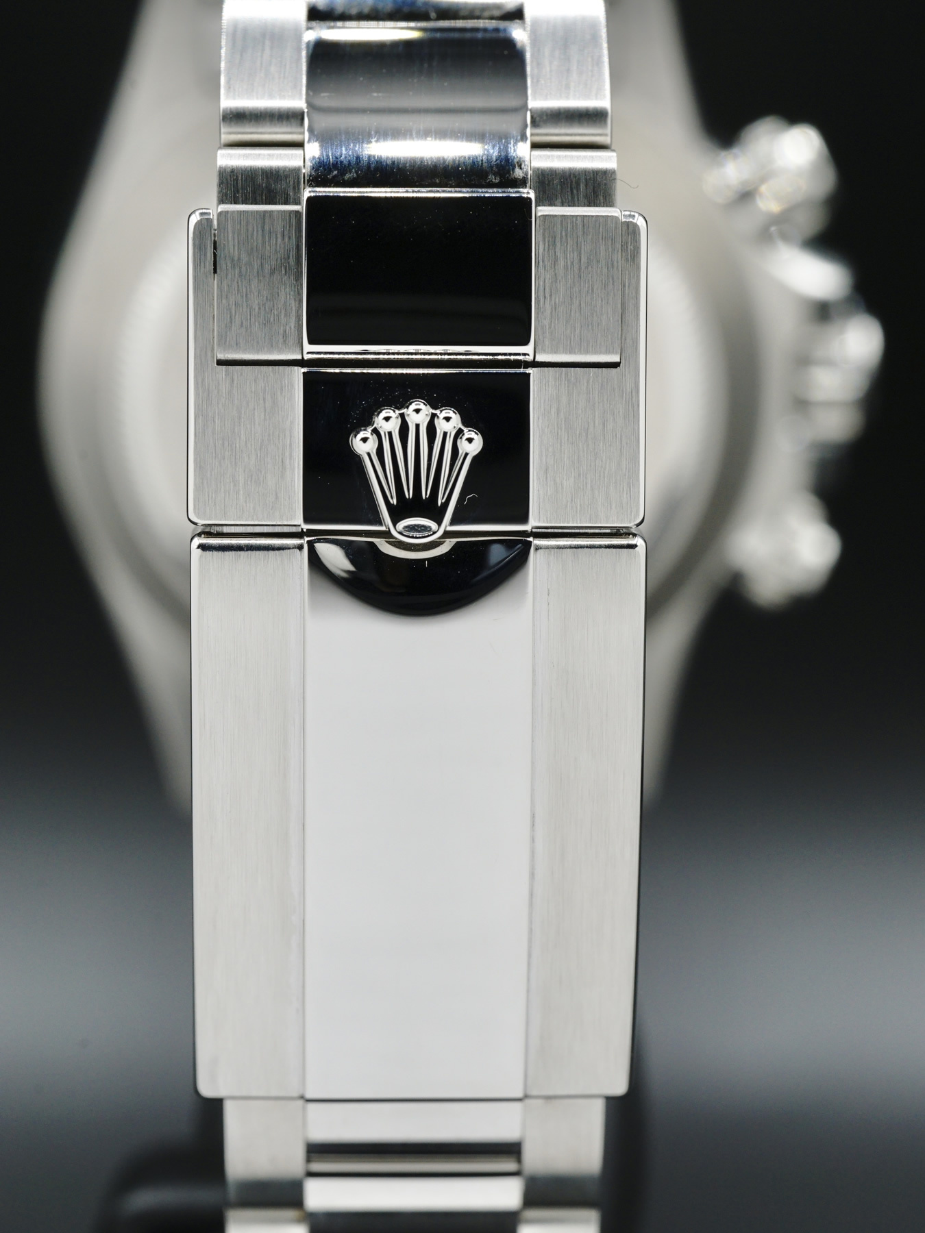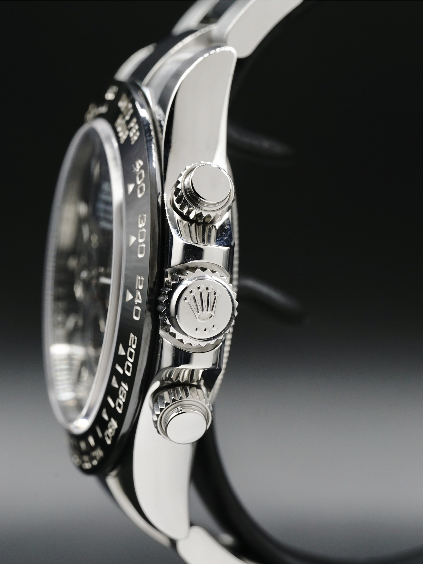 This Rolex Daytona features a 40mm oystersteel case with a black monobloc cerachrom bezel. This watch also sports a black dial and highly legible chromalight display with long-lasting blue luminescence covered by scratch-resistant sapphire crystal.