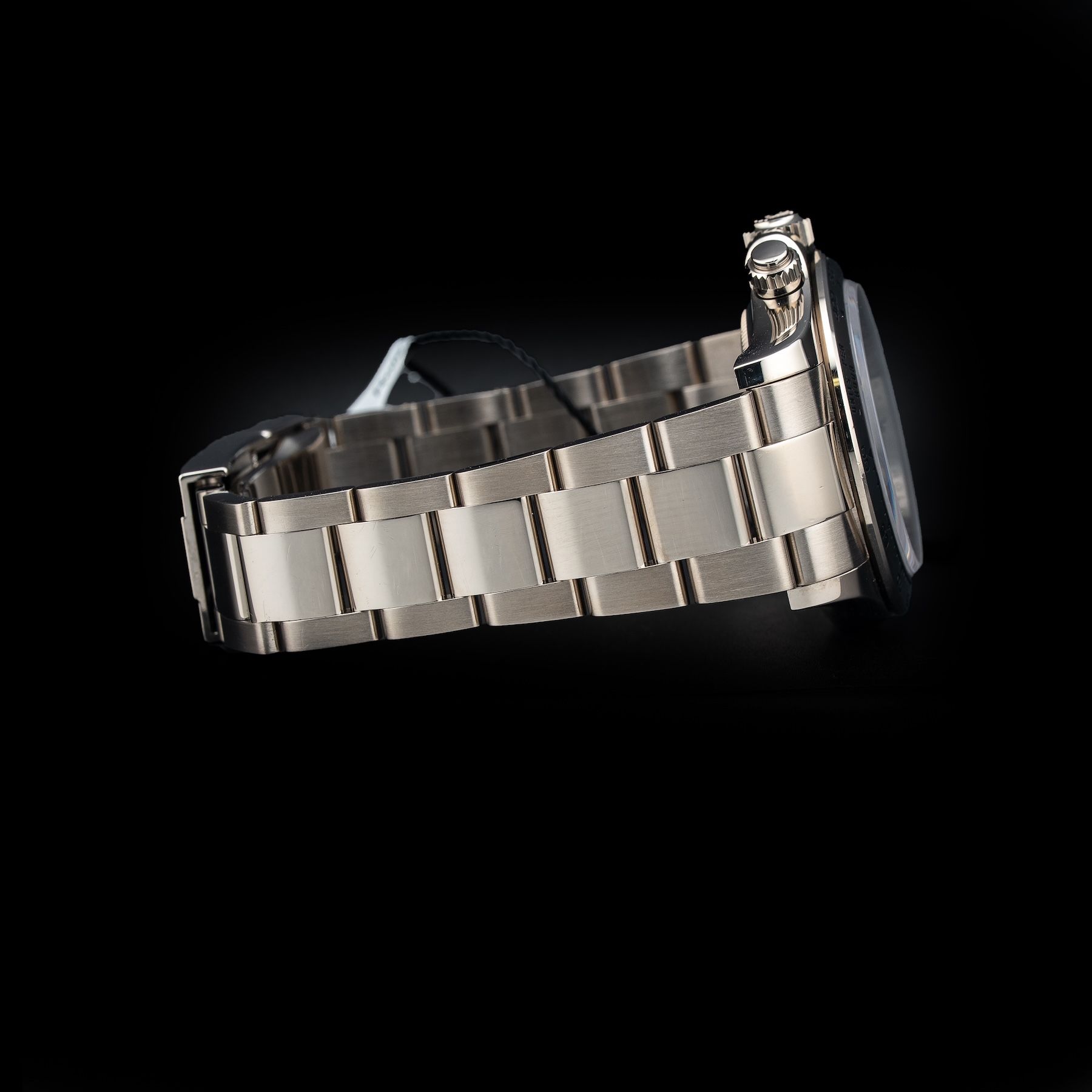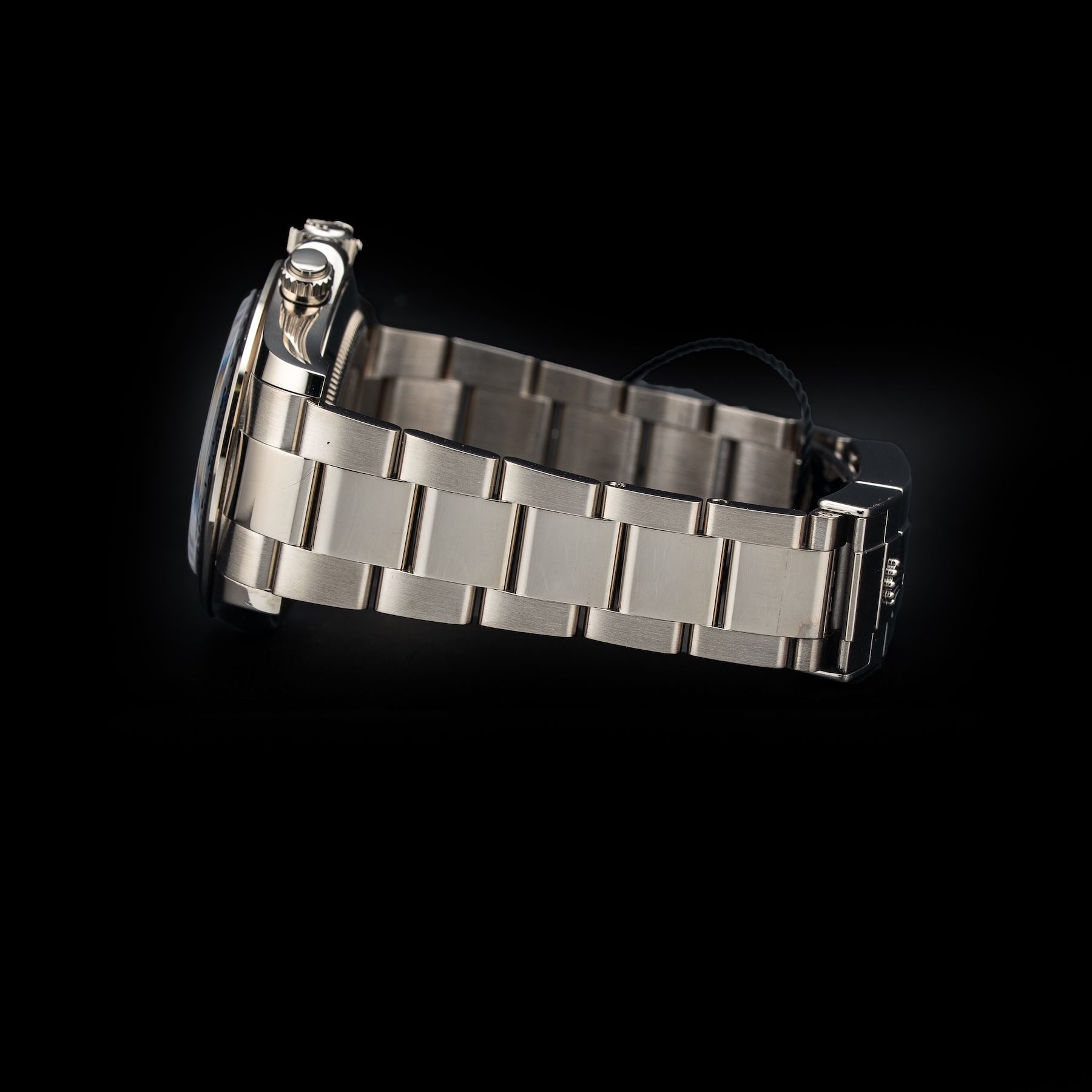 This watch features a 40mm 18 kt white gold case on 18k white gold bracelet. This watch also sports a black dial. Powered by a perpetual, mechanical chronograph, self-winding movement. Water resistance up to 100 meters.