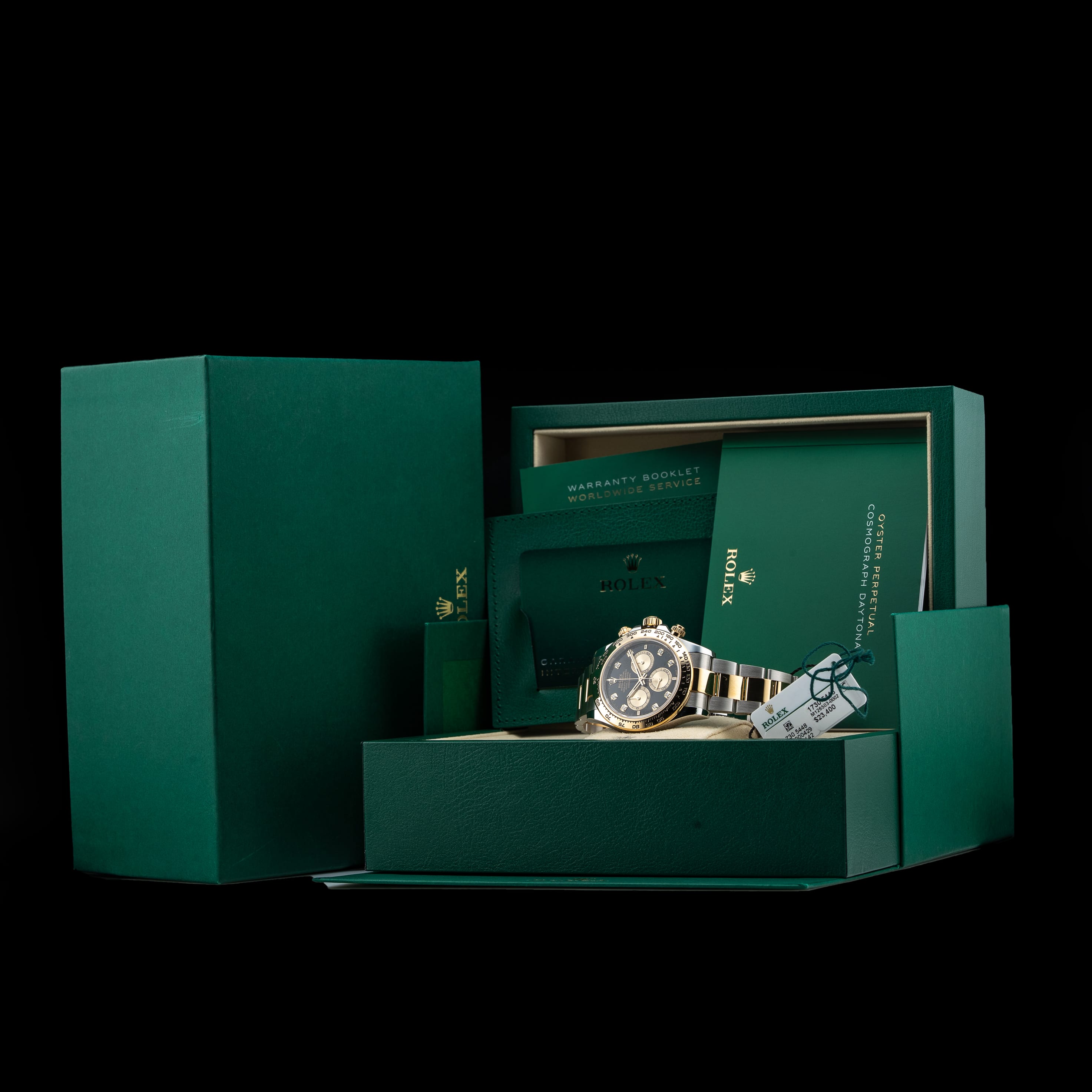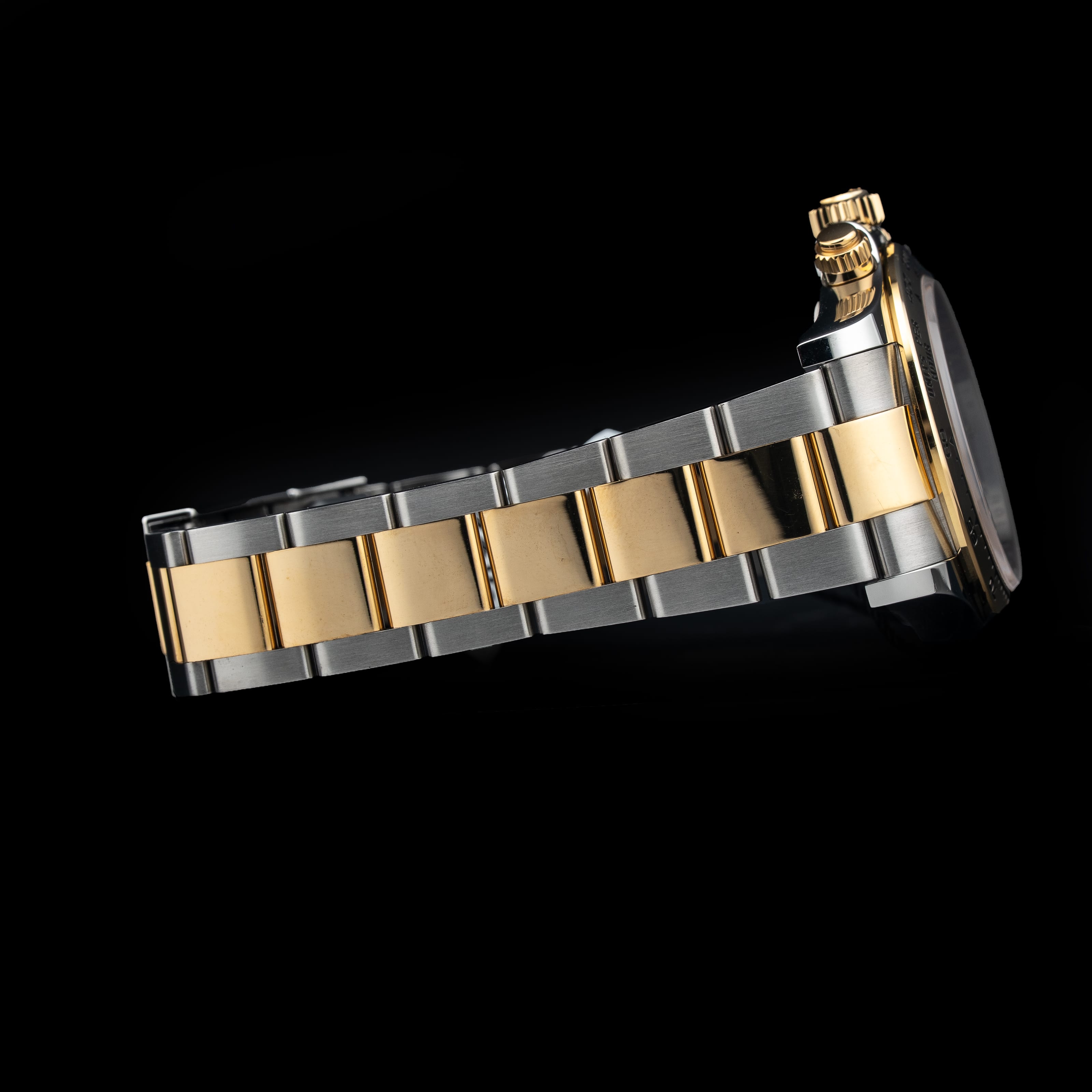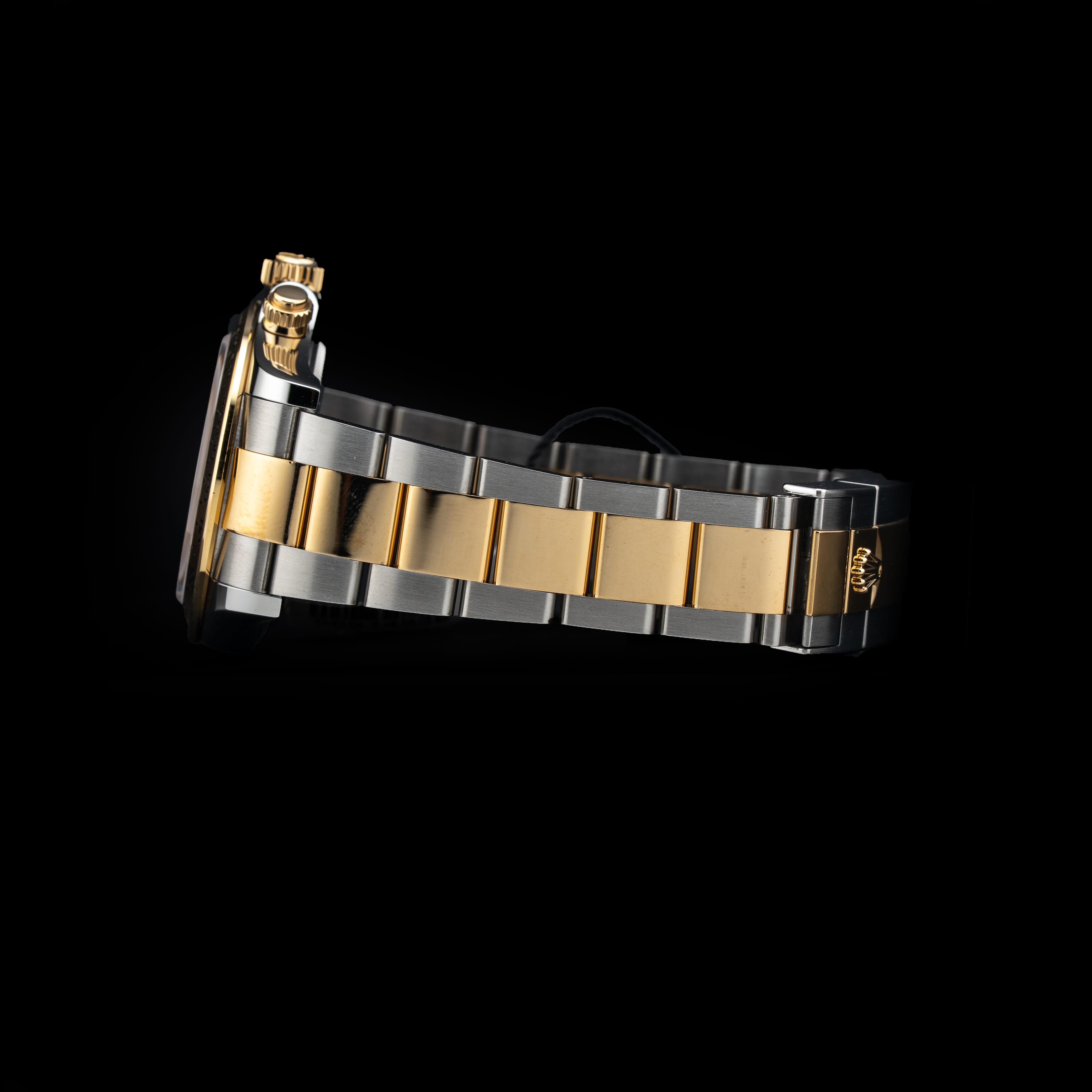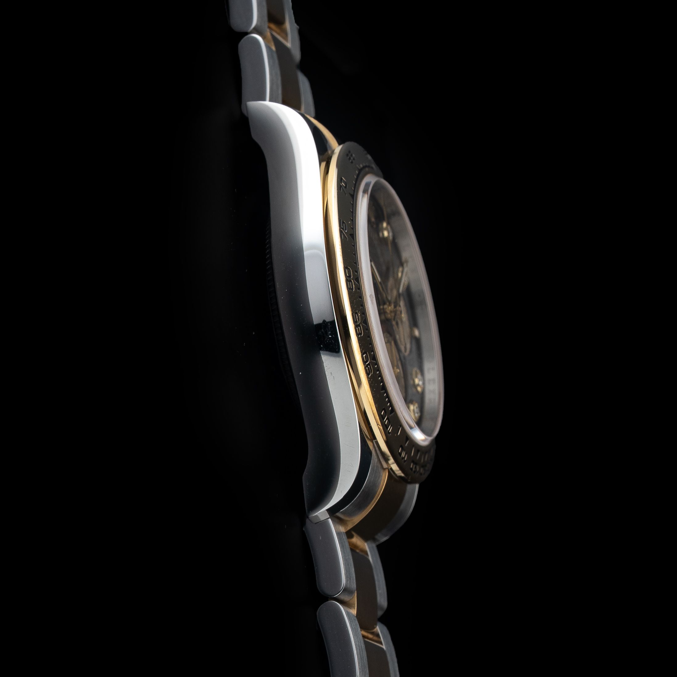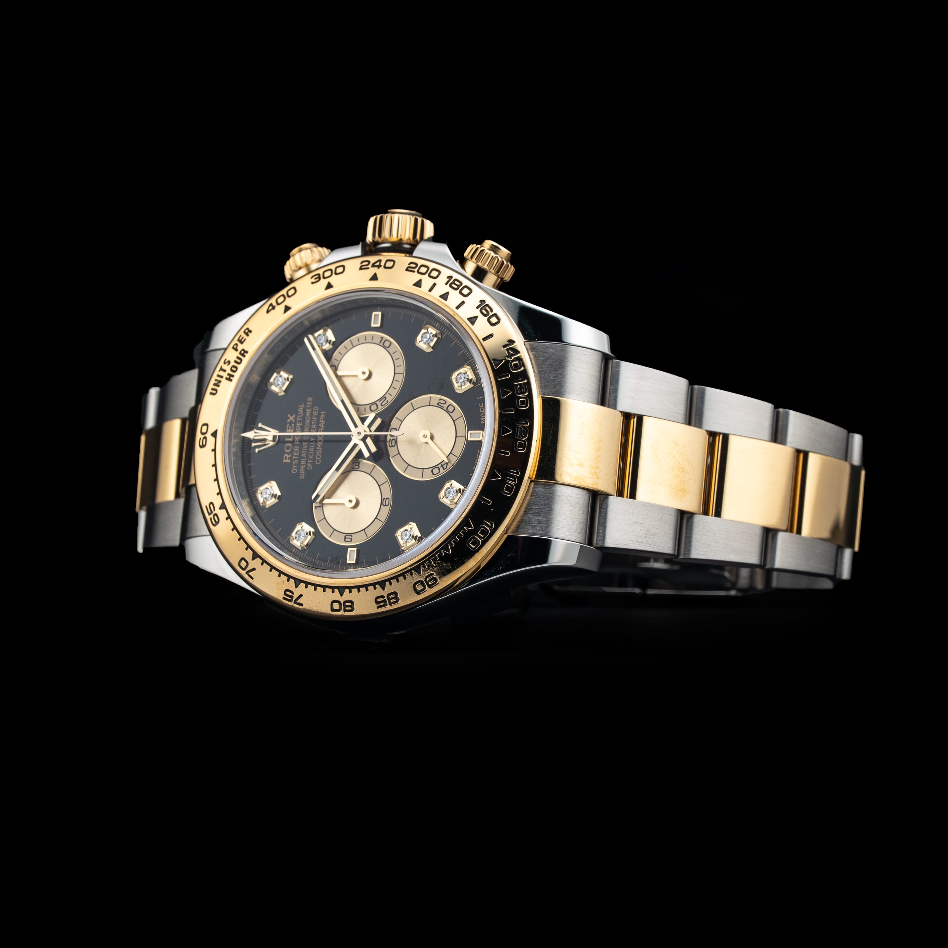 This watch features a 40mm oystersteel and yellow gold case on oystersteel and yellow gold bracelet. This watch also sports a black dial. Powered by a perpetual, mechanical chronograph, self-winding movement. Water resistance up to 100 meters.