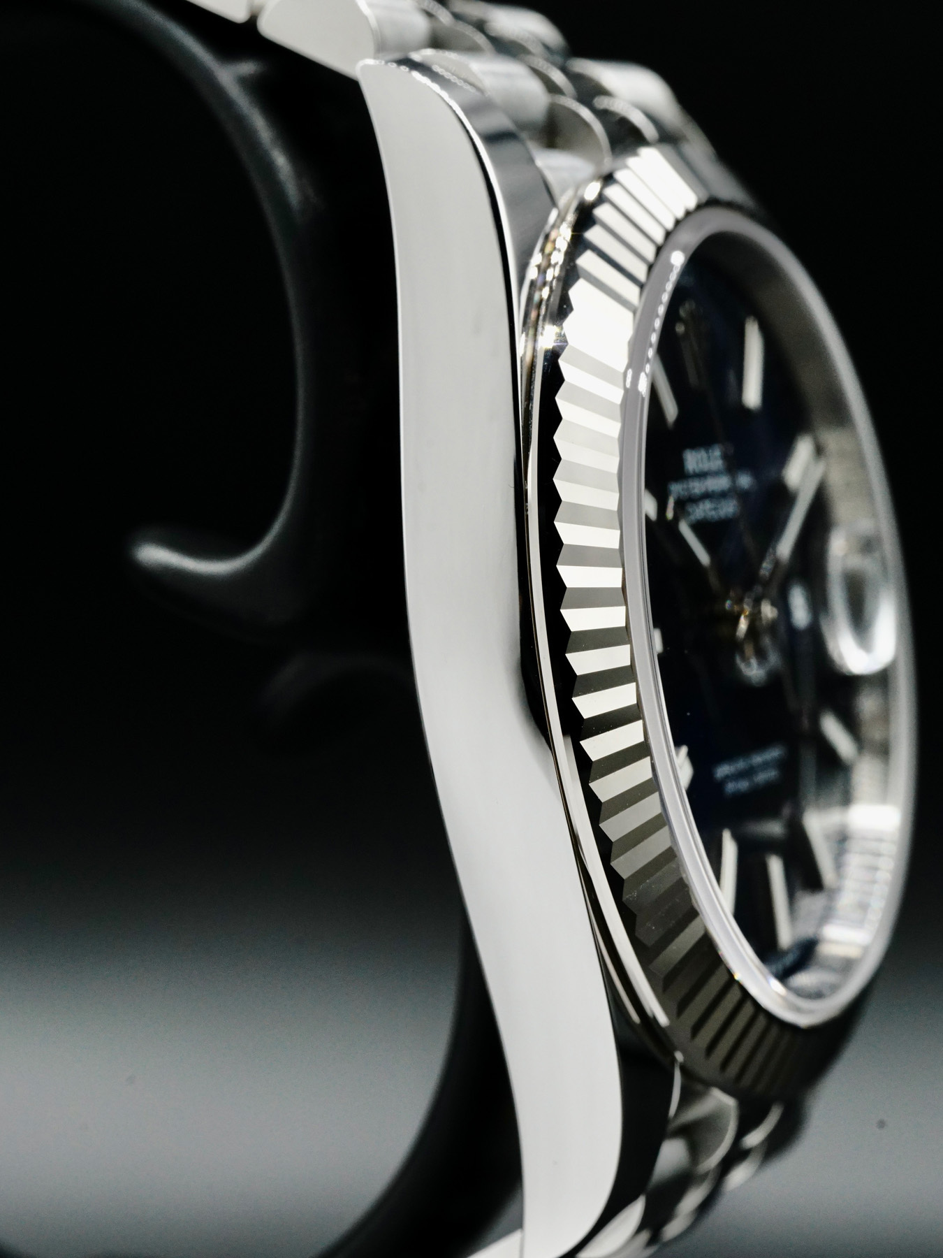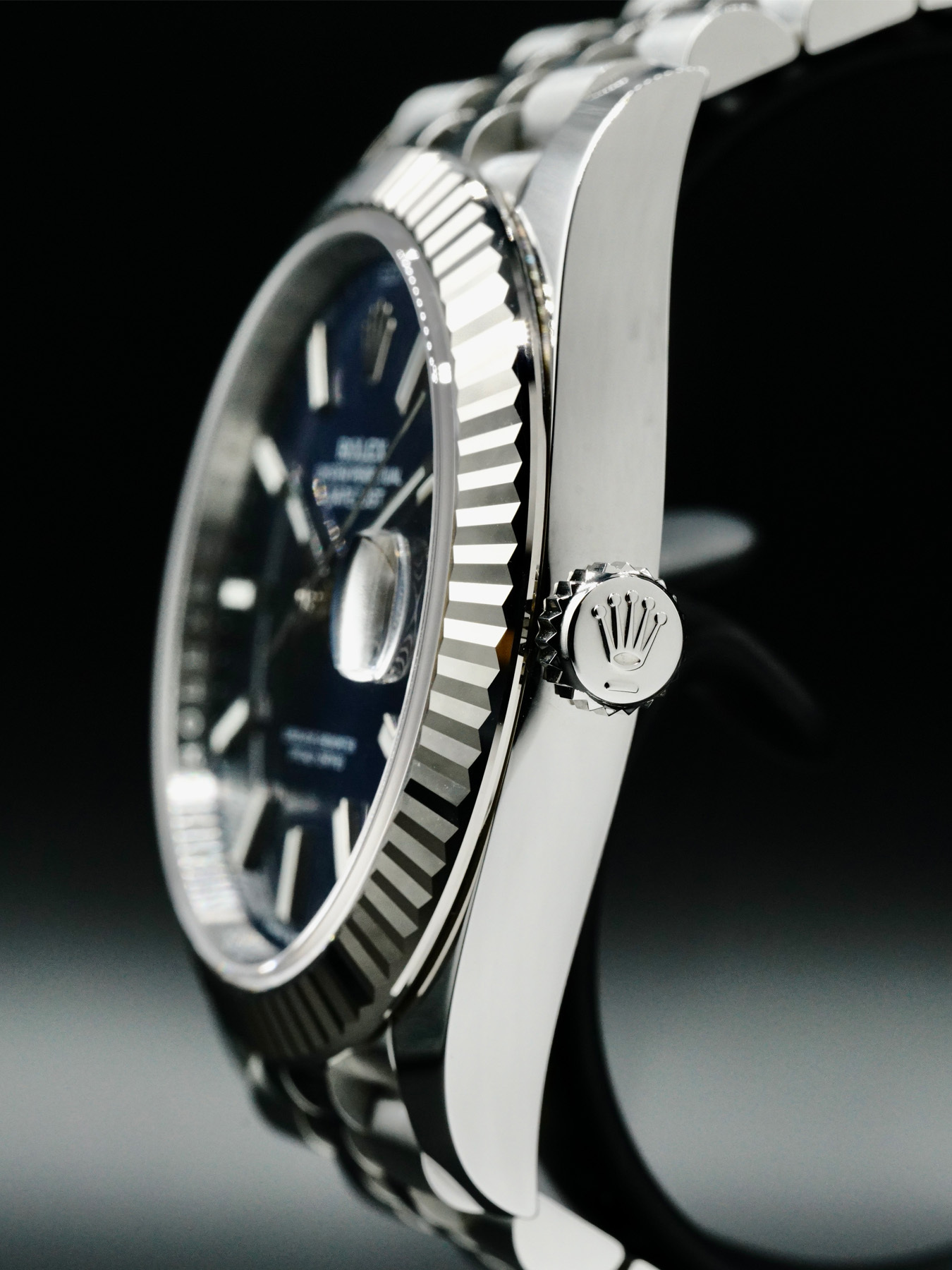 This Rolex Datejust features a 41mm stainless steel and white gold (White Rolesor) case with a fluted bezel and solid caseback on a stainless steel bracelet. This watch also showcases a bright blue dial with a highly legible chromalight display and long-lasting blue luminescence covered by scratch resistant sapphire crystal.