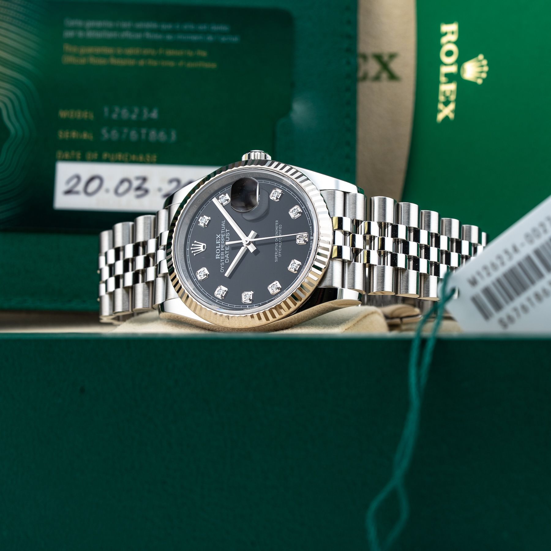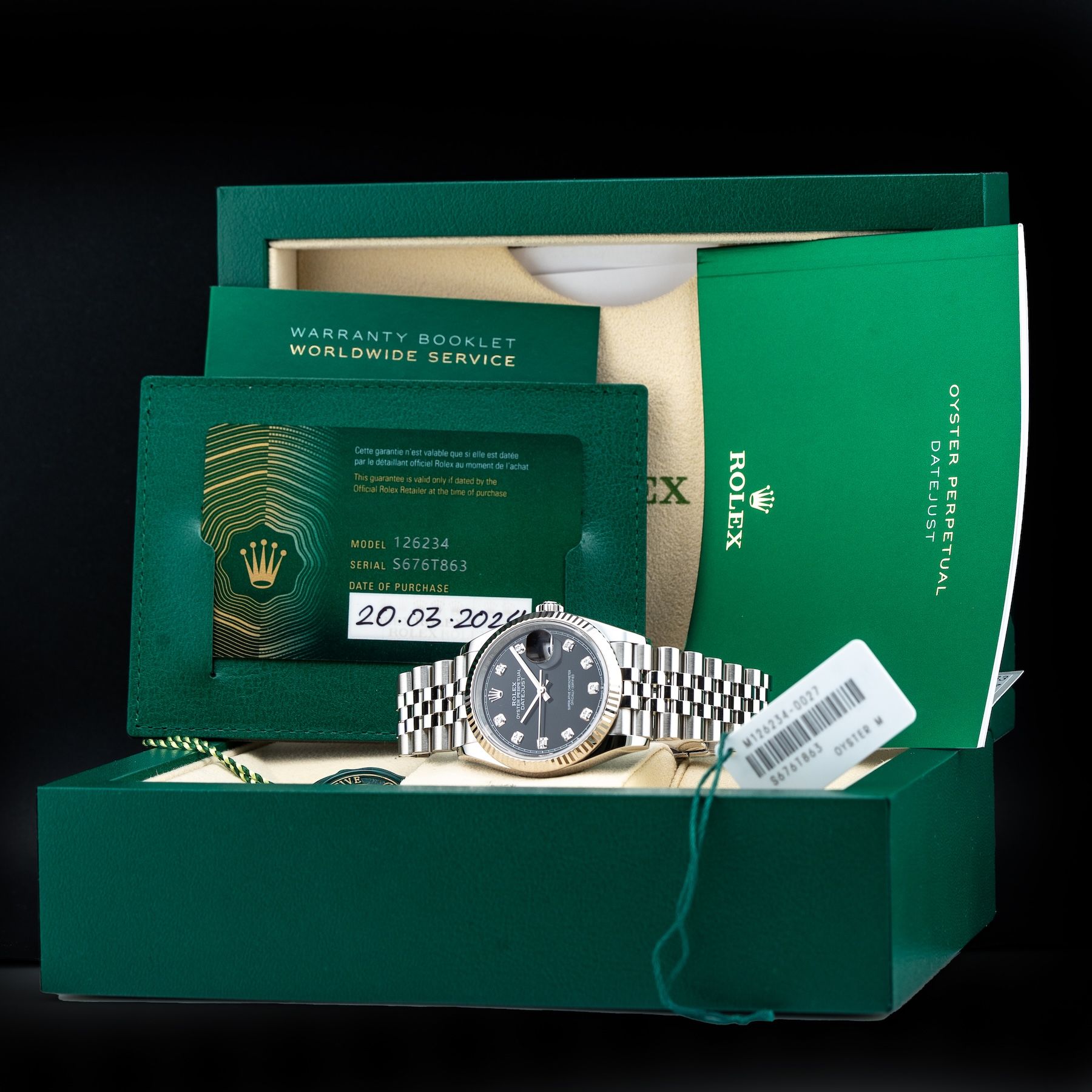 This Rolex Datejust 36 126234-0027 Oyster Perpetual is in GREAT condition, it has box, papers and warranty card dated 03/20/2024. This watch has been fully authenticated and certified by a 3rd party organization. You’ll receive the certificate of authenticity with your purchase. Please note, the photos shown are of the actual watch you will receive.