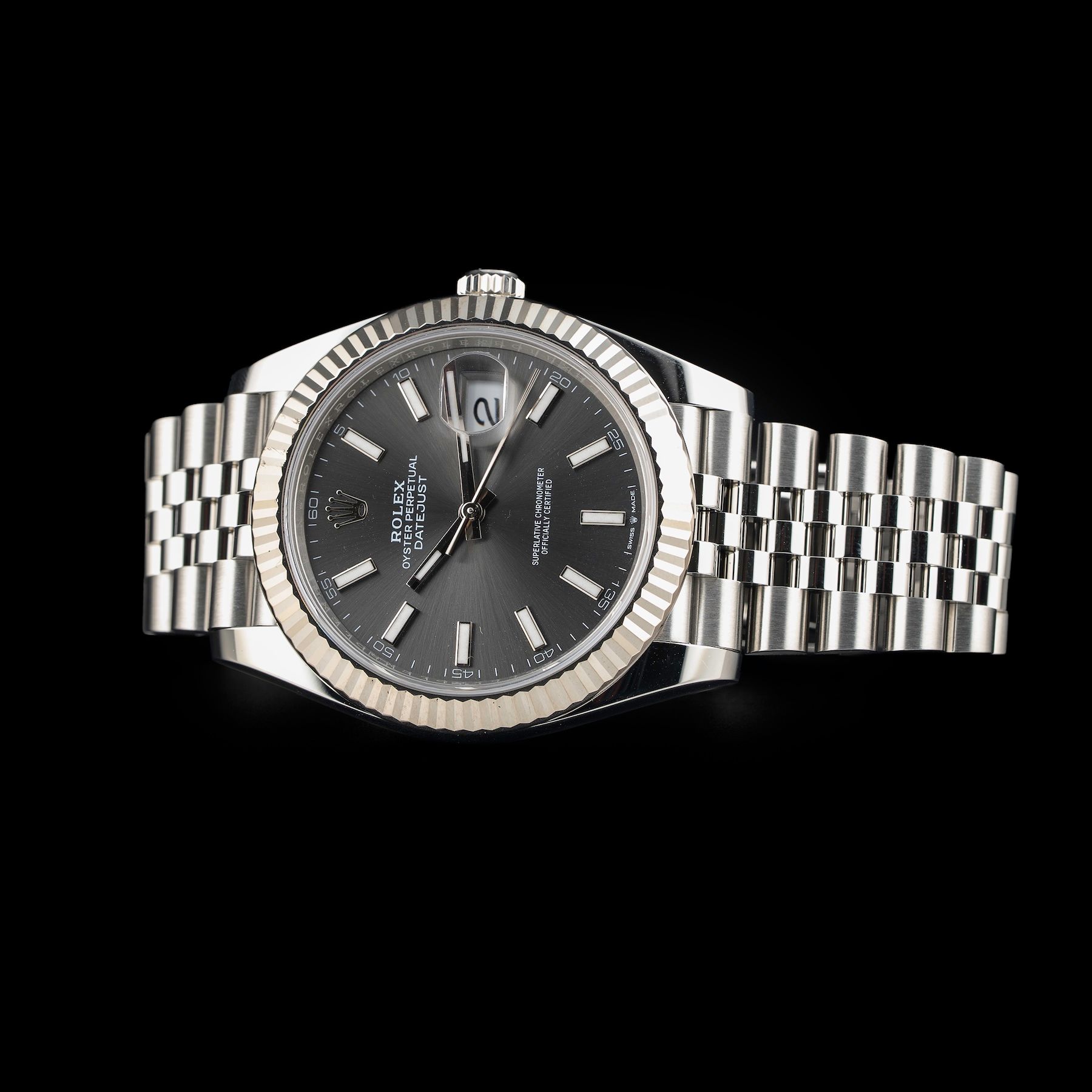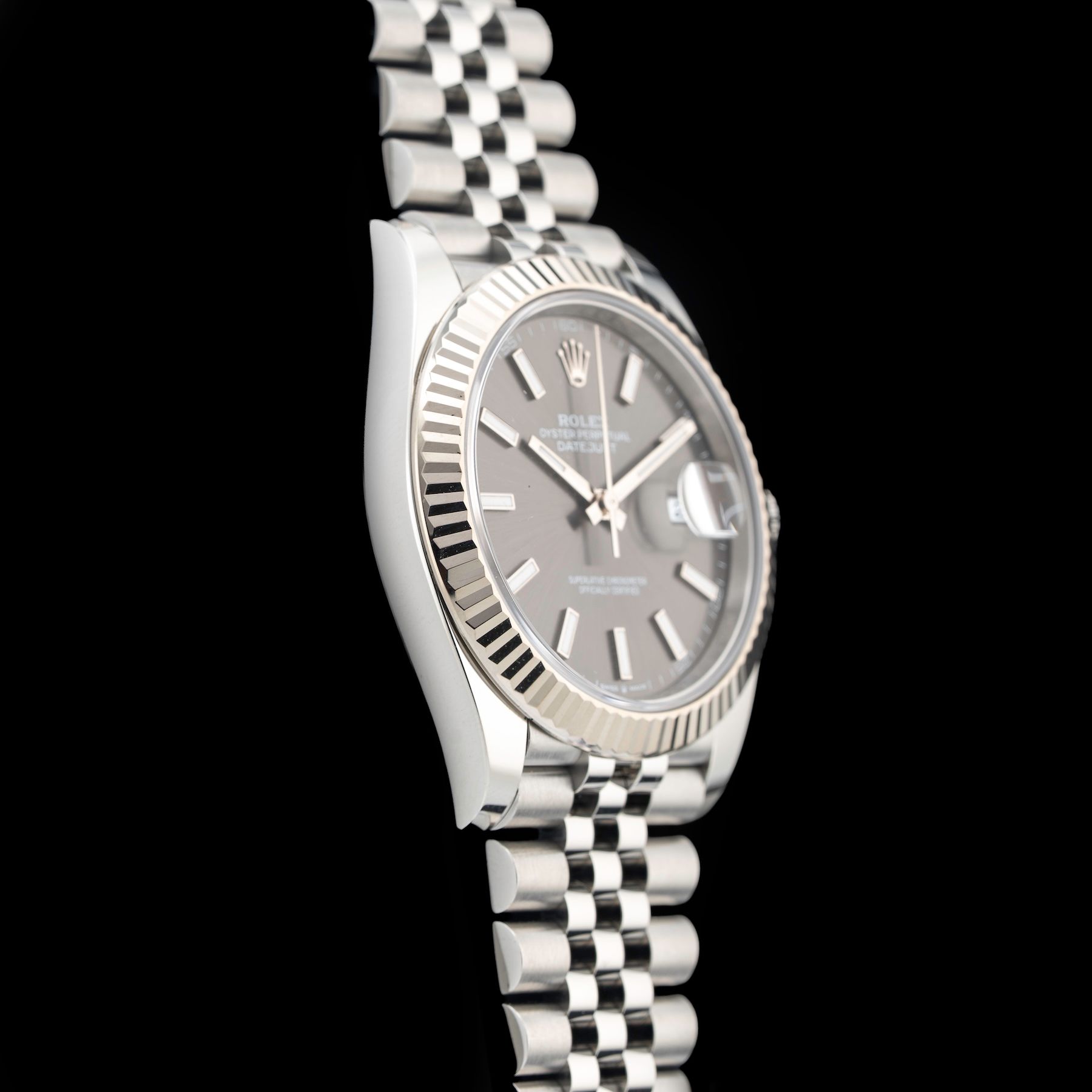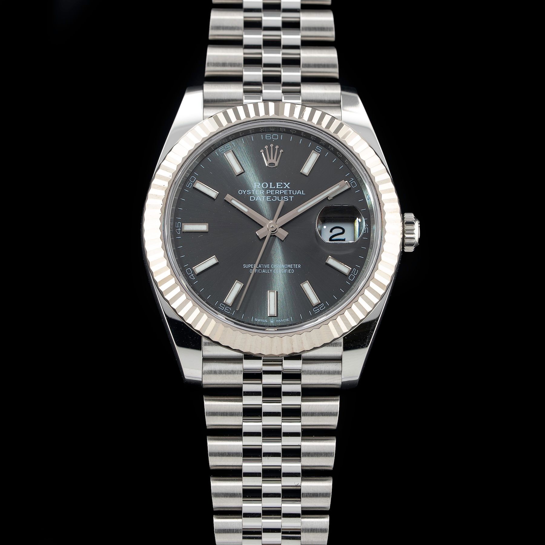 This watch features a 41mm oystersteel and white gold case on steel bracelet. This watch also sports a slate dial. Powered by a perpetual, mechanical, self-winding movement. Water resistance up to 100 meters.