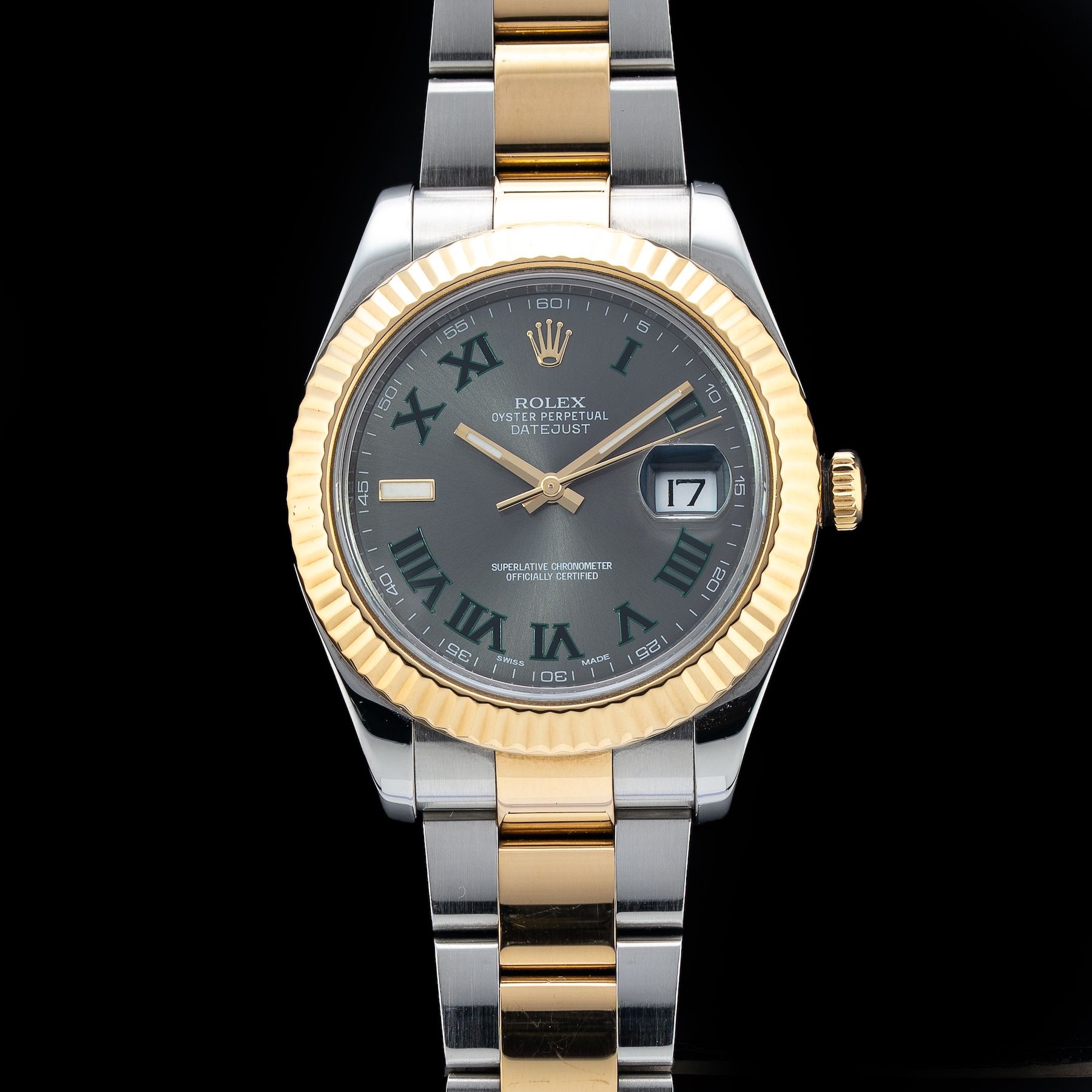 This watch features a 41mm gold/steel case on gold/steel bracelet. This watch also sports a slate dial. Powered by an automatic movement. Water resistance up to 100 meters.