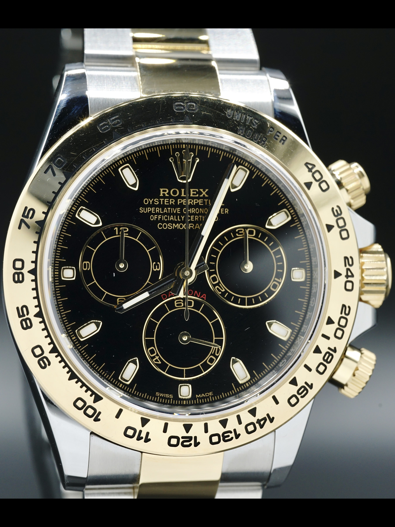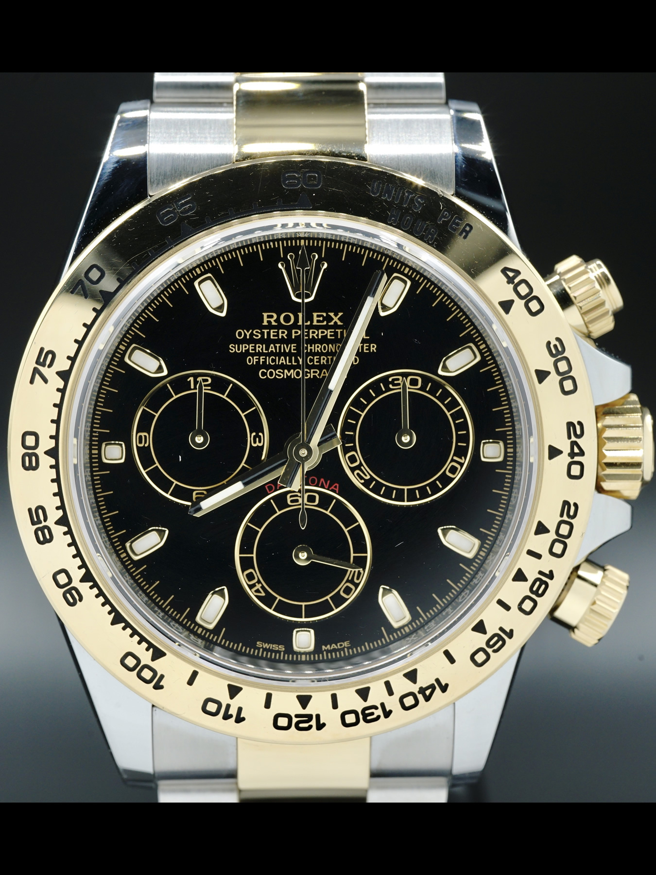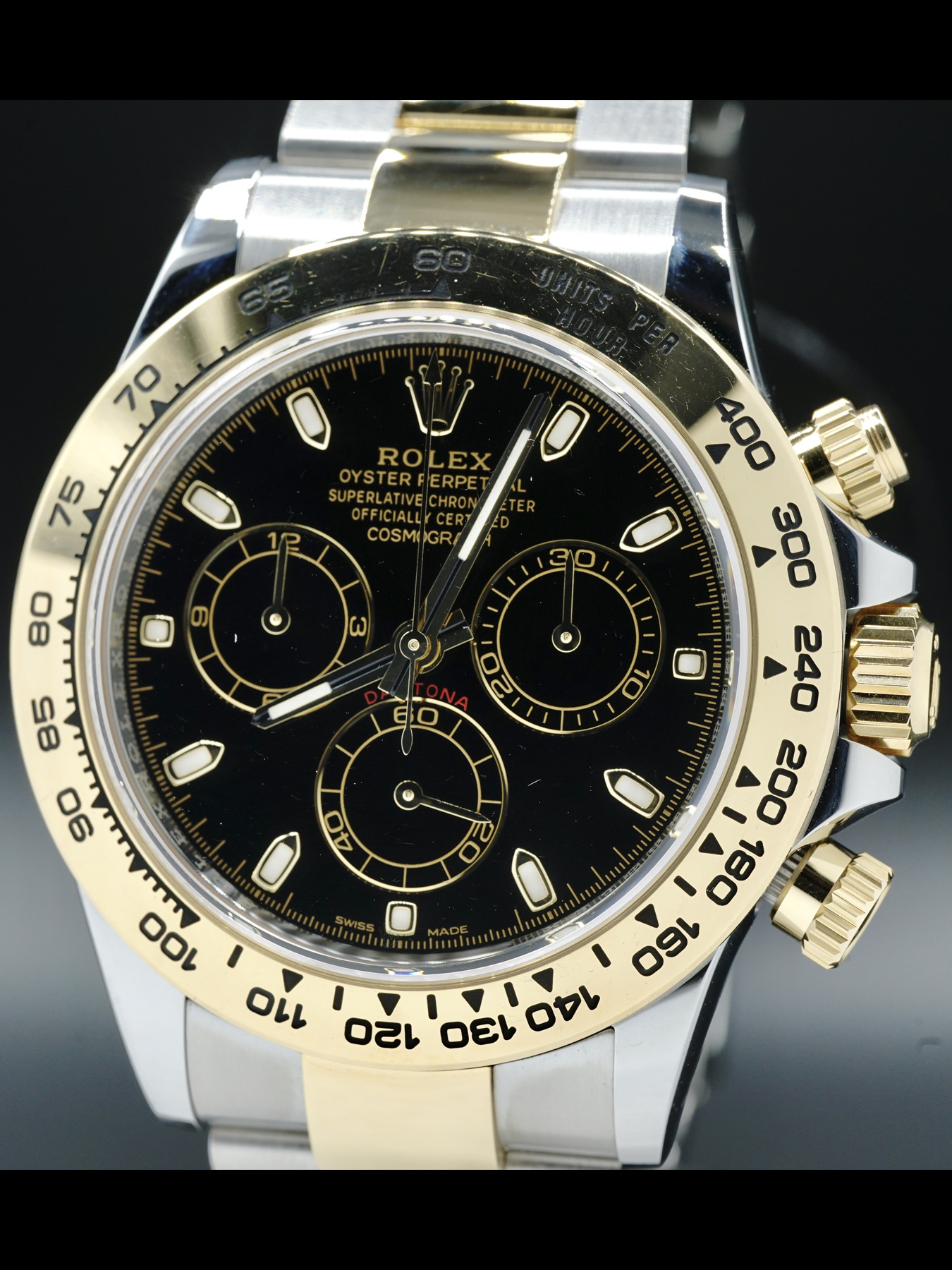 This Rolex Cosmograph Daytona features a 40mm oystersteel and yellow gold case on a yellow rolesor bracelet. This watch also showcases a black dial covered by scratch-resistant sapphire crystal.