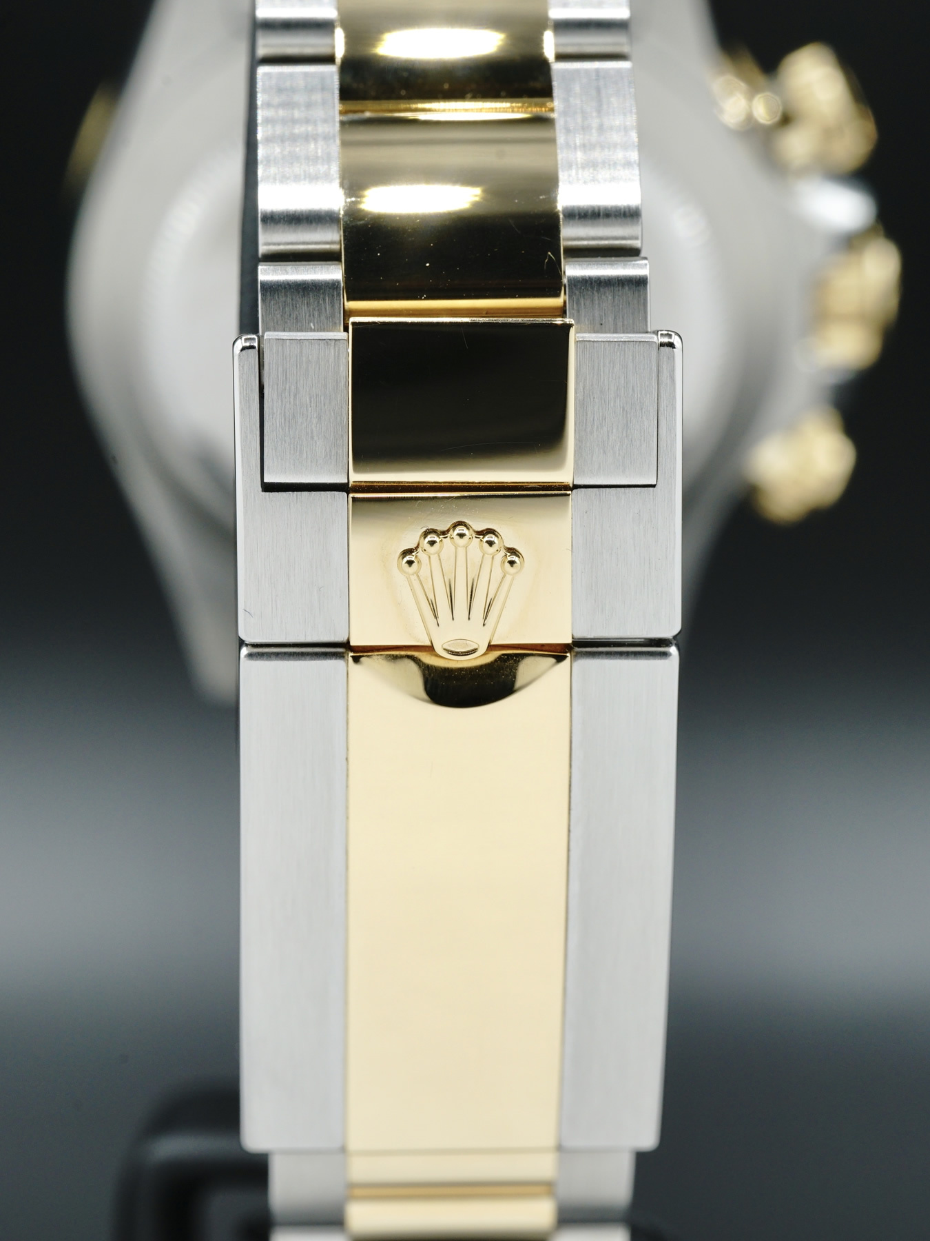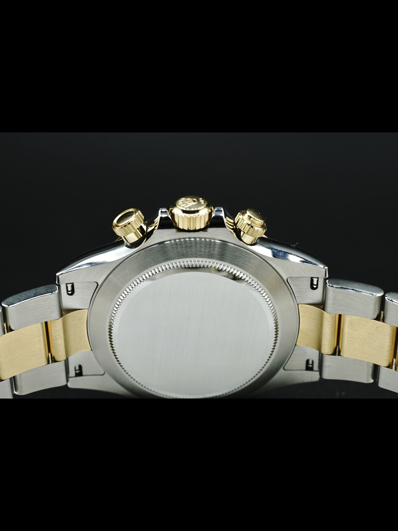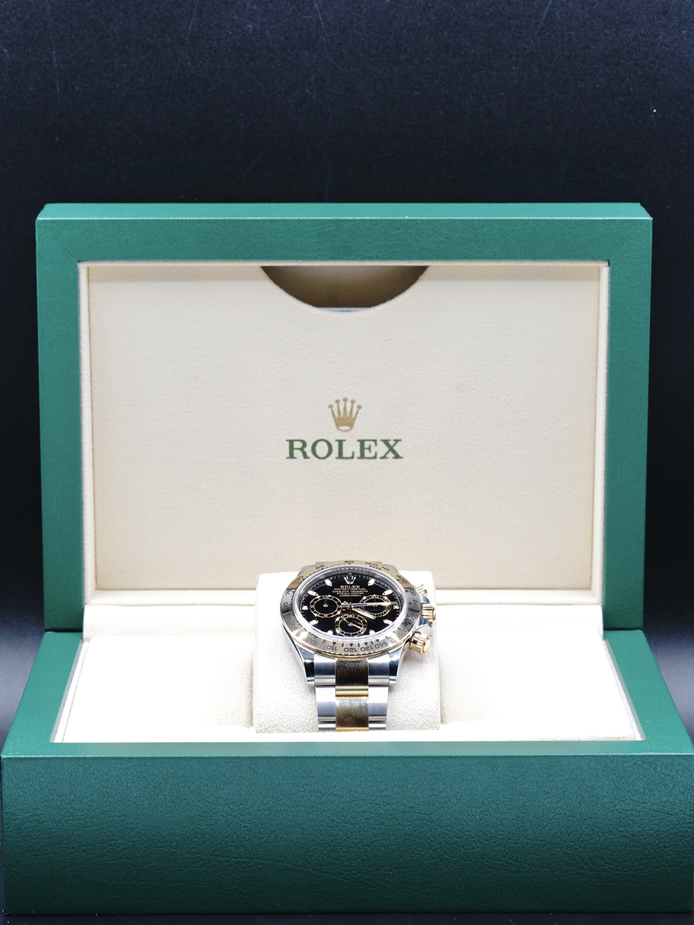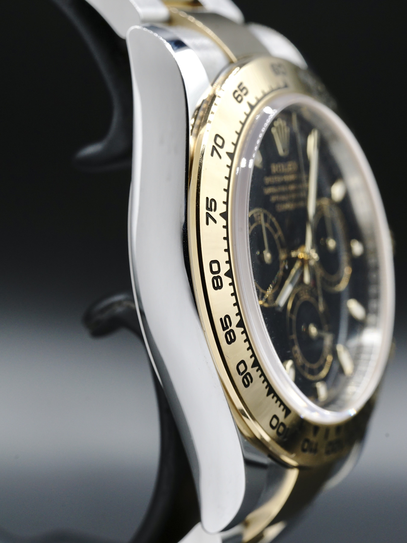This Rolex Cosmograph Daytona features a 40mm oystersteel and yellow gold case on a yellow rolesor bracelet. This watch also showcases a black dial covered by scratch-resistant sapphire crystal.