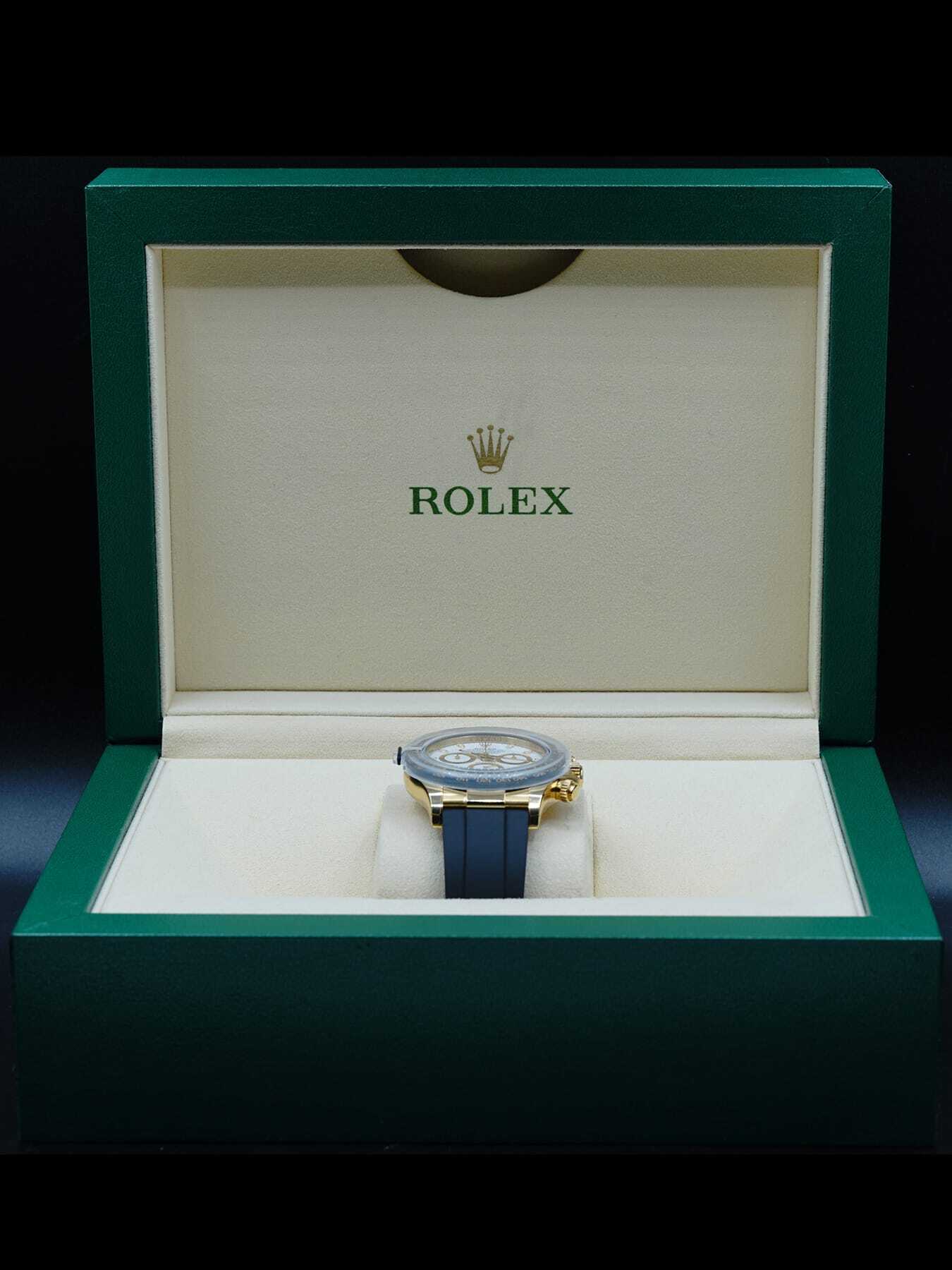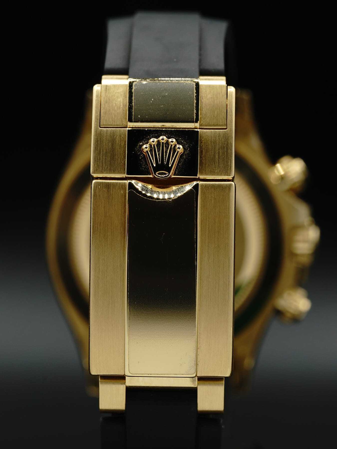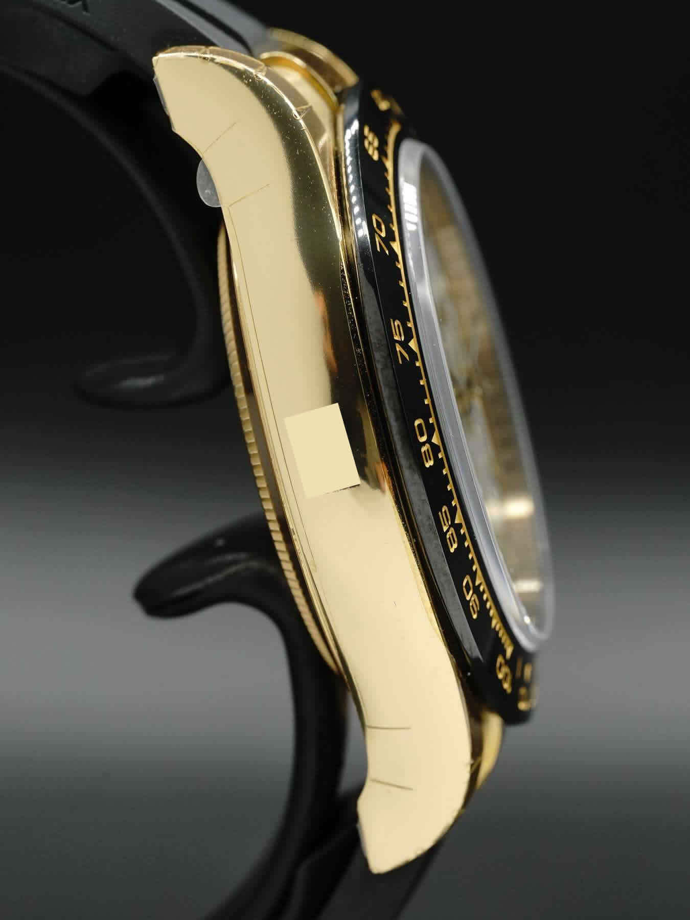 This Rolex Oyster Perpetual Cosmograph Daytona in 18k ct yellow gold is in EXCELLENT condition. This watch features a golden and black dial and an Oysterflex bracelet as well as a Black Cerachrom bezel with tachymetric scale.