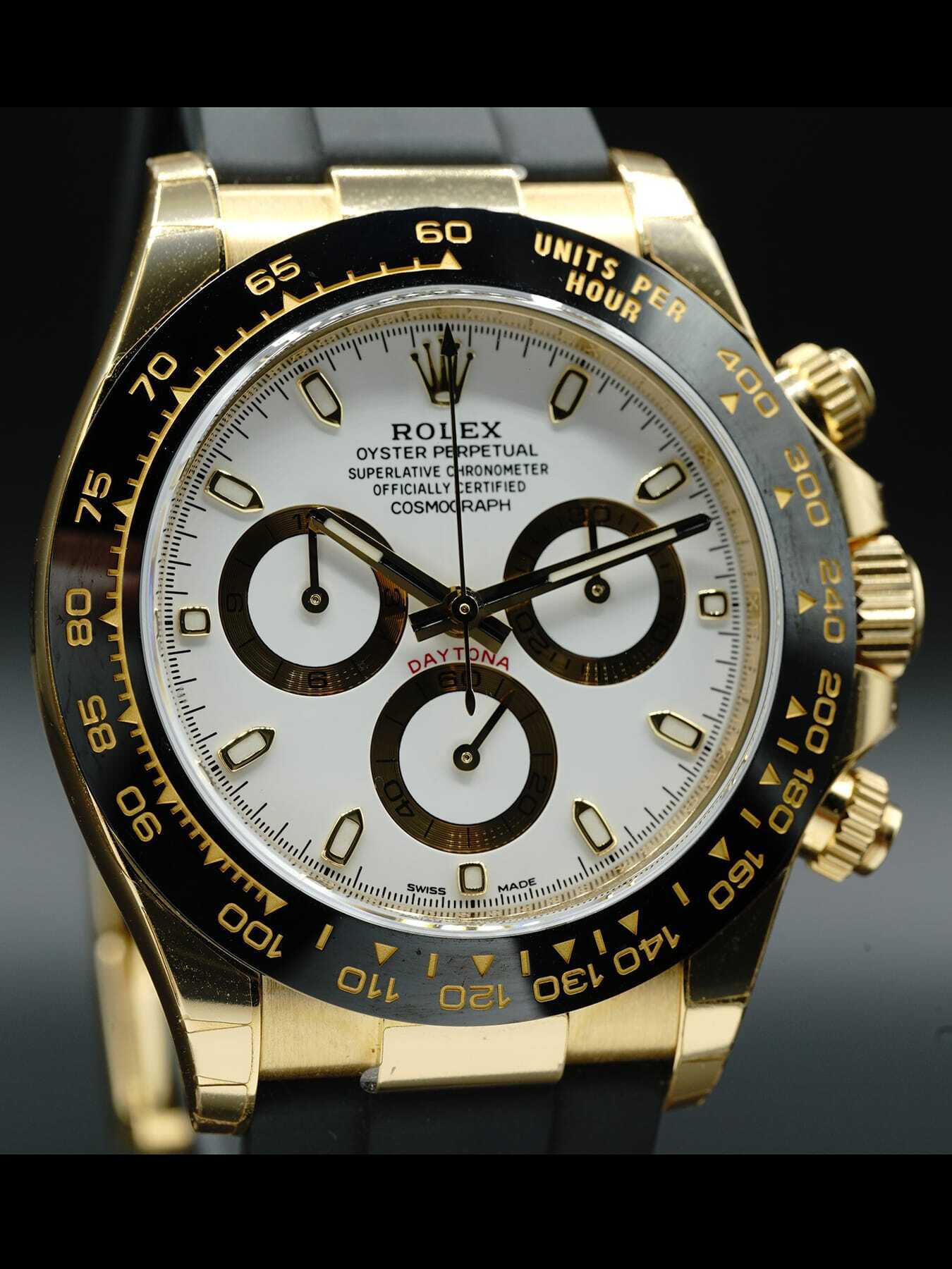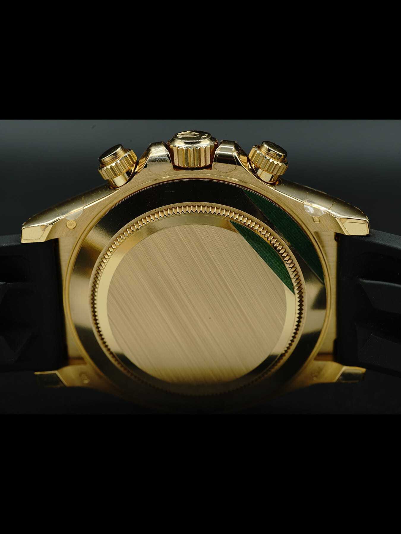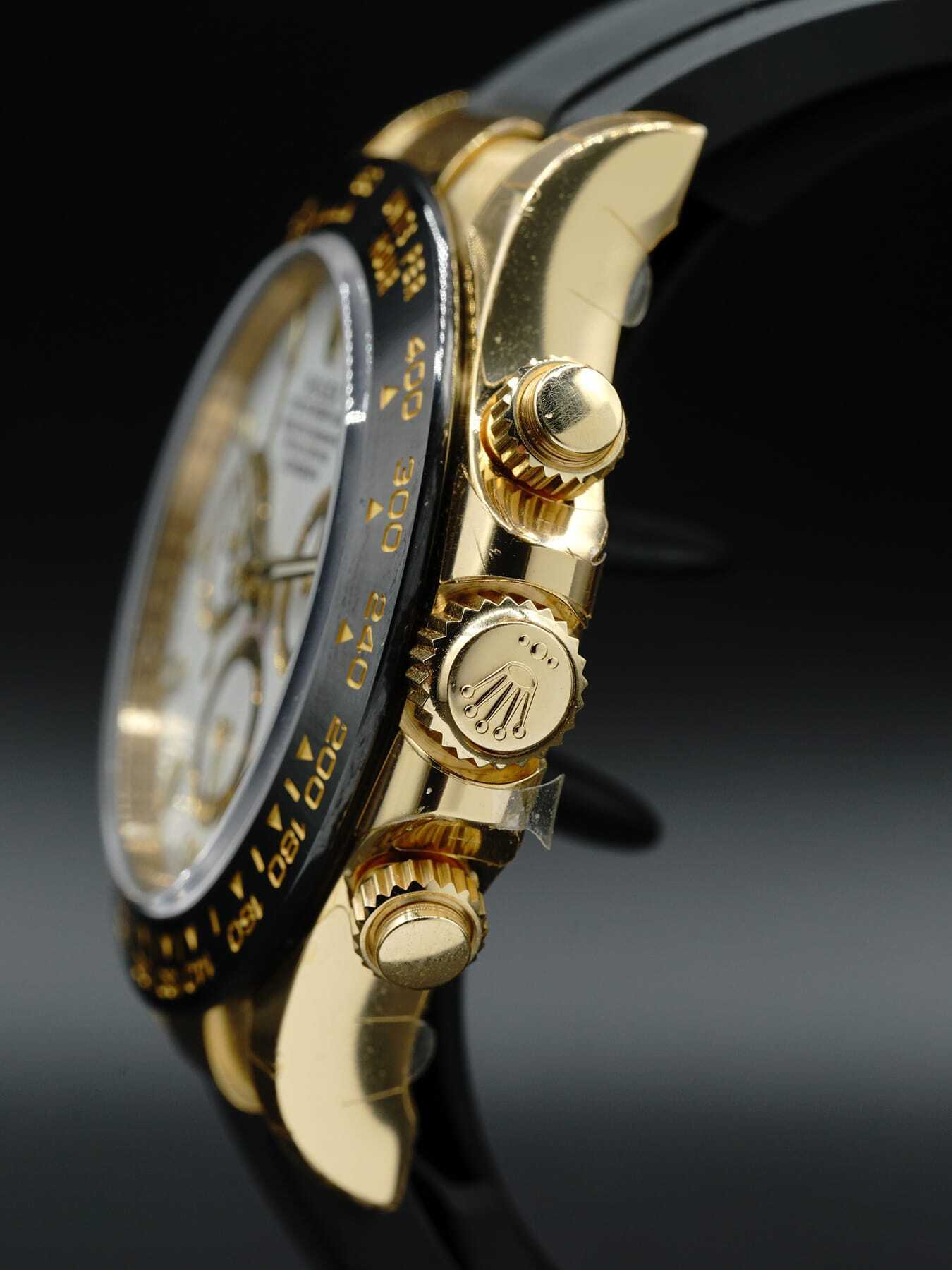 This Rolex Oyster Perpetual Cosmograph Daytona in 18k ct yellow gold is in EXCELLENT condition. This watch features a golden and black dial and an Oysterflex bracelet as well as a Black Cerachrom bezel with tachymetric scale.