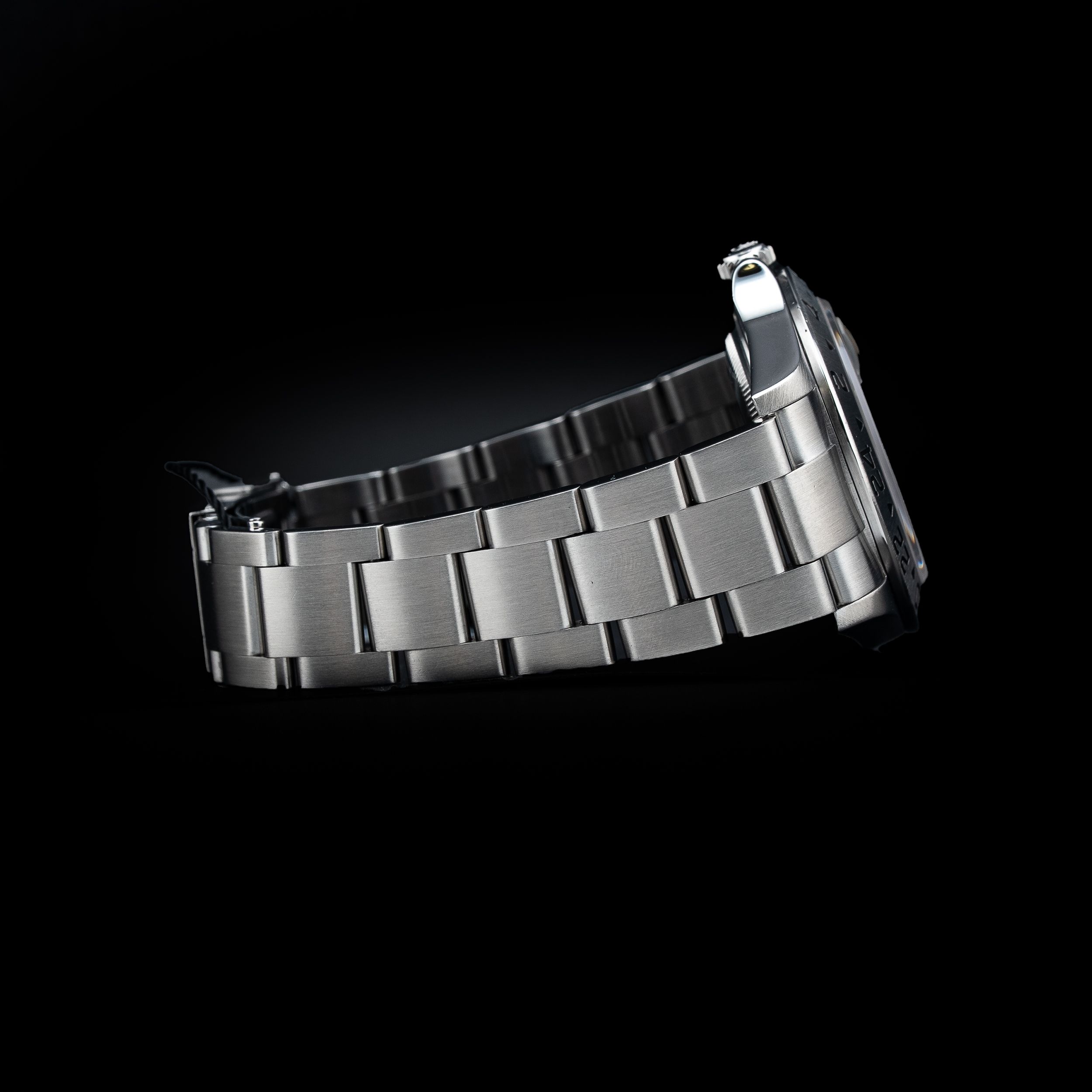 This watch features a 40mm steel case on steel bracelet. This watch also sports a black dial. Powered by an automatic movement. Water resistance up to 100 meters.