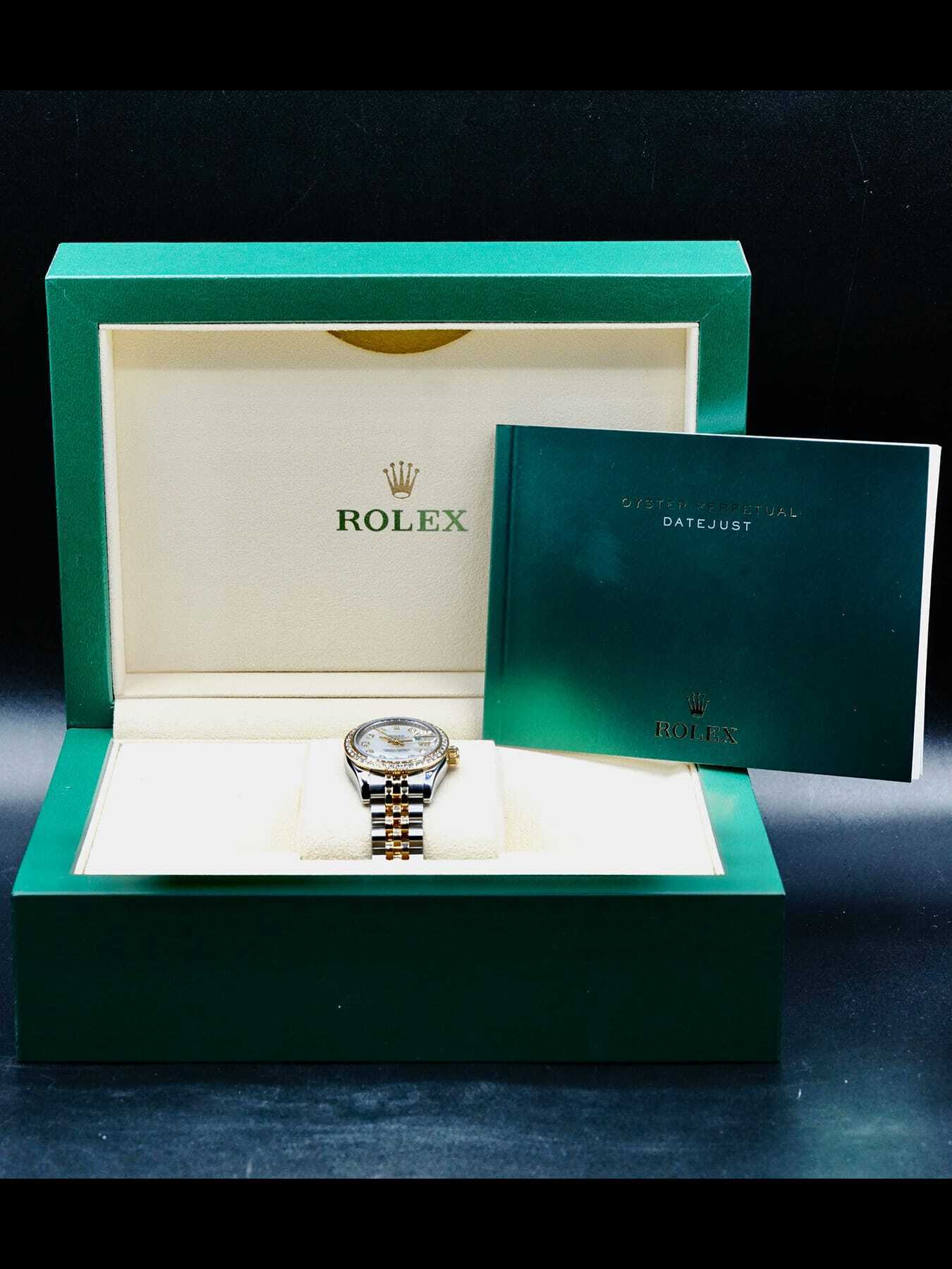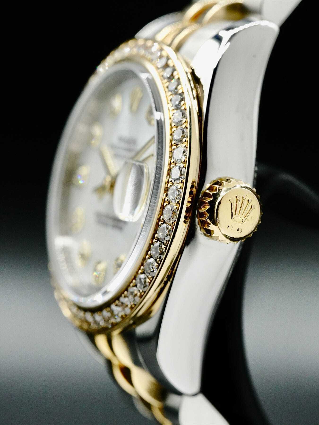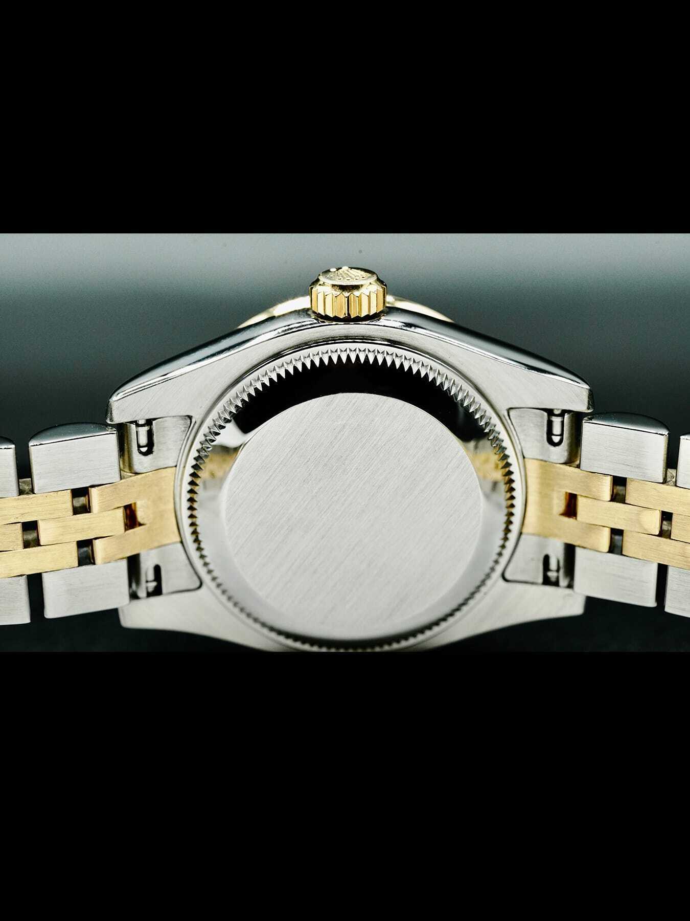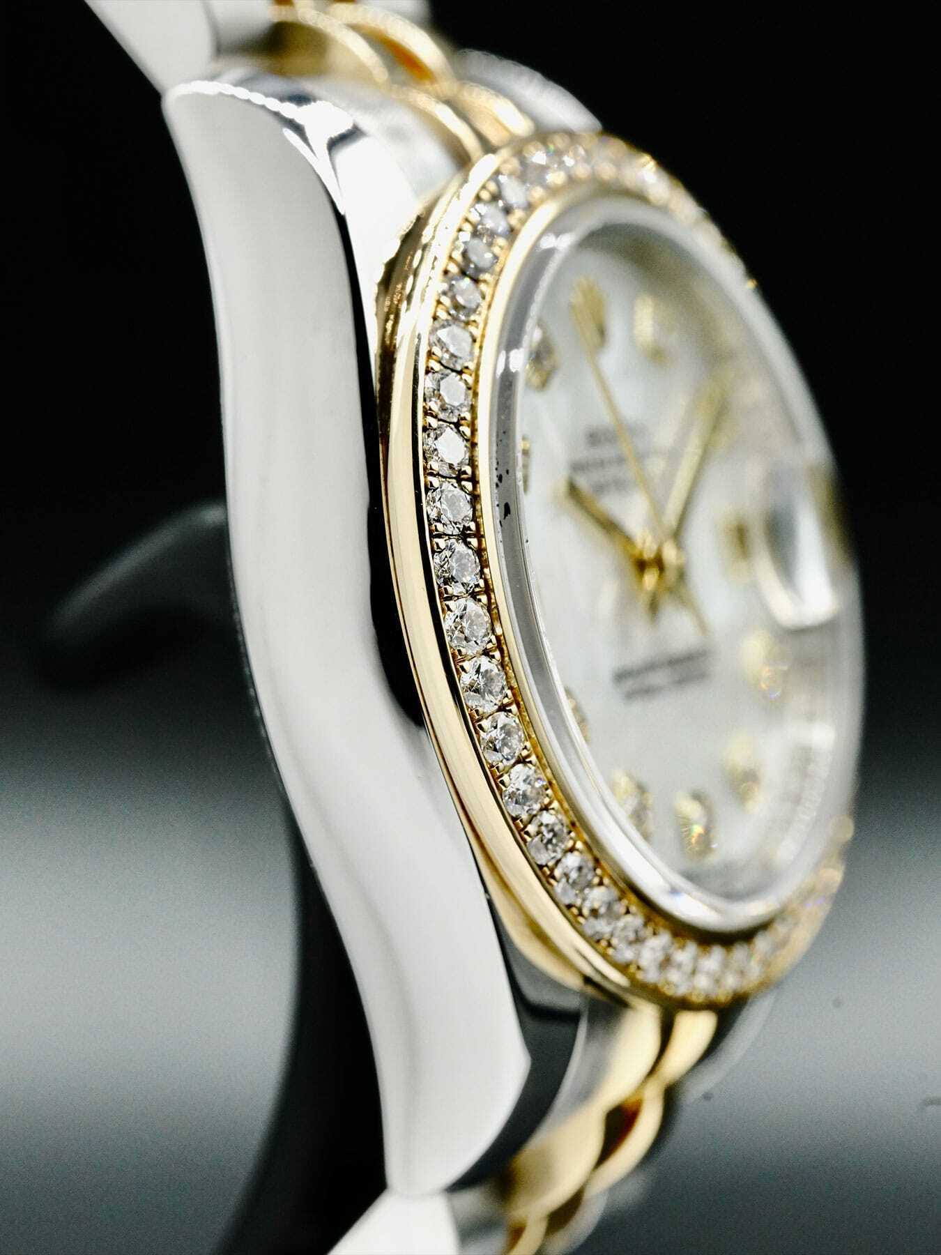 This Rolex Ladies Datejust features a 26mm stainless steel case with an 18k yellow gold diamond-set bezel with a solid case back on a stainless steel & 18k yellow gold jubilee bracelet. This watch also sports a mother of pearl dial with gold hands and 10 diamond dial markers covered by scratch resistant sapphire crystal.