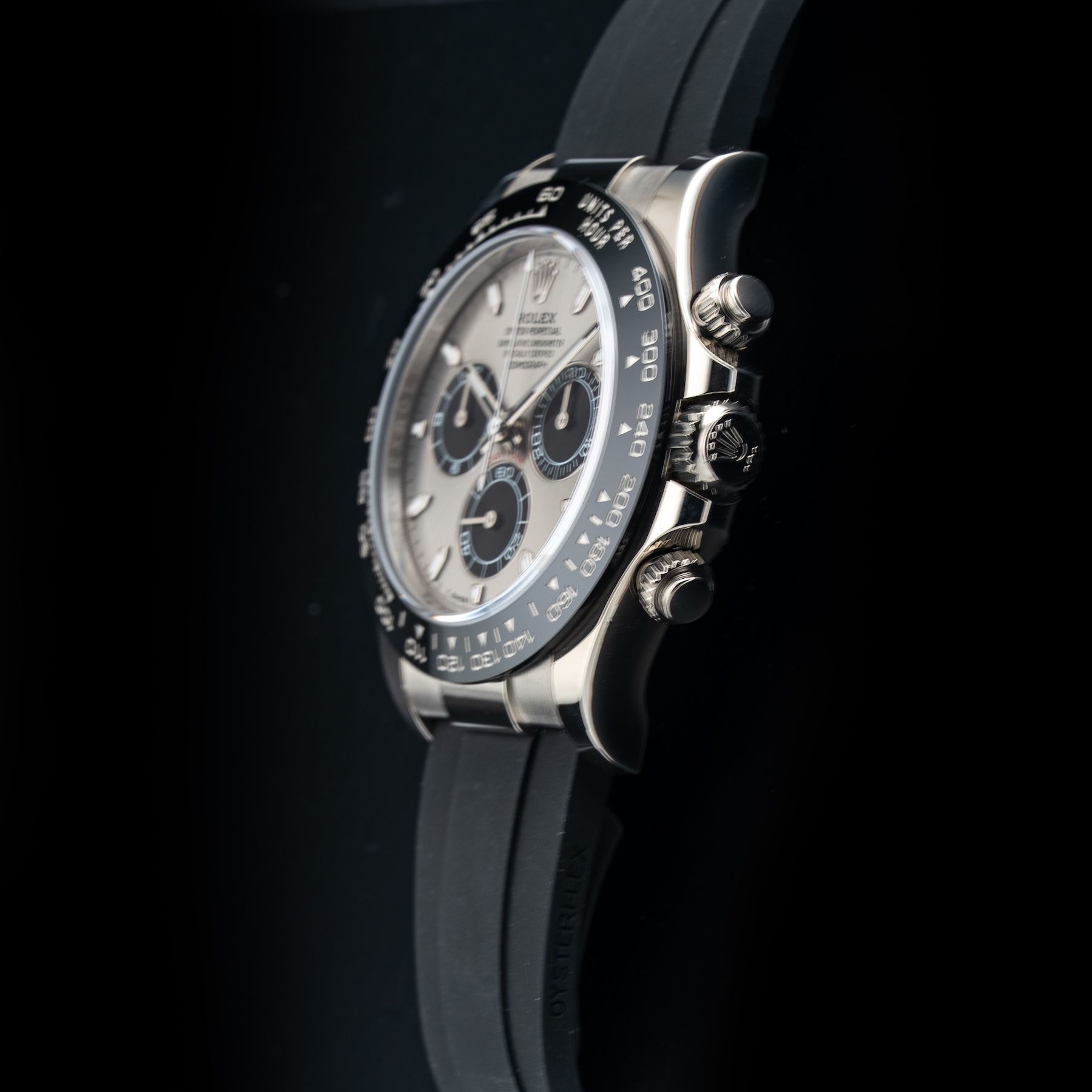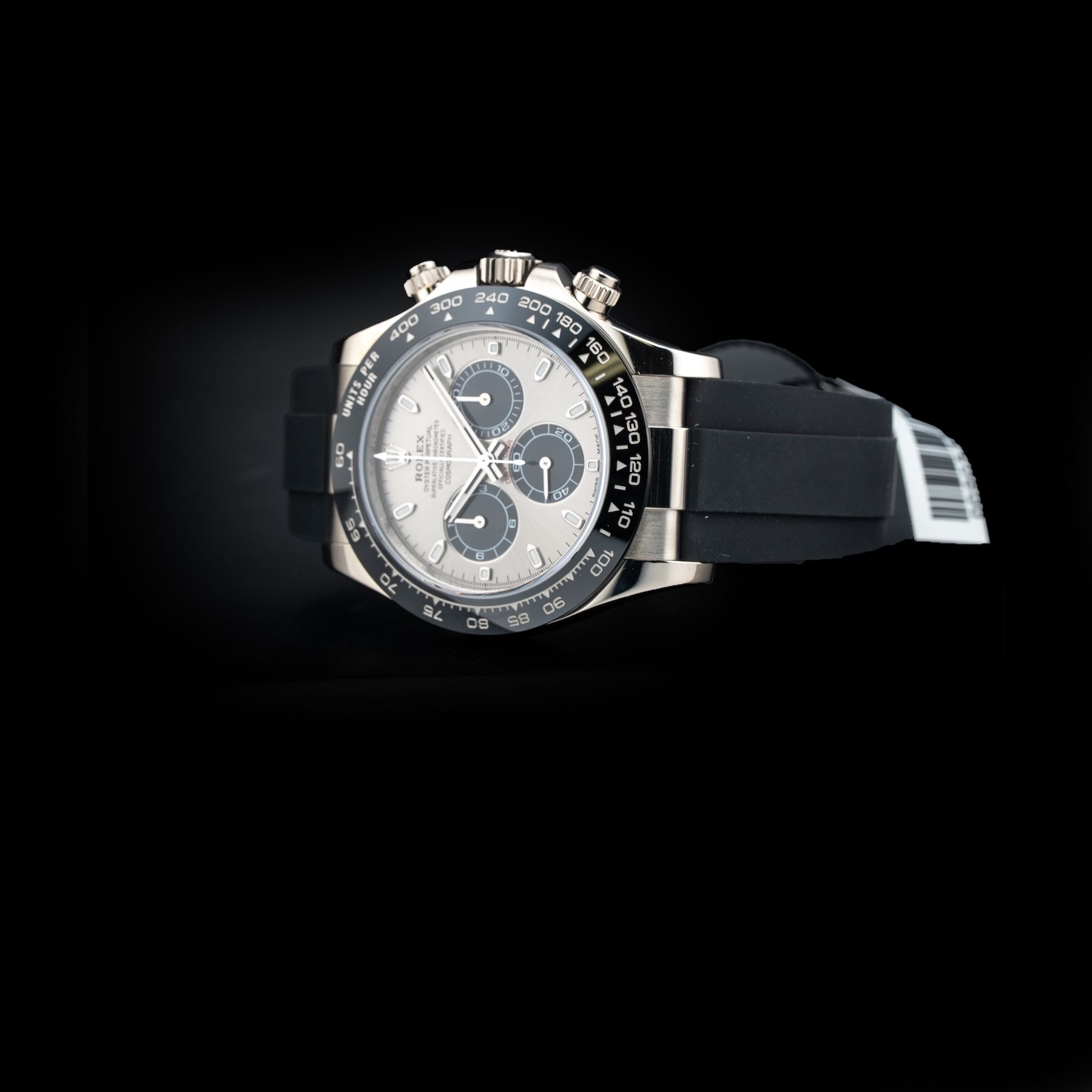 This watch features a 40mm white gold case on rubber strap. This watch also sports a silver dial. Powered by a Rolex caliber 4130 automatic movement. Water resistance up to 100 meters.