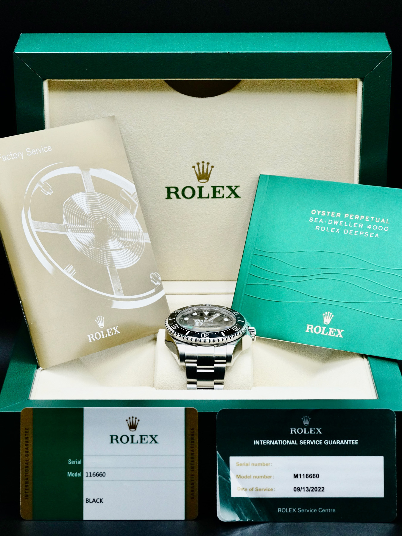 This Rolex M116660 Sea Dweller Deep Sea Black Dial is in EXCELLENT condition. This watch includes original box, instruction booklet and warranty card dated 2022. This Rolex watch has been fully authenticated and certified by a 3rd party organization. You’ll receive the certificate of authenticity with your purchase.