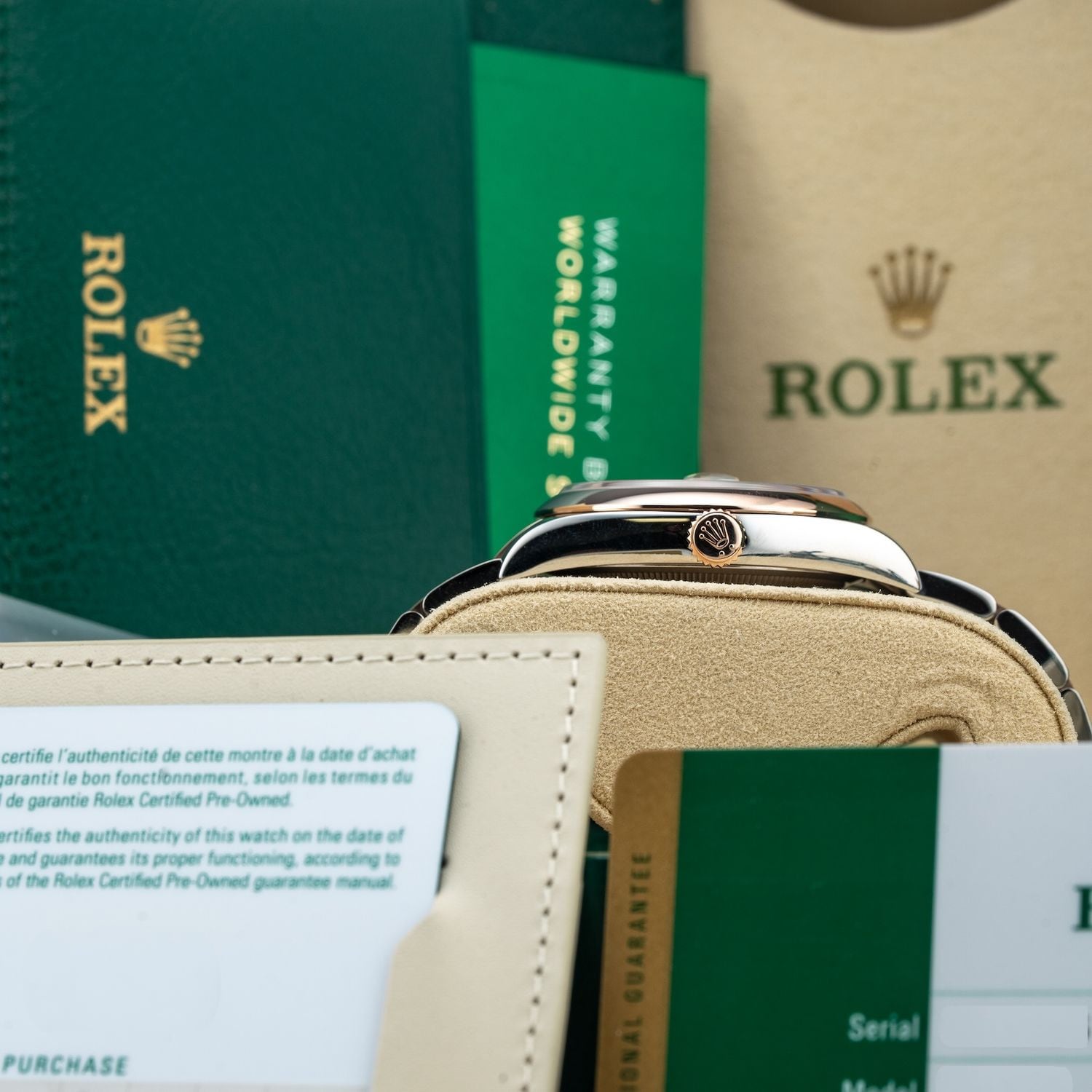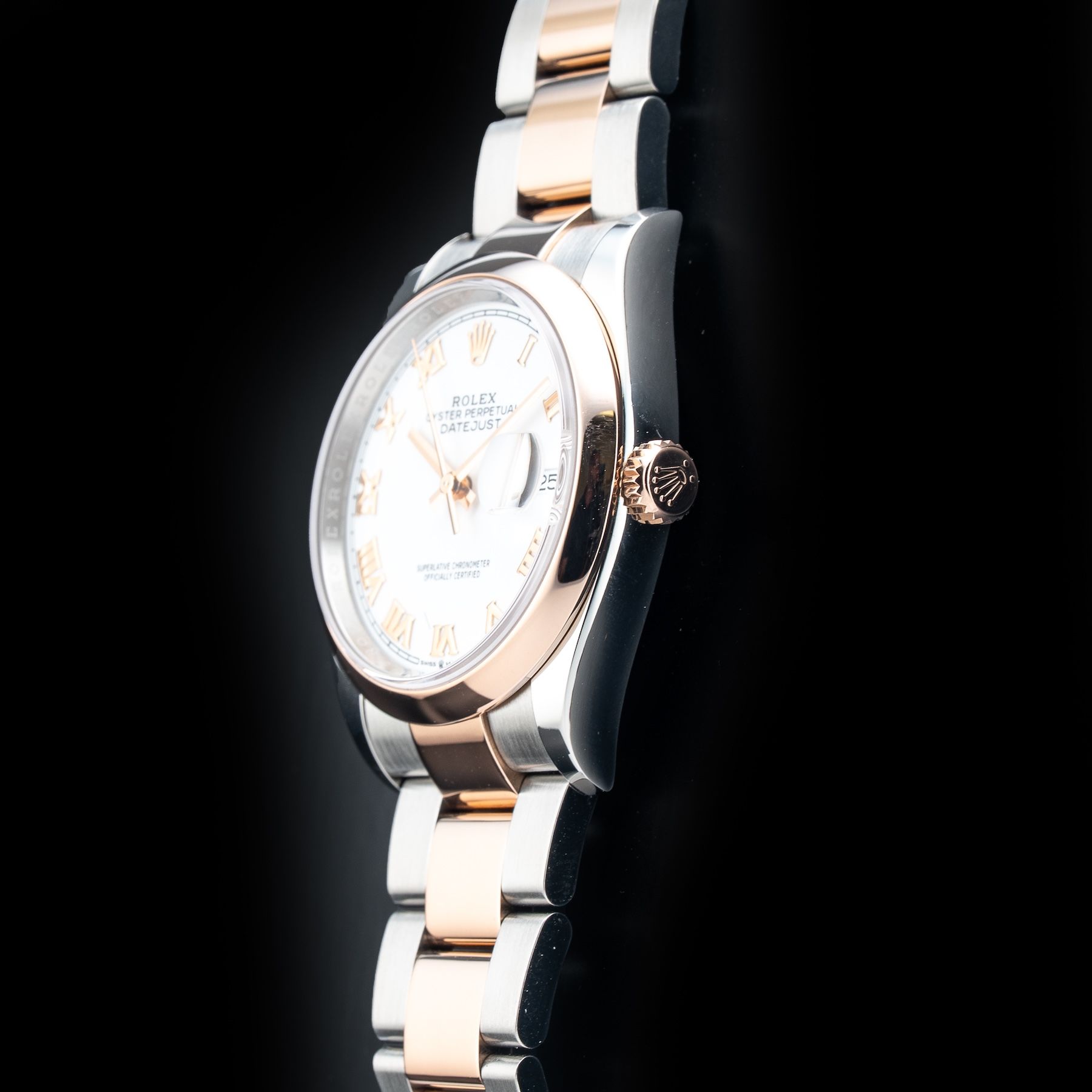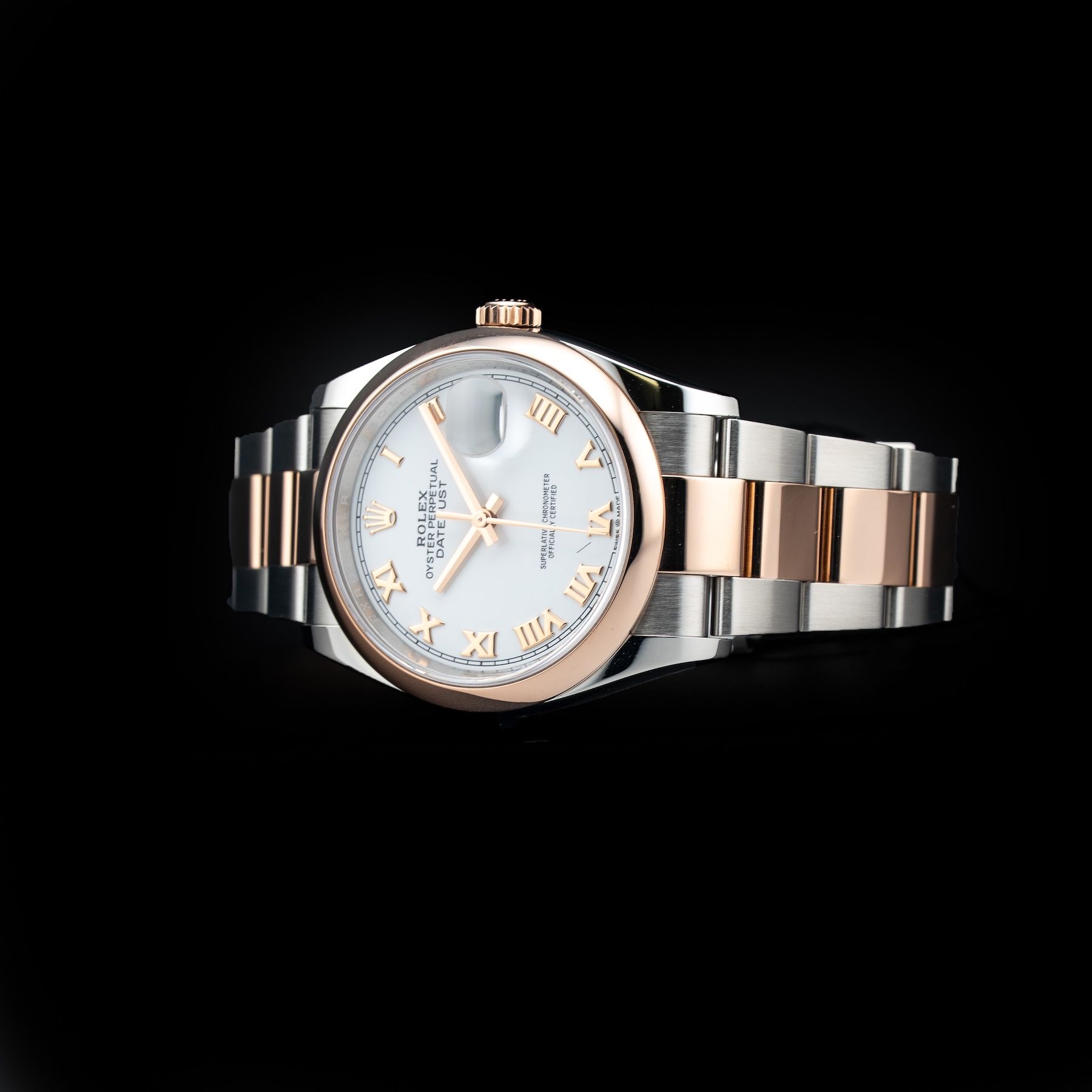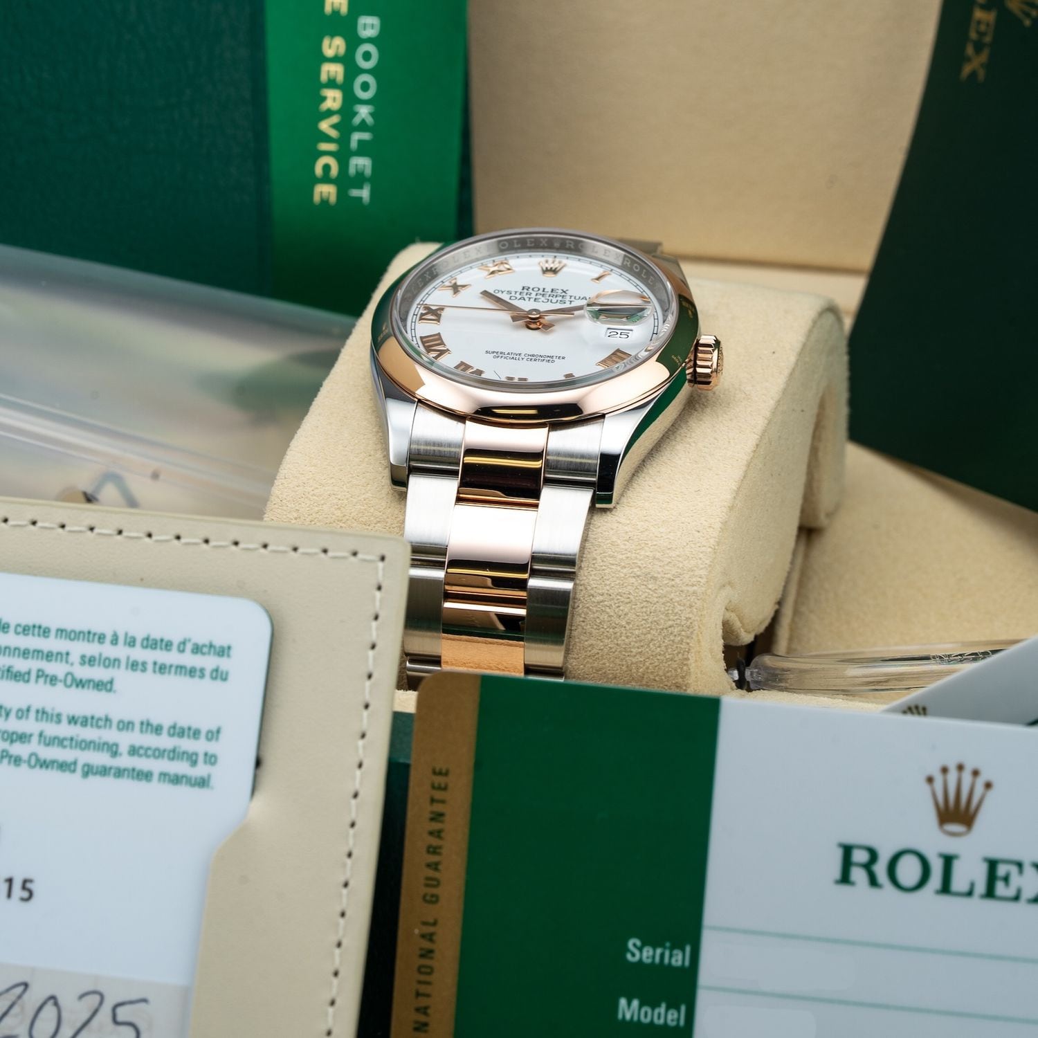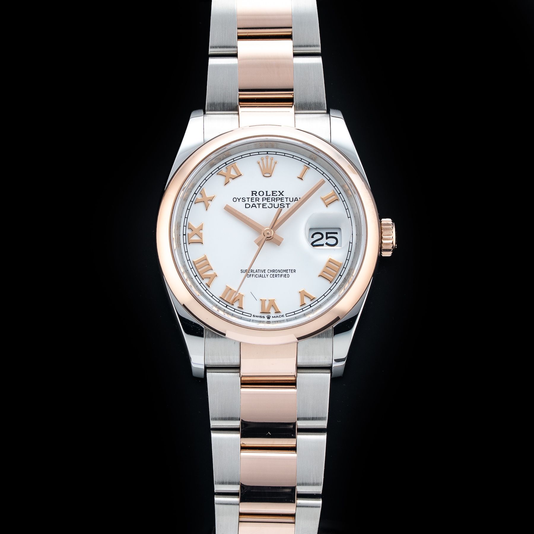 This watch features a 36mm oystersteel and everose gold case on oystersteel and everose gold bracelet. This watch also sports a white dial. Powered by a perpetual, mechanical, self-winding movement. Water resistance up to 100 meters.