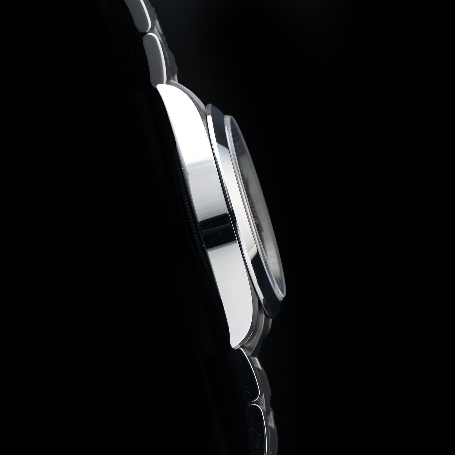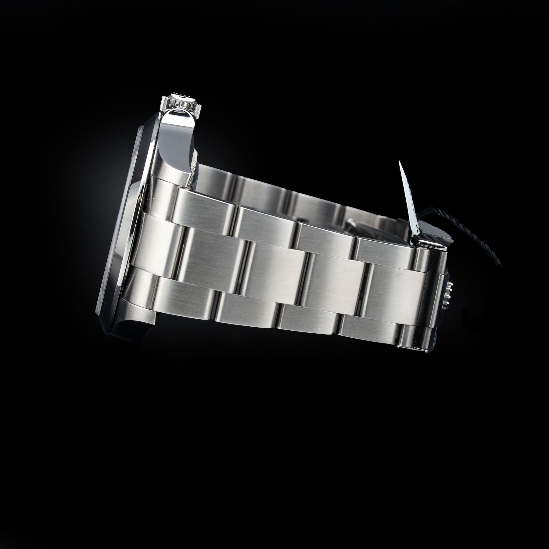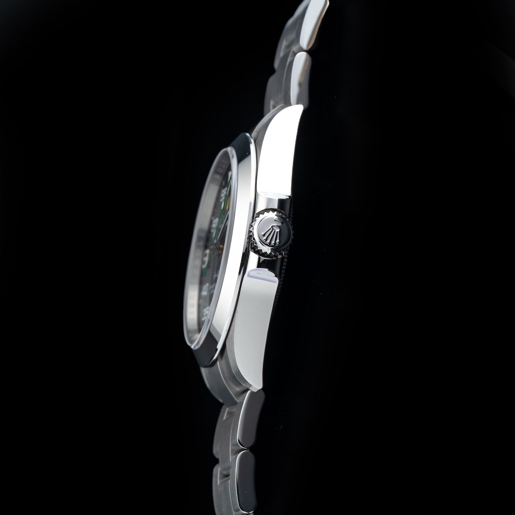 This watch features a 40mm Oystersteel case on Oystersteel bracelet. This watch also sports a black dial. Powered by a perpetual, mechanical, self-winding movement. Water resistance up to 100 meters.