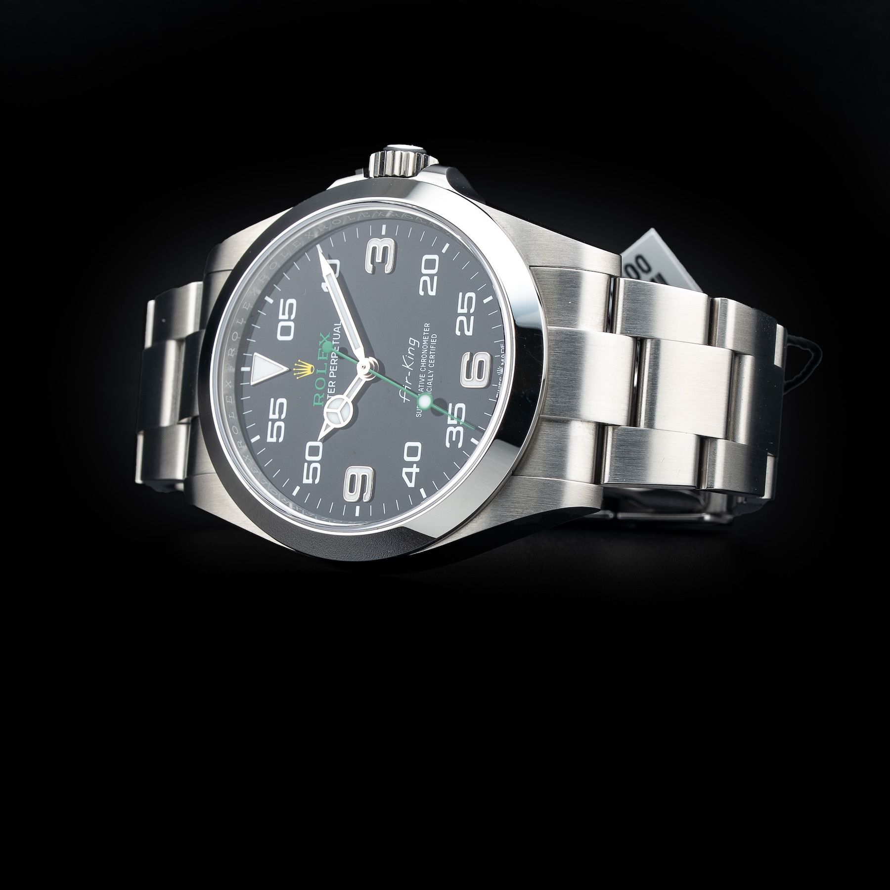 This Rolex M126900-0001 Air-King is in GREAT condition. This watch includes its Warranty Card Only Dated 2023 and Extra Links. This Rolex watch has been fully authenticated and certified by a 3rd party organization. You’ll receive the certificate of authenticity with your purchase. Please note, the photos shown are of the actual watch you will receive.