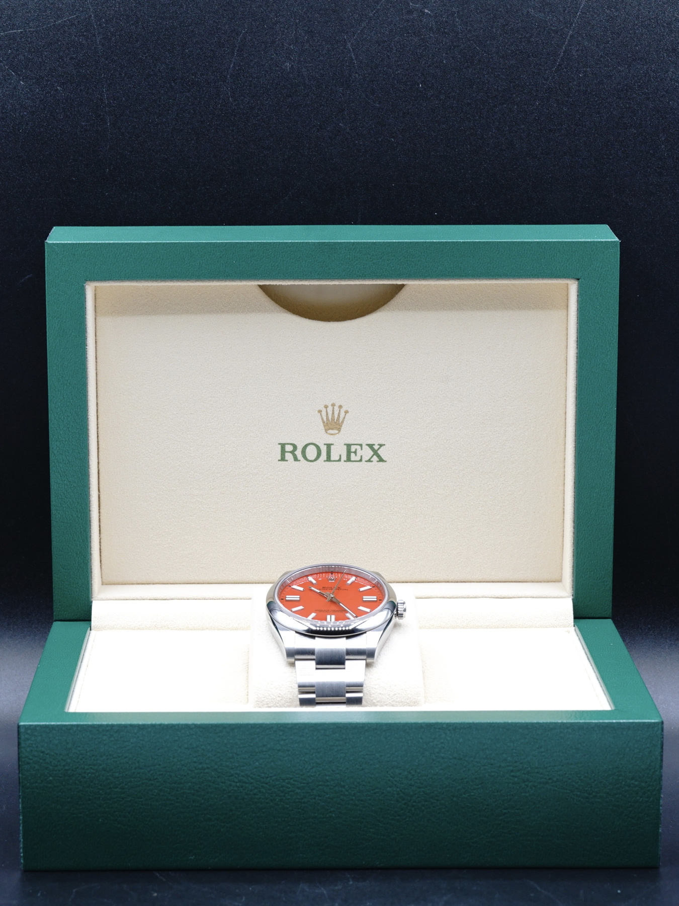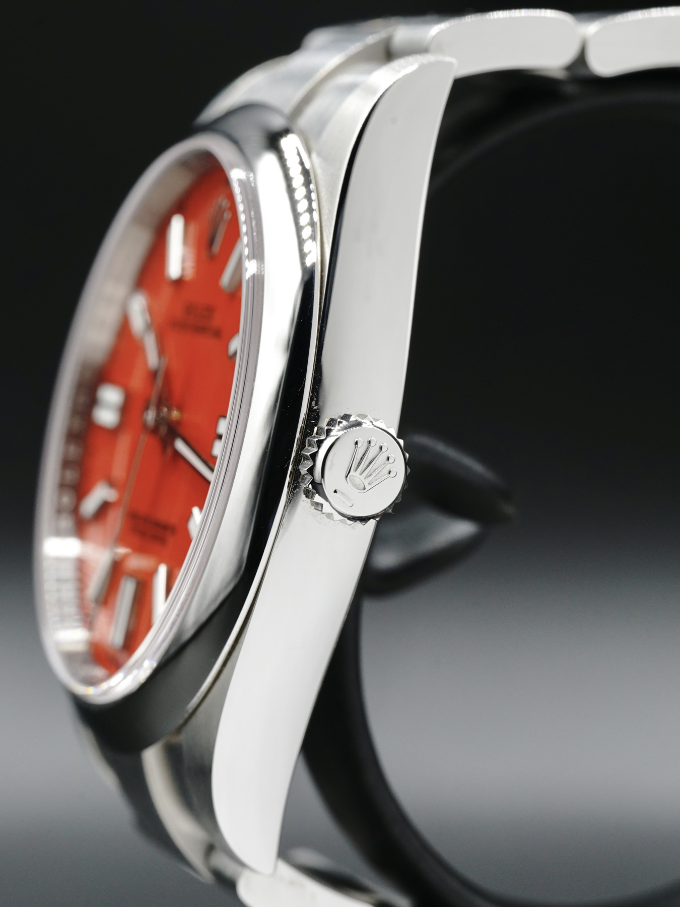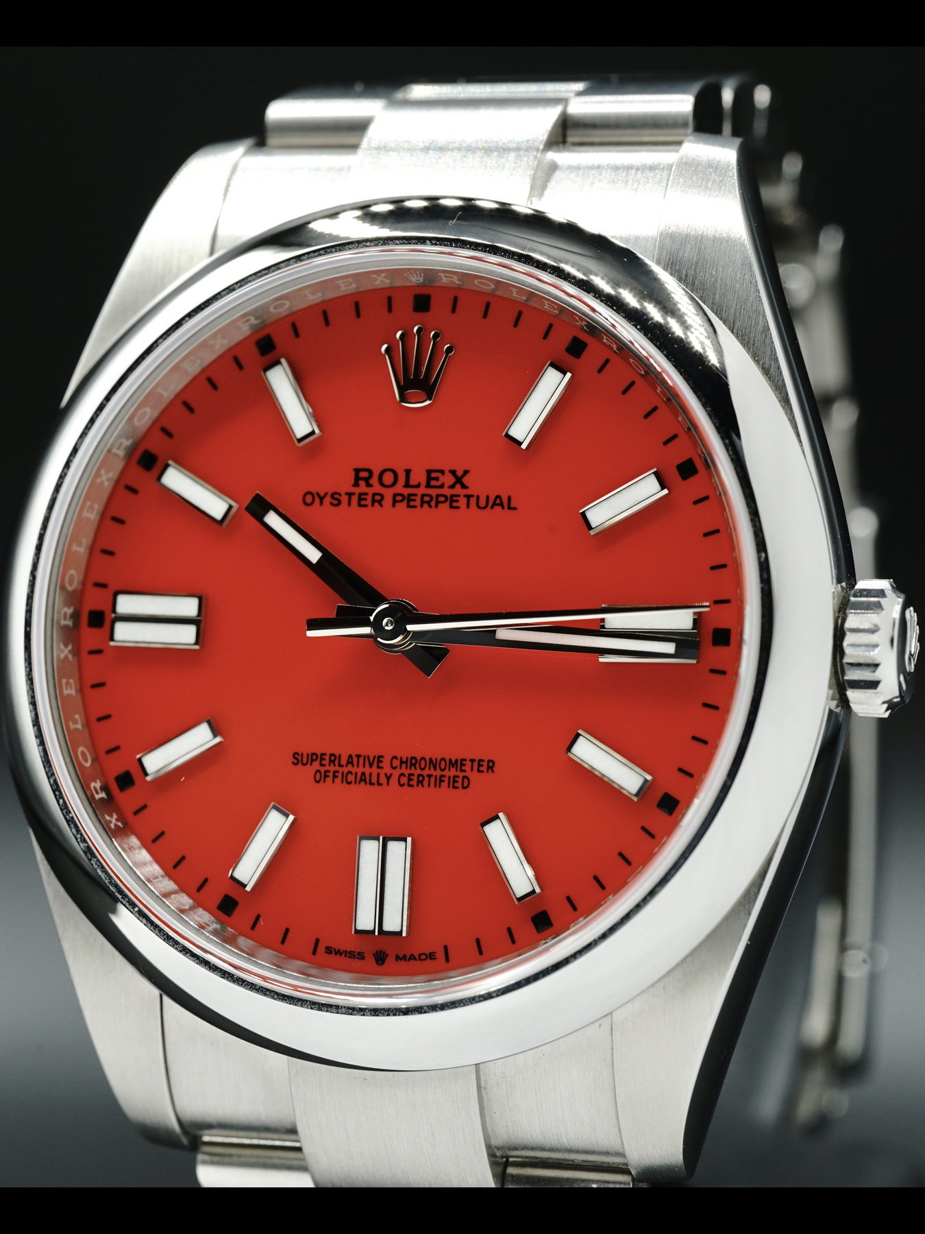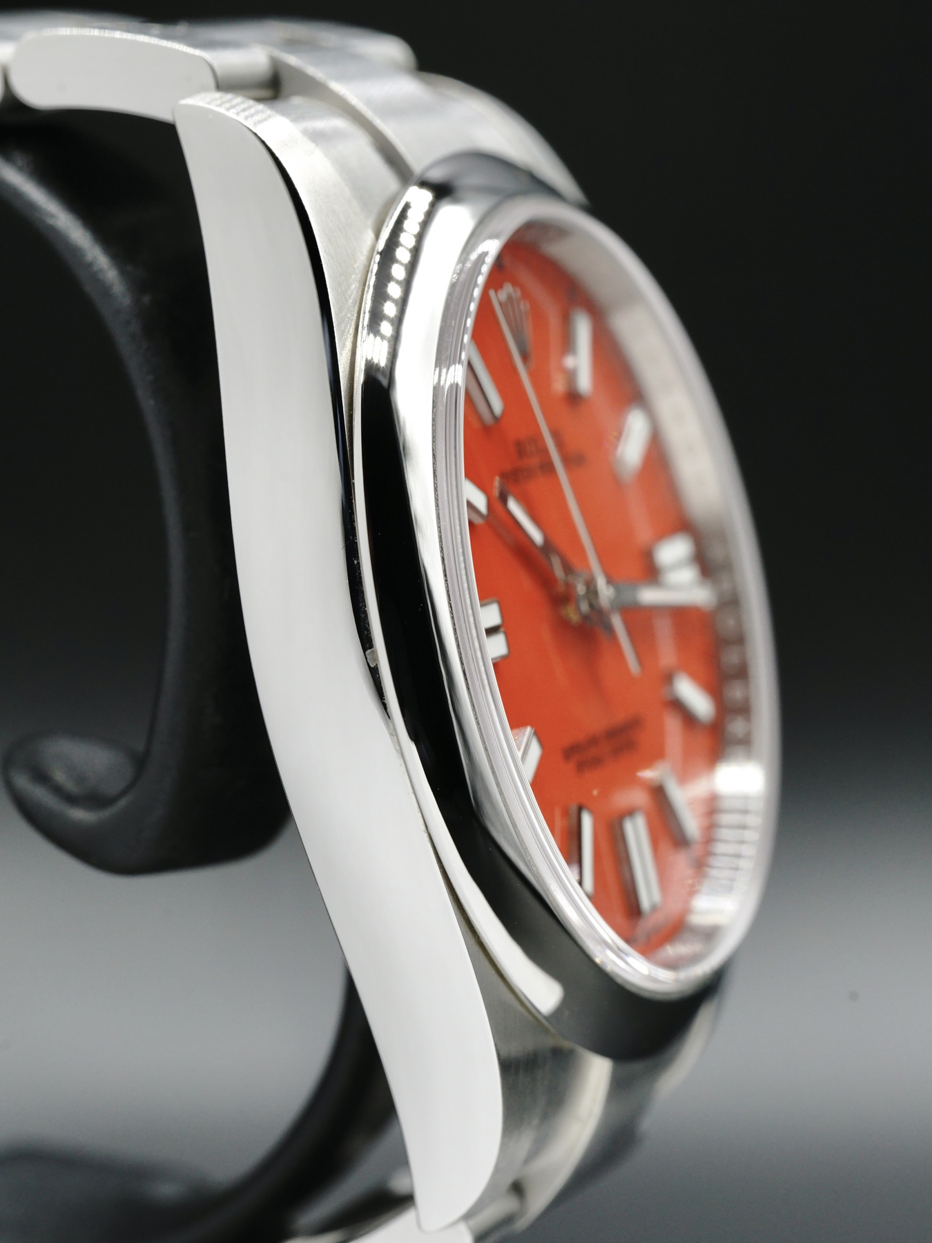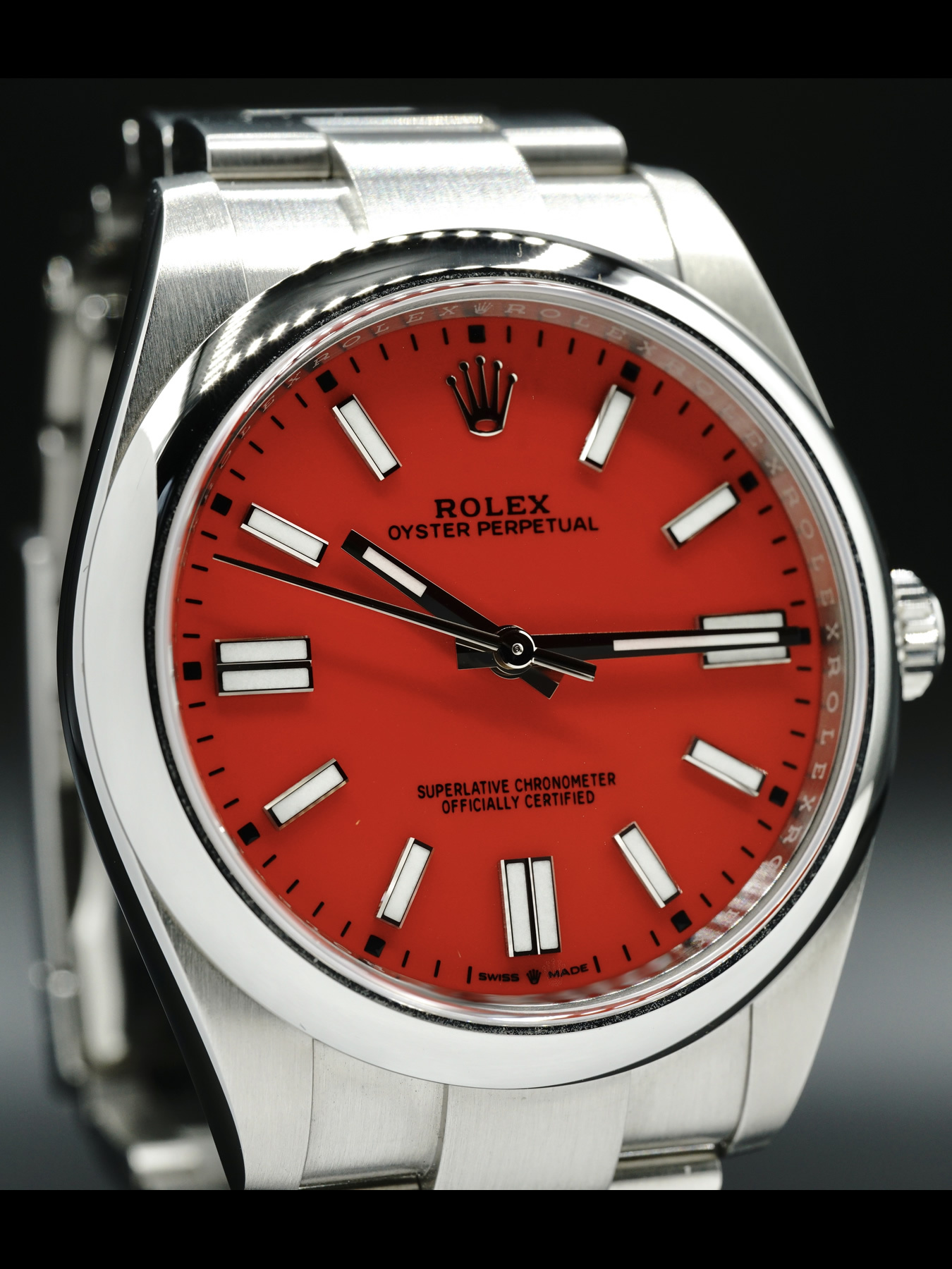 This Rolex Oyster Perpetual 41 features a 41mm stainless steel case on a stainless steel bracelet. This watch also showcases a distinctive coral red dial and a highly legible chromalight display with long-lasting blue luminescence covered by scratch-resistant sapphire crystal.