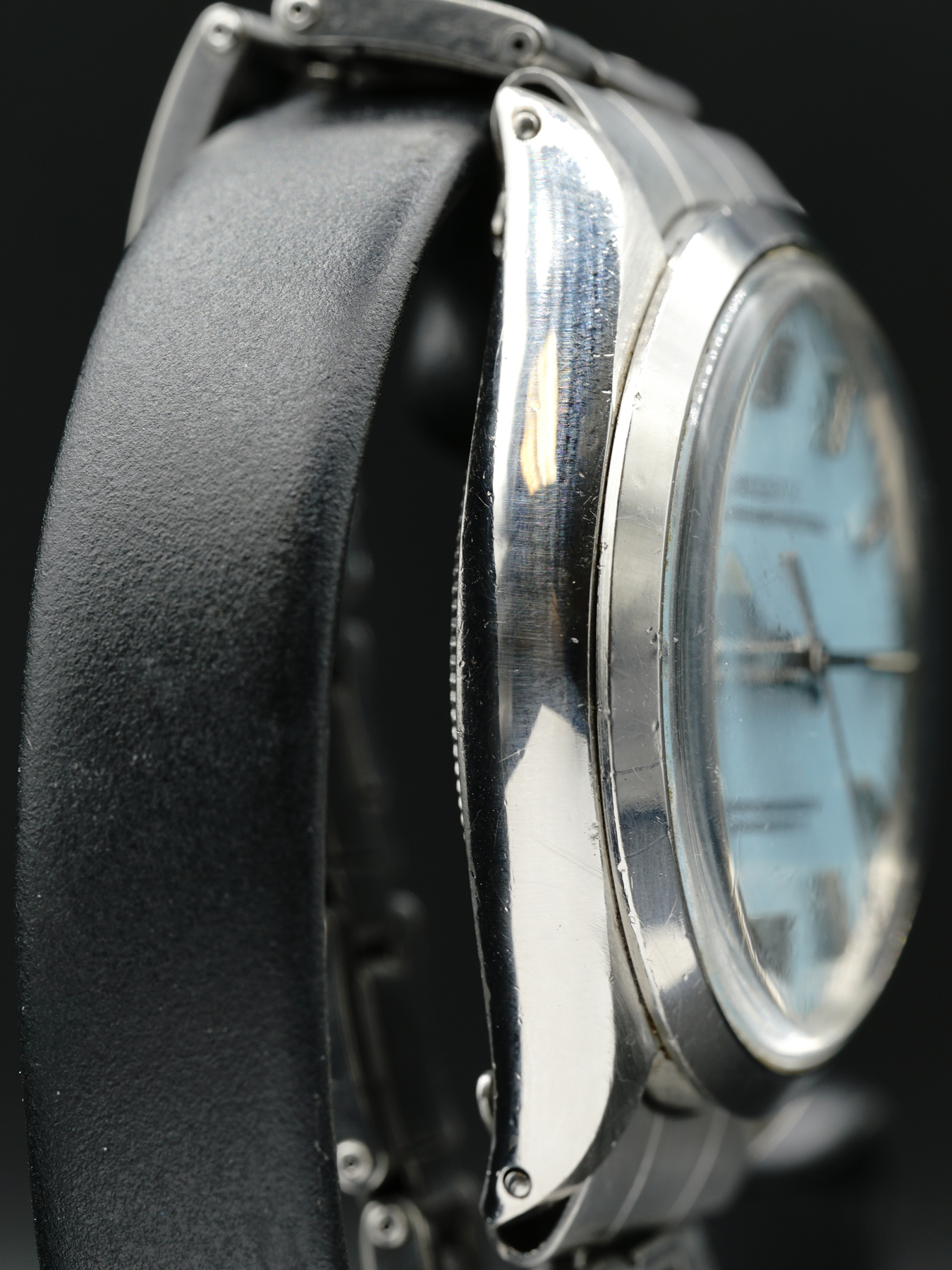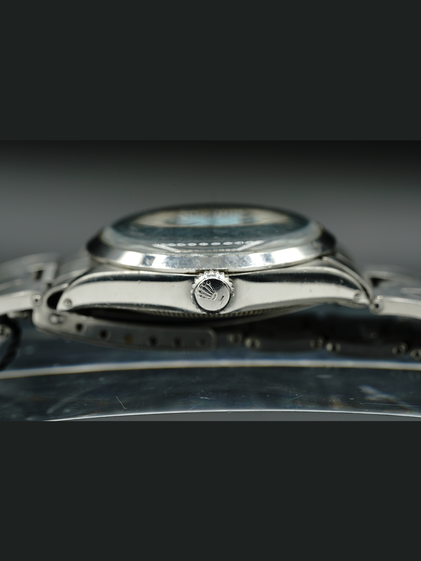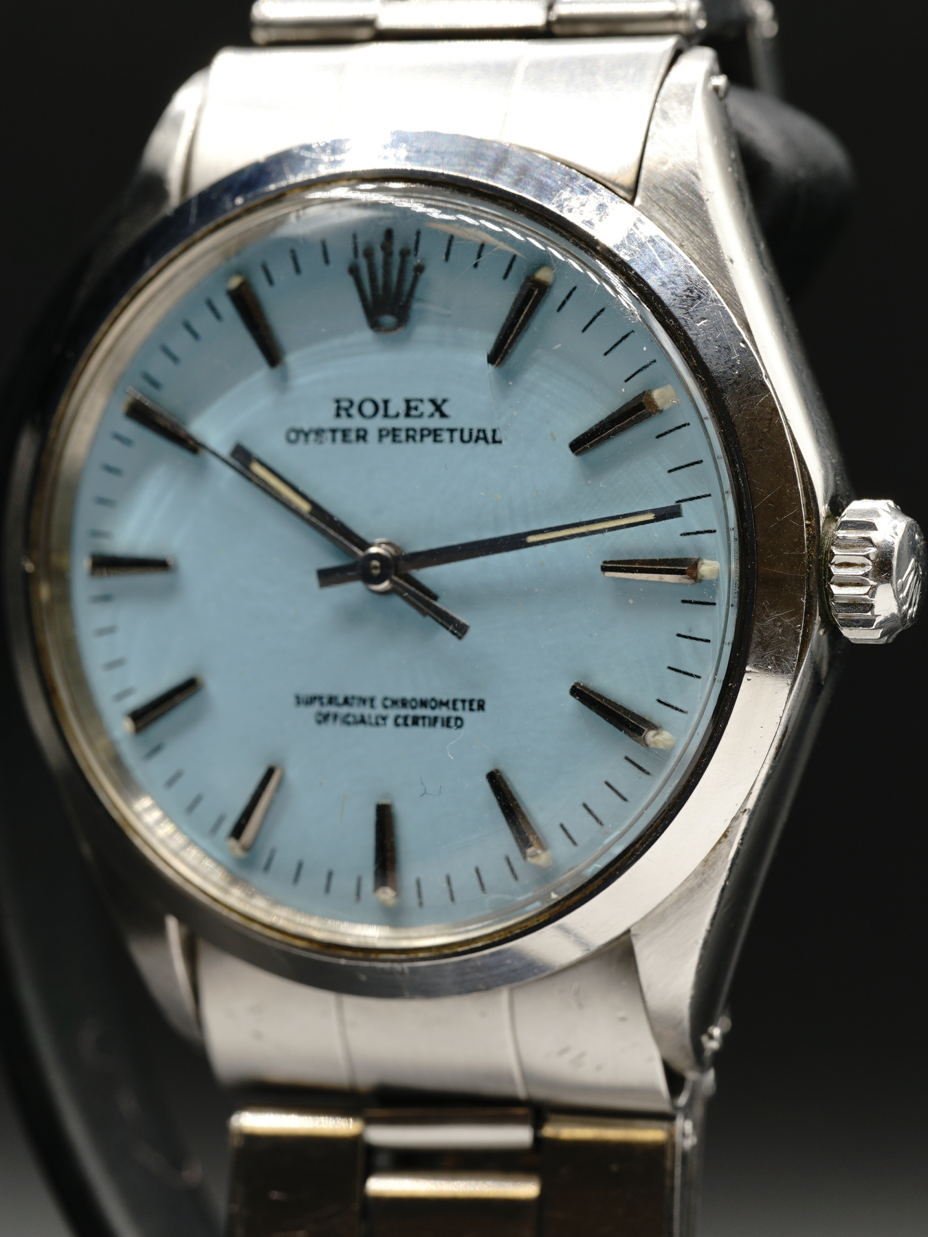 This Rolex Oyster Perpetual steel has a smooth steel bezel, sapphire crystal, and a turquoise Tiffany color dial. This watch is in fair condition with minor scratches along the case and bracelet. Year 1973