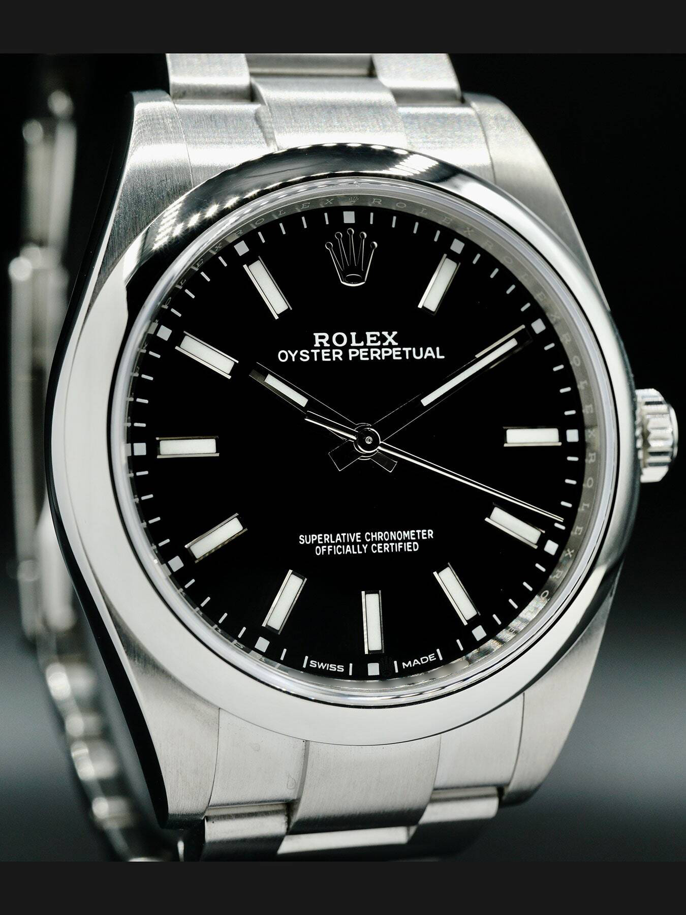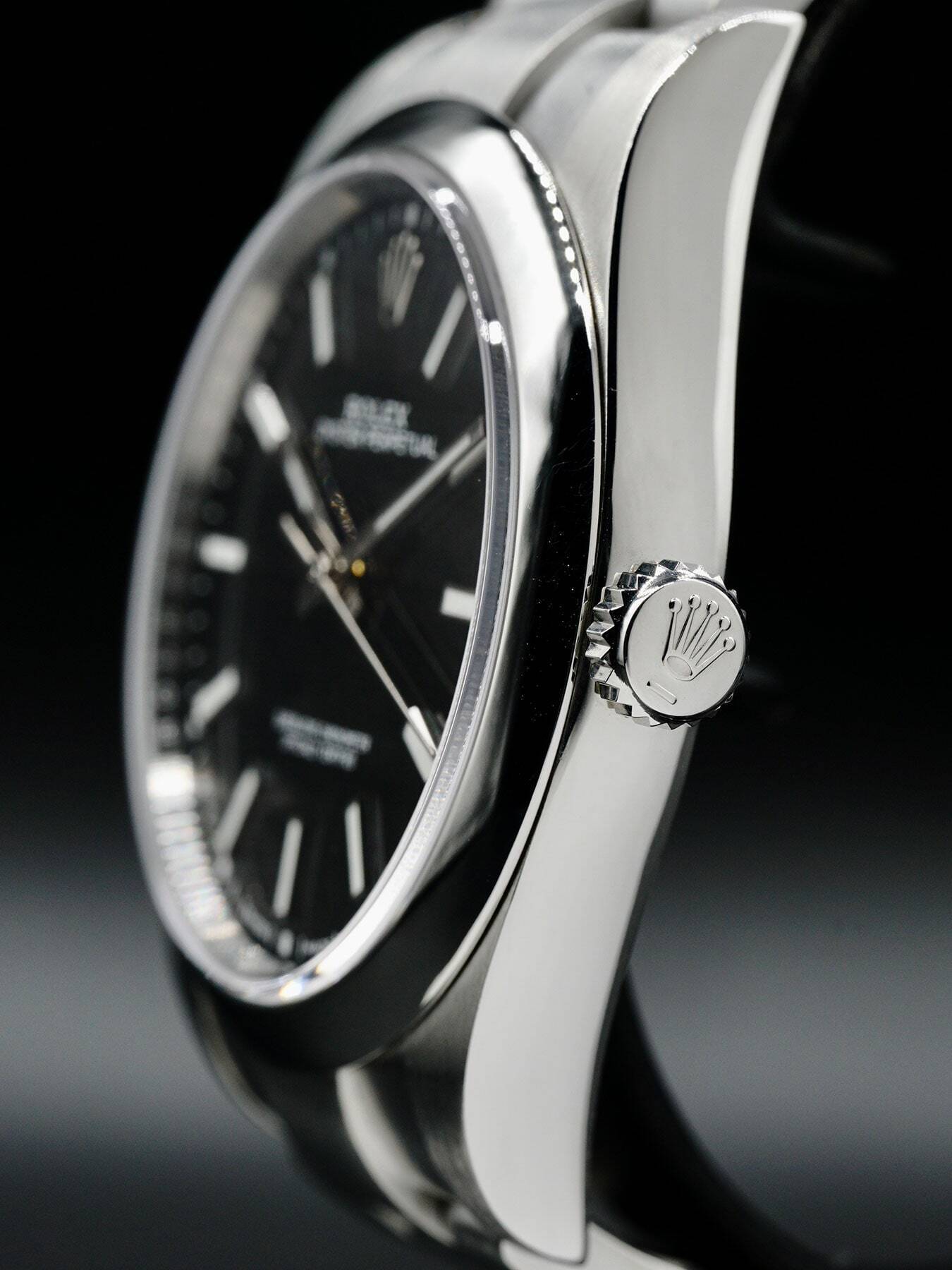 This Rolex Oyster Perpetual features a 39mm stainless steel case & bezel with a solid case back on a stainless steel bracelet with a folding buckle clasp. This watch also showcases a black dial with luminous hands and dial markers covered by scratch resistant sapphire crystal.