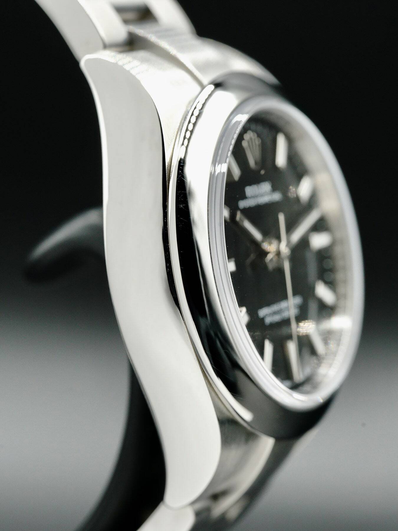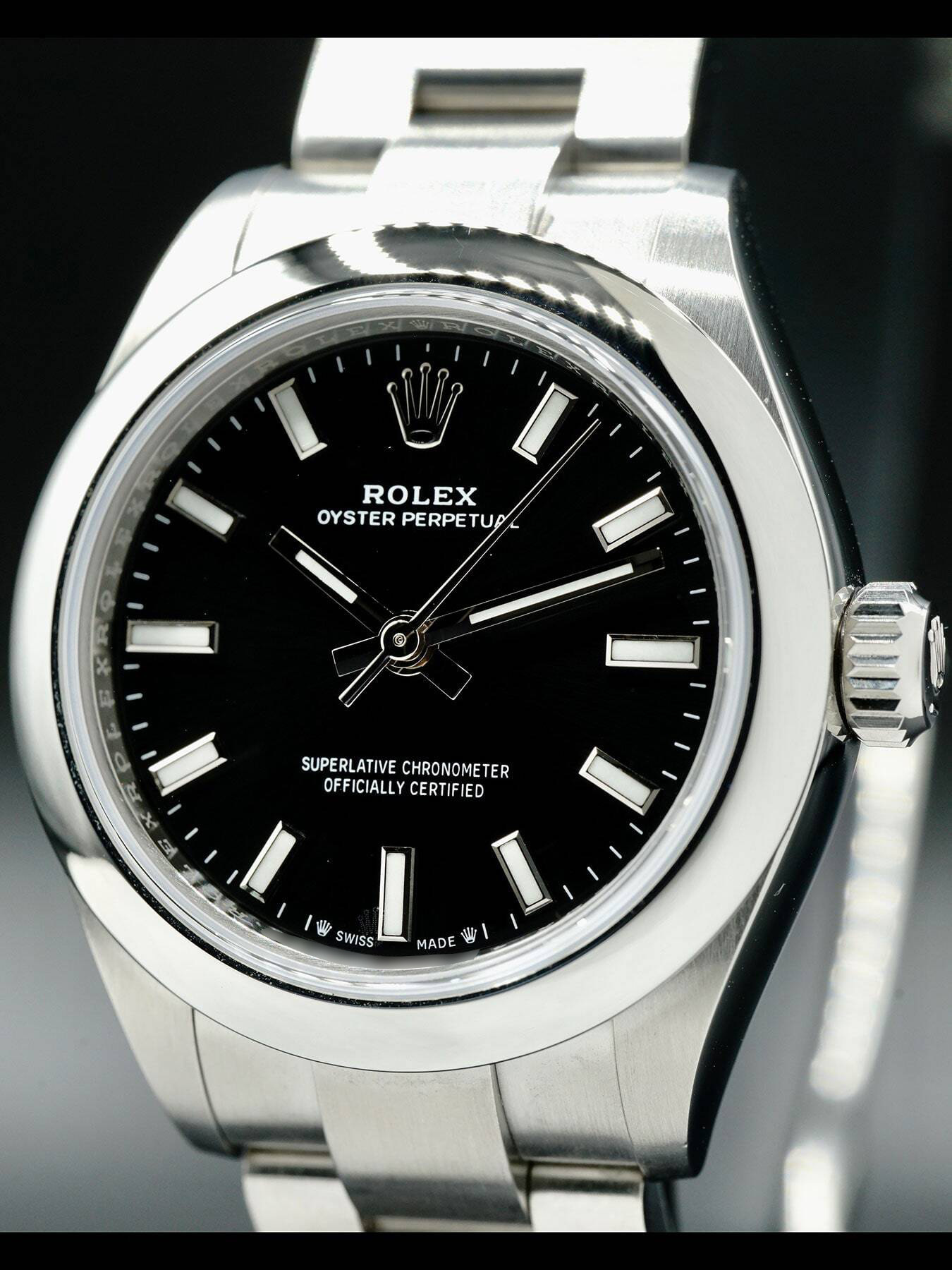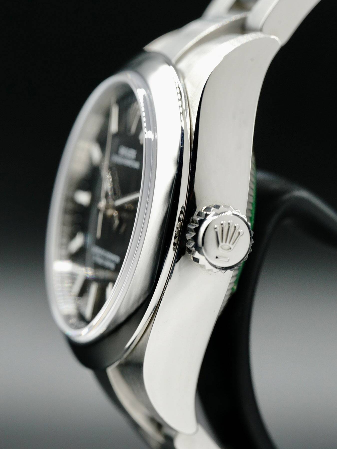 This Rolex Oyster Perpetual 28 features a 28mm stainless steel case with a solid case back on a stainless steel bracelet. This watch also sports a bright black dial with highly legible Chromalight display with long-lasting blue luminescent hands and dial markers covered by scratch resistant sapphire crystal.