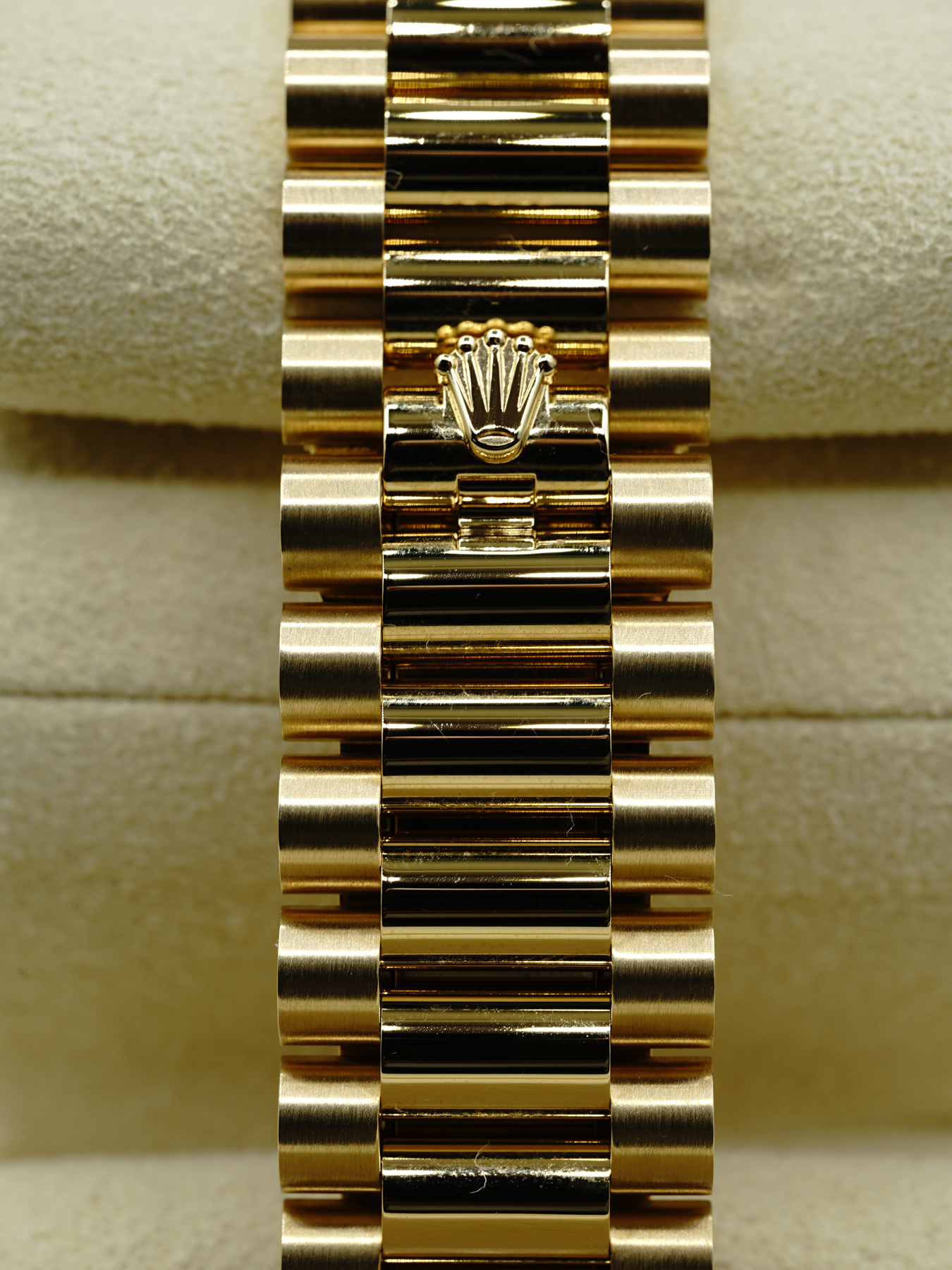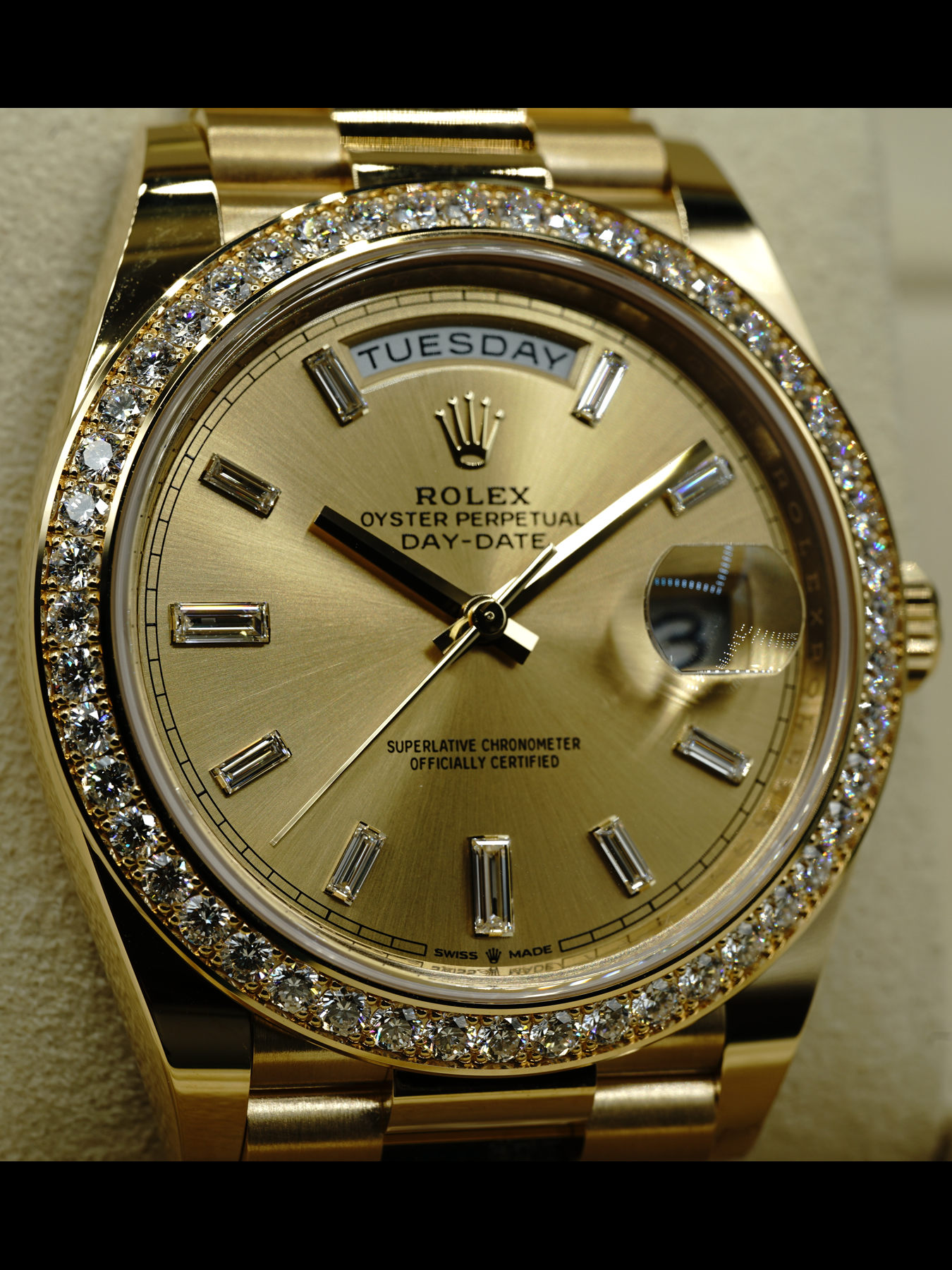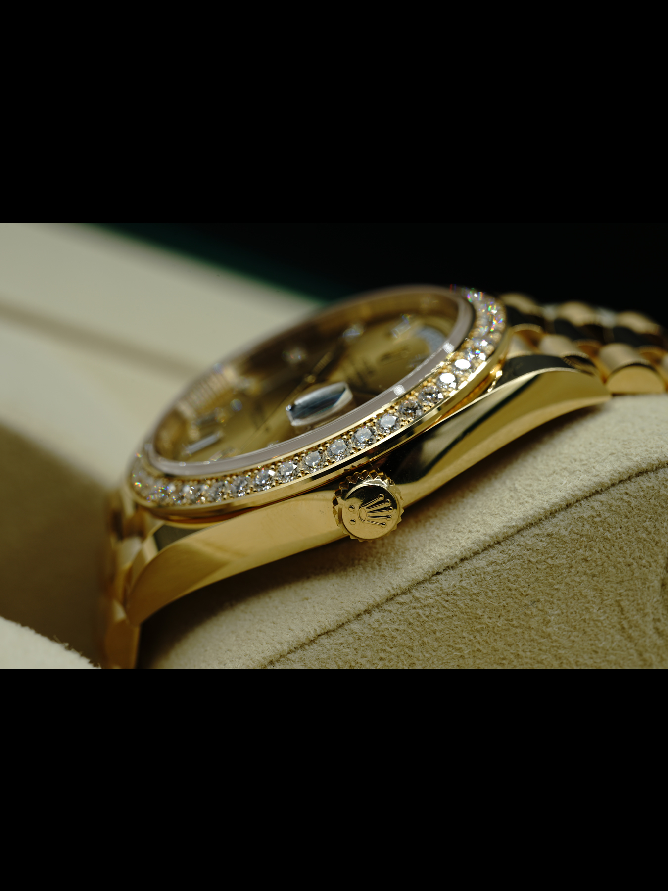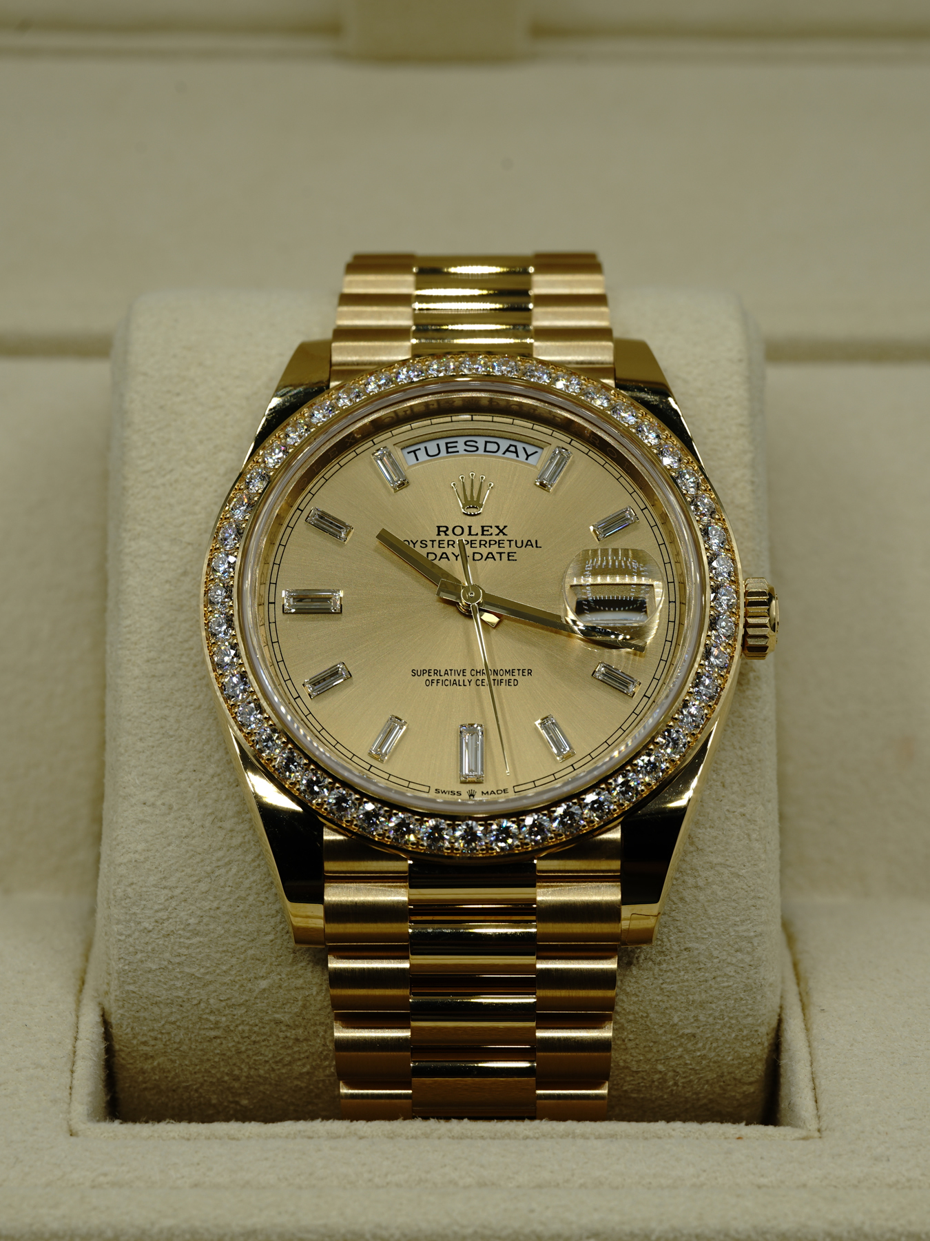 This Oyster Perpetual Day-Date 40 Rolex has 18ct gold, diamond-set bezel, and a president bracelet with three-piece solid links comprised of a polished center link.