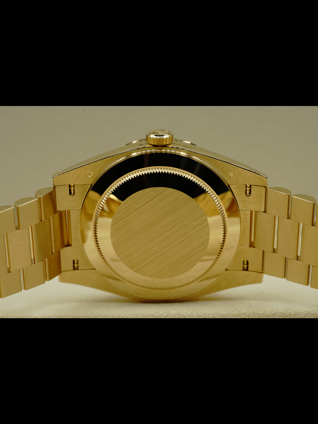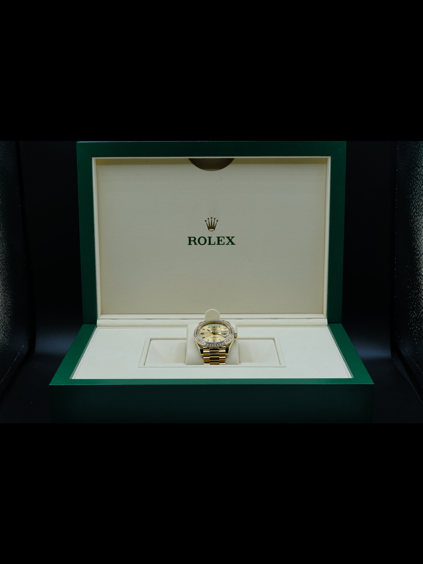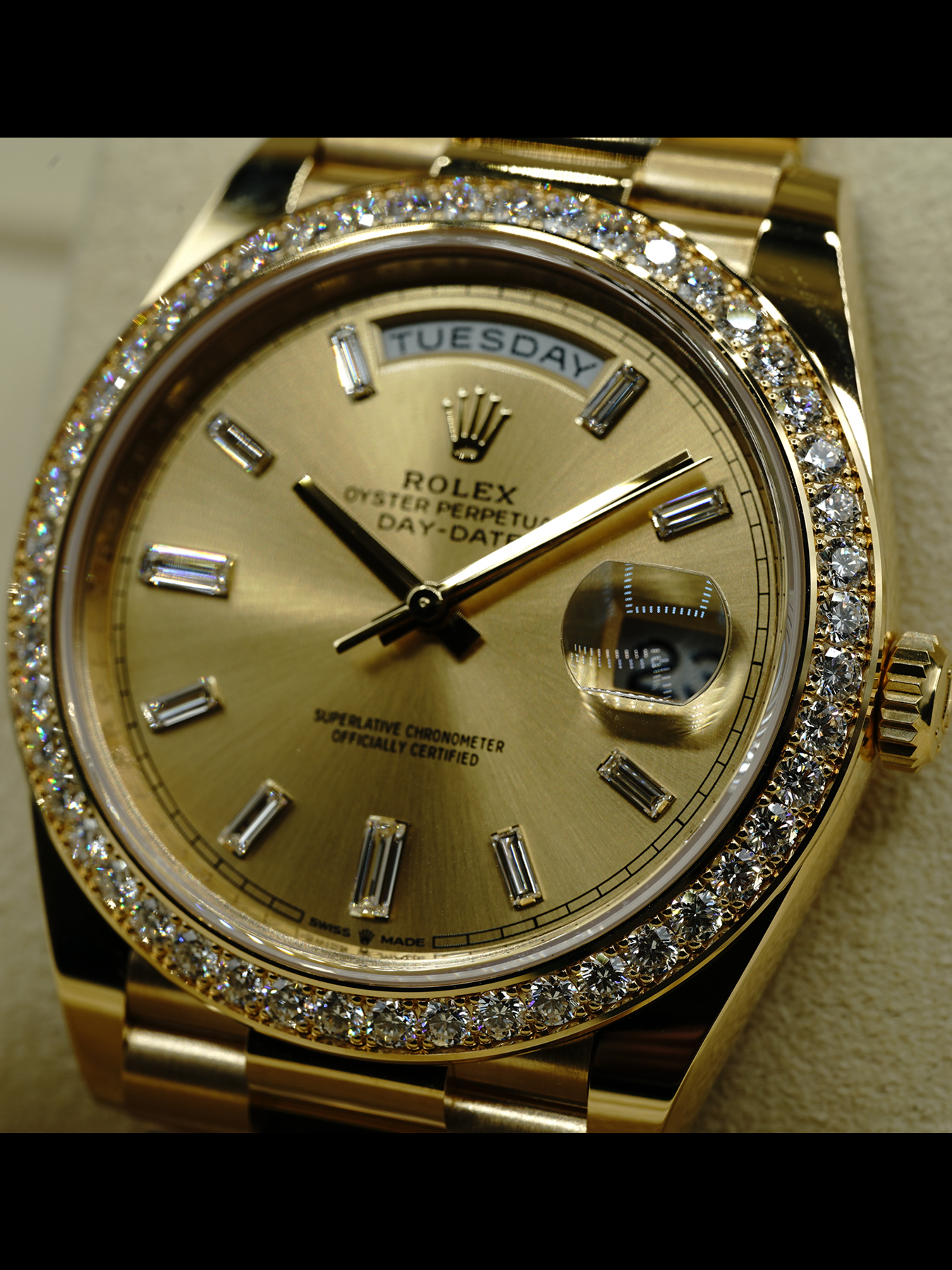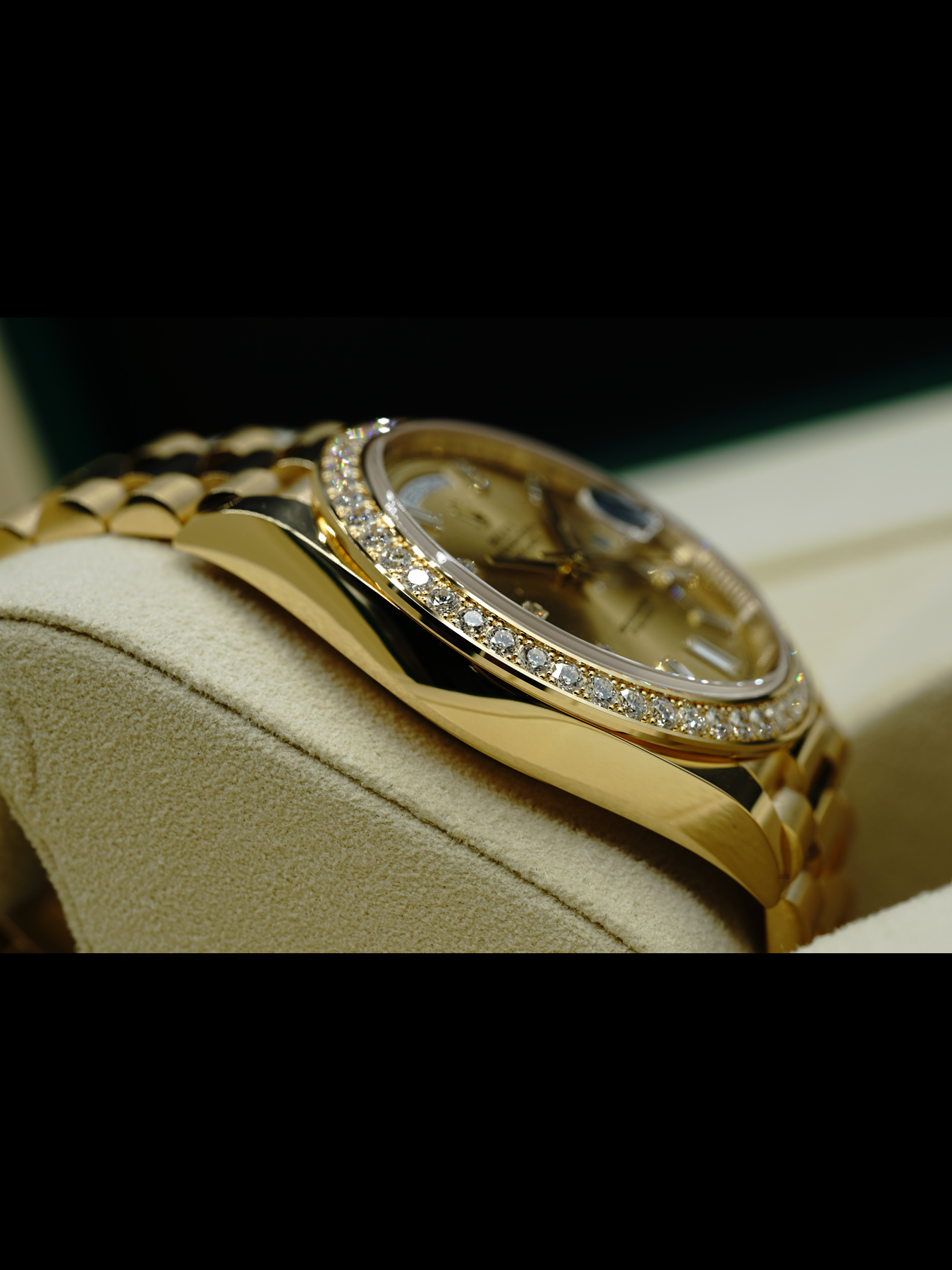 This Oyster Perpetual Day-Date 40 Rolex has 18ct gold, diamond-set bezel, and a president bracelet with three-piece solid links comprised of a polished center link.