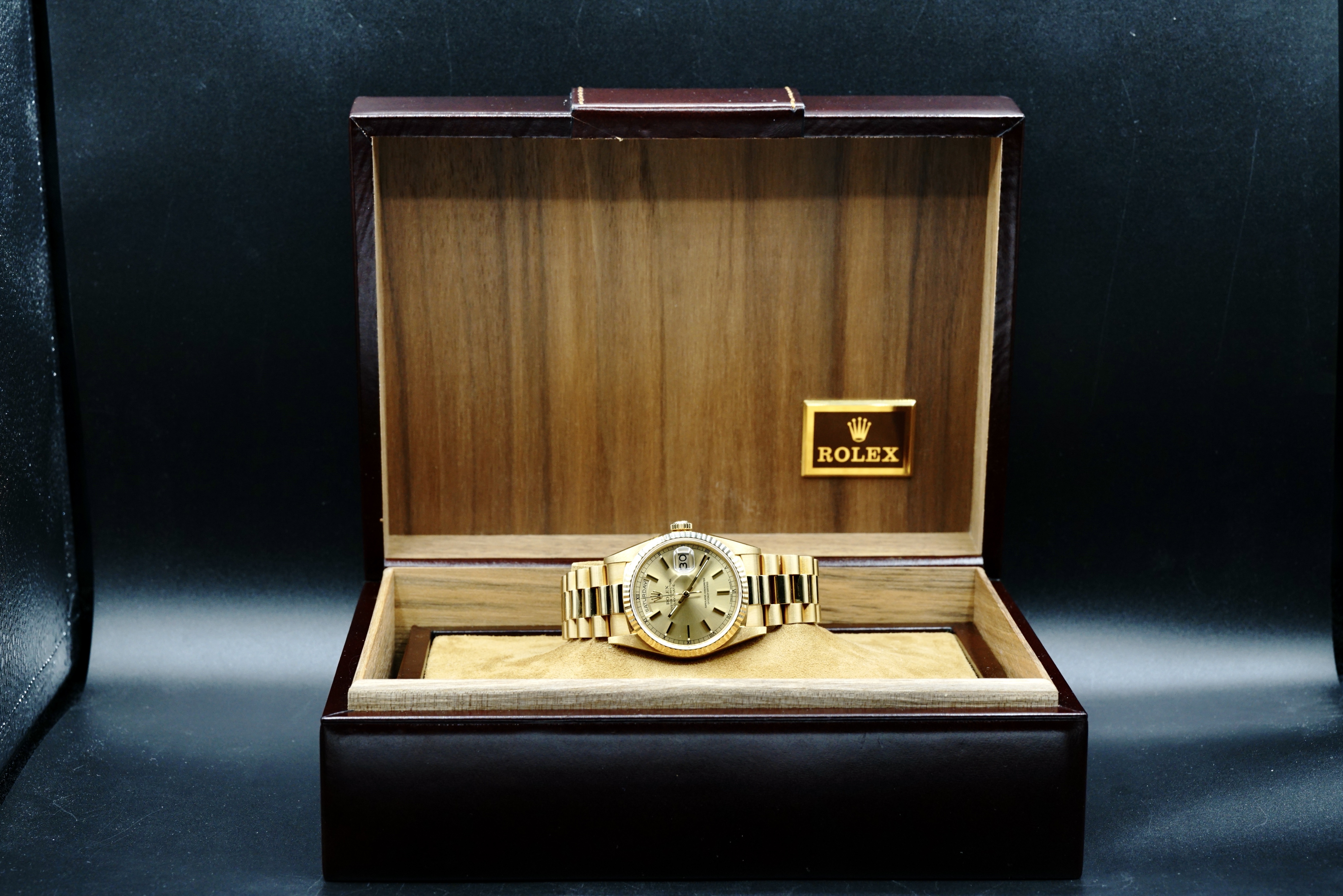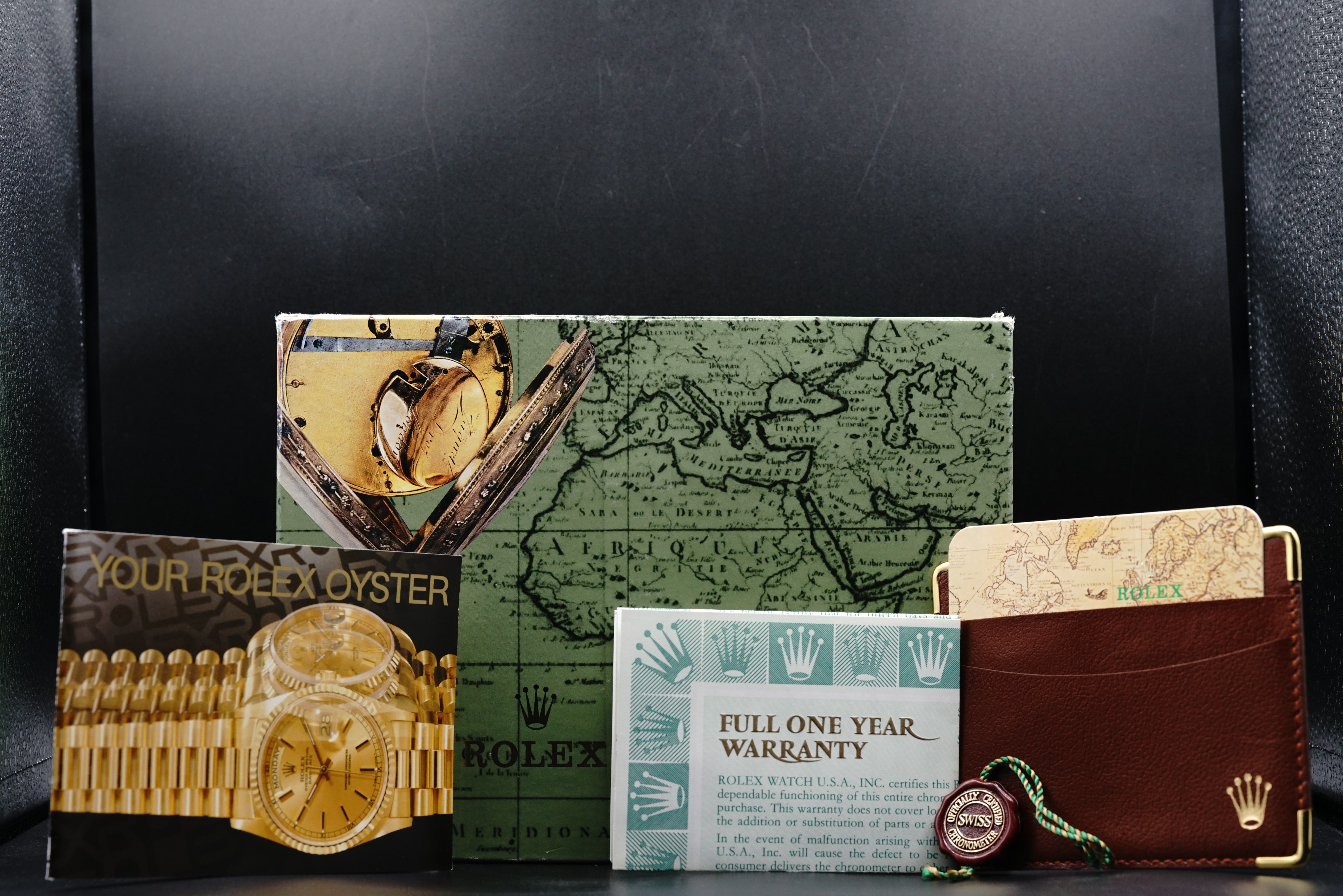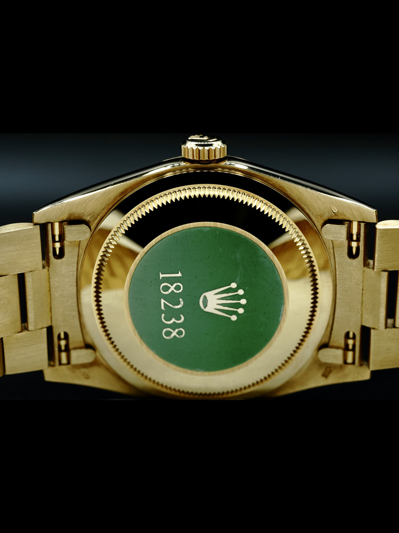 This Rolex Day-Date President 18238 is in EXCELLENT condition. This watch includes its original box, instruction manual, world-wide service centers booklet, and official chronometer certification. This watch was purchased on 1990 has remained in a safe until today. Never been worn.