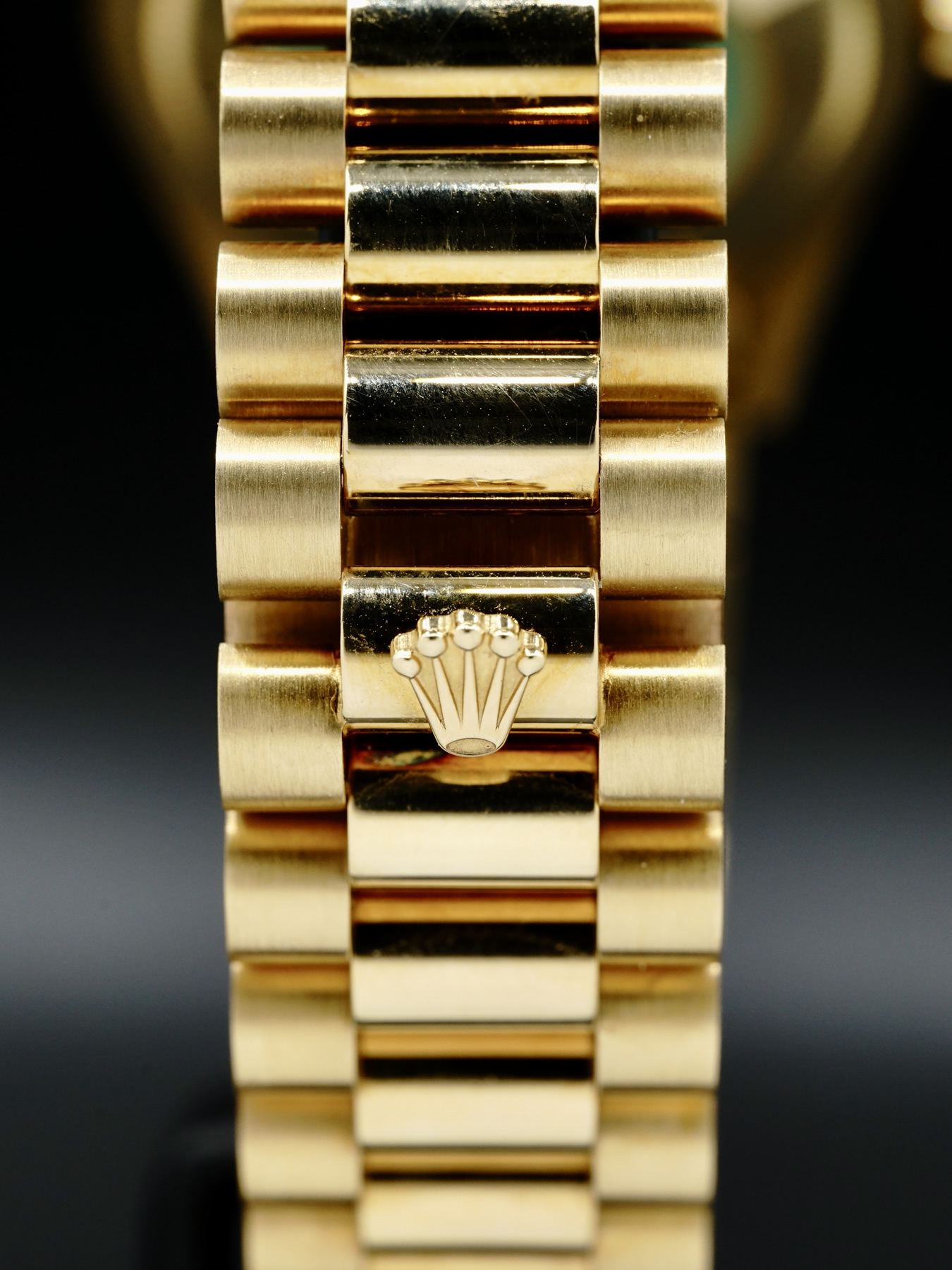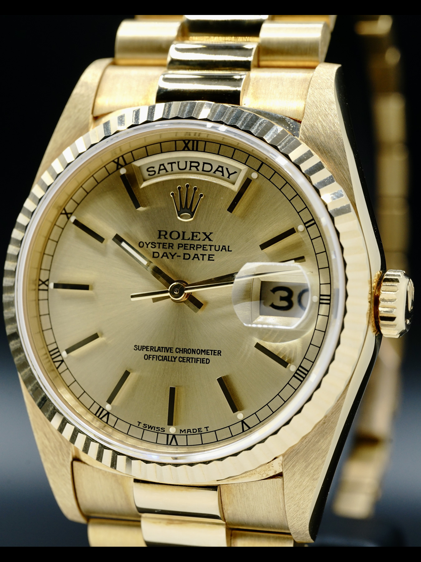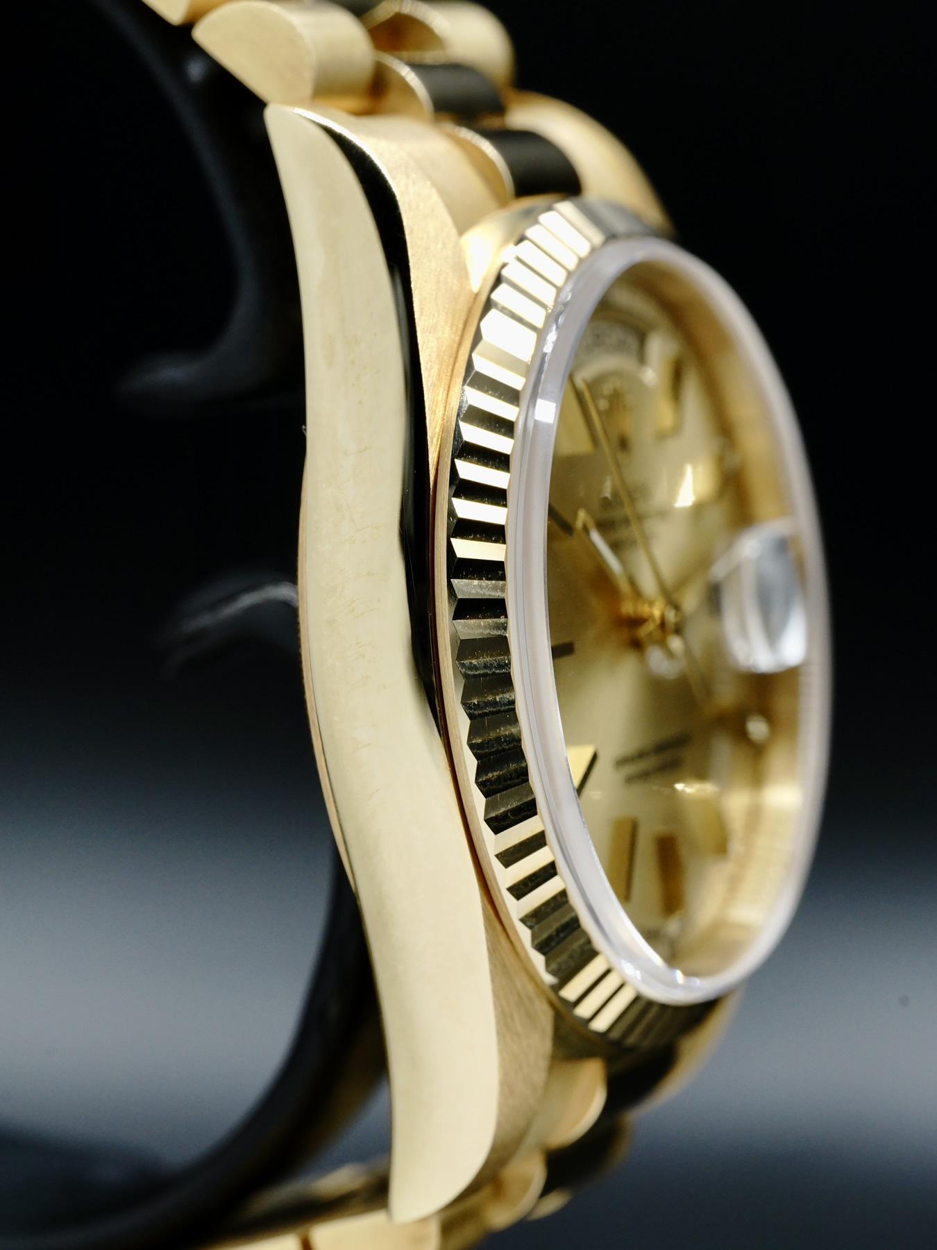 This Rolex Day-Date President features a 36mm 18k yellow gold case & 18k yellow gold fluted bezel with a solid case back on an 18k yellow gold presidential bracelet. This watch also sports a beautiful champagne colored dial with raised gold baton hours markers covered by scratch resistant sapphire crystal with a cyclops lens over the date display.