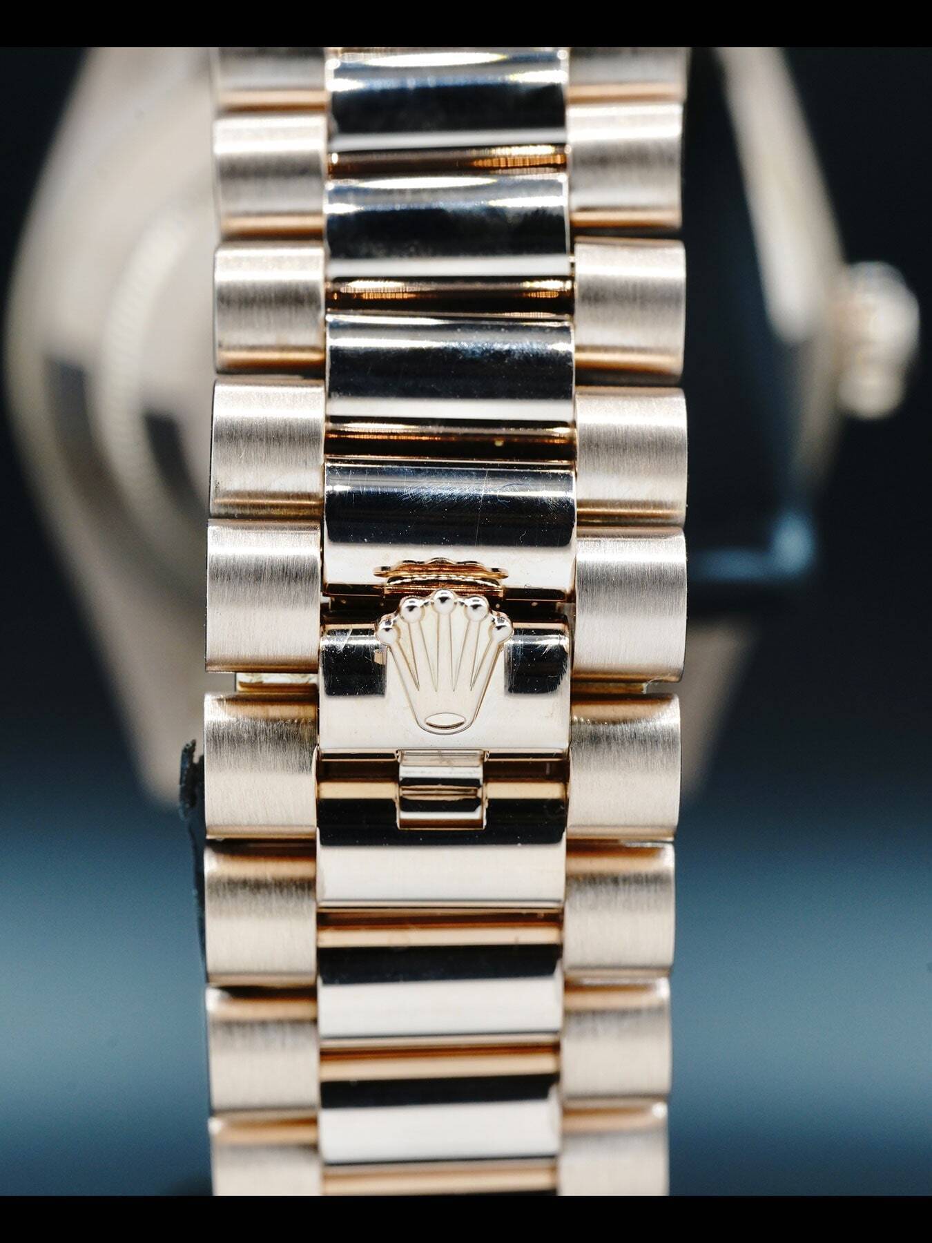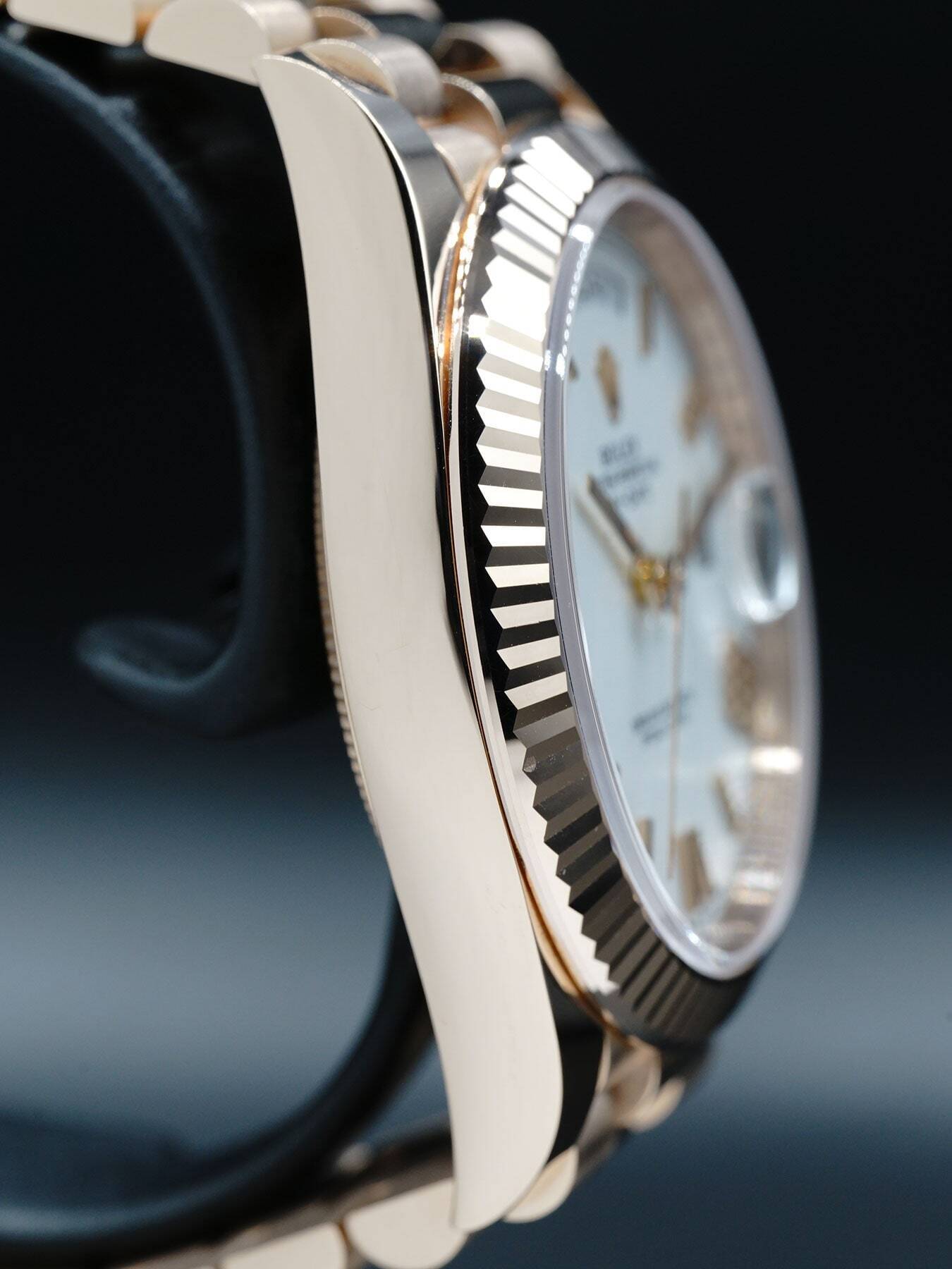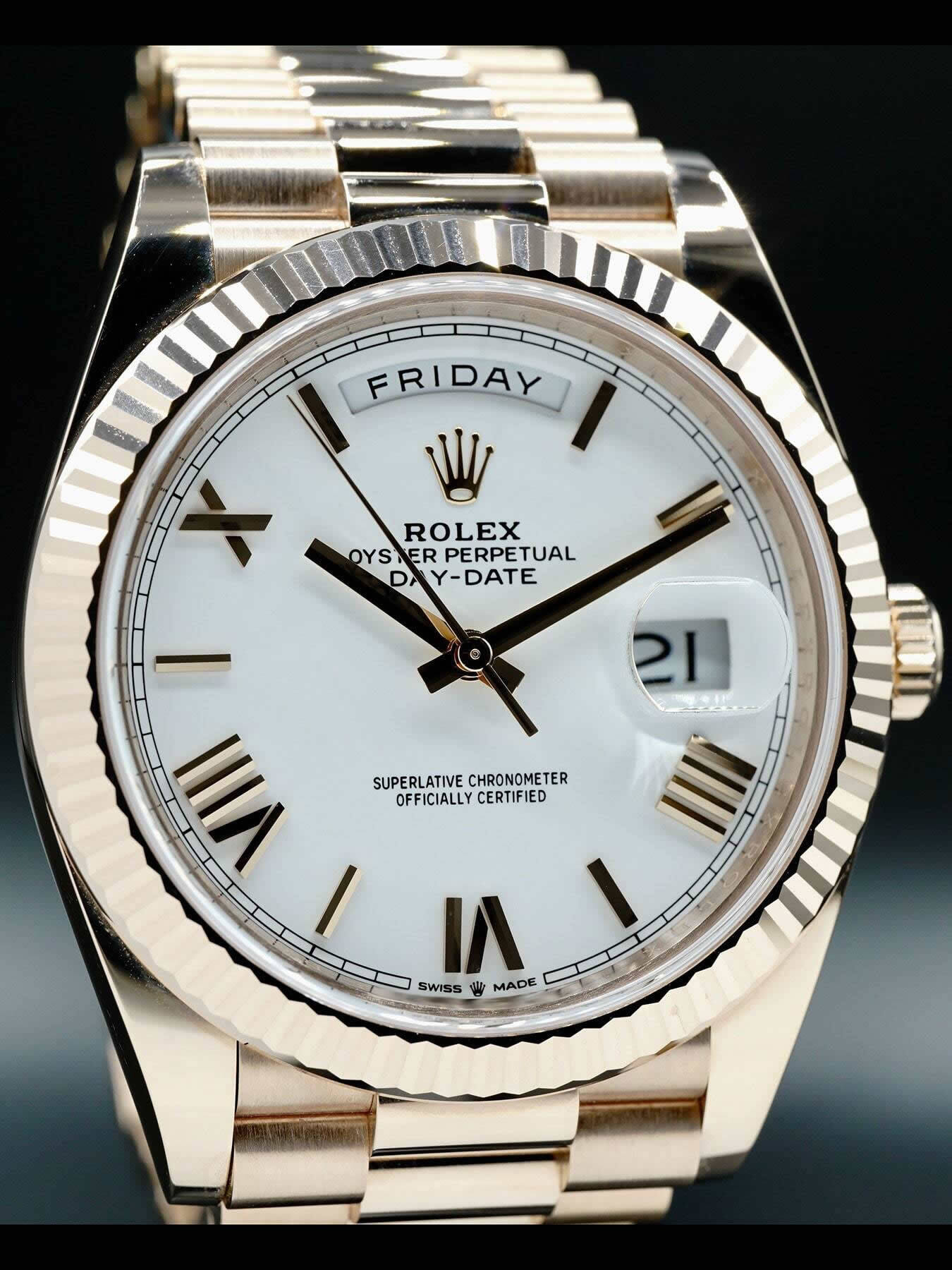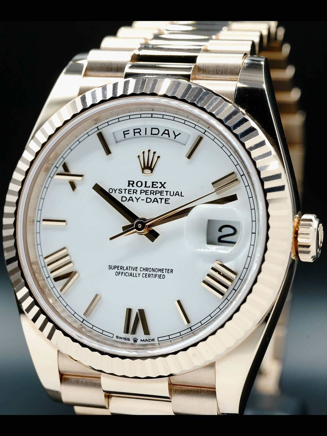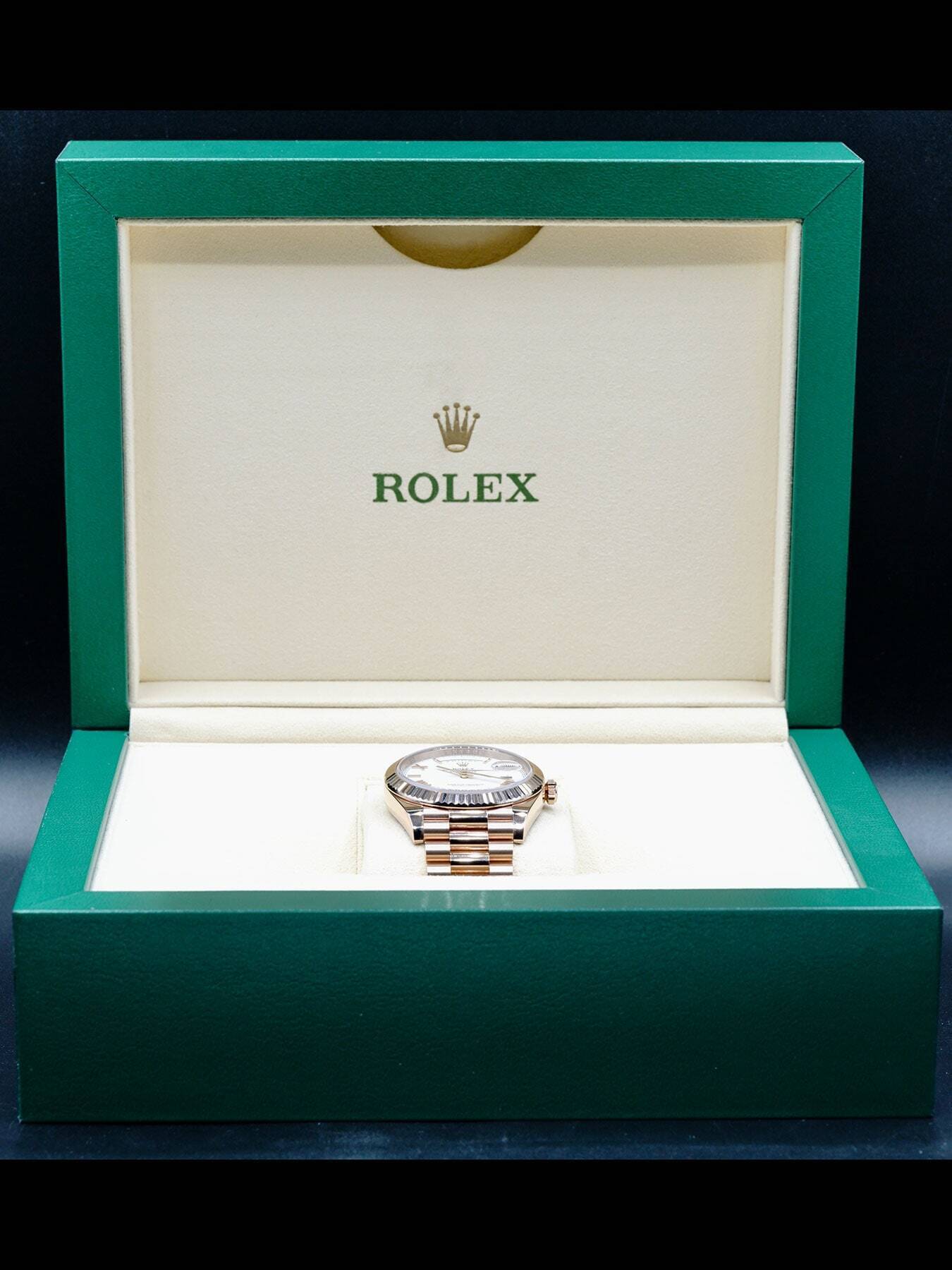 This Rolex Oyster Perpetual Day-Date 40 Everose Gold features a 40mm 18k Everose gold case & fluted bezel with a solid case back on an 18k Everose gold president bracelet. This watch also sports a white dial with Everose gold-tone hands and roman numeral dial markers covered by scratch resistant sapphire crystal with a cyclops lens over the date display.