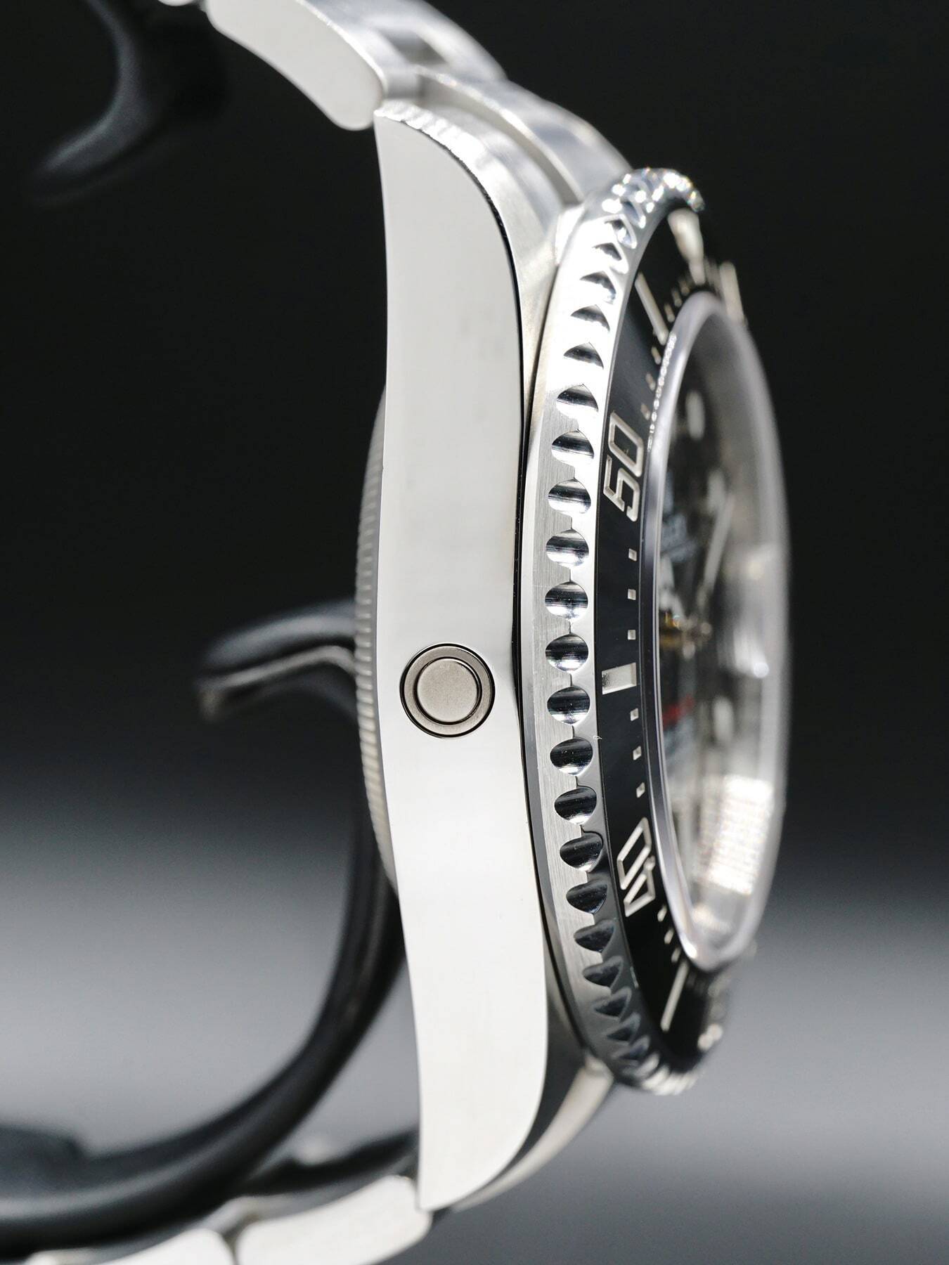 This Rolex Sea-Dweller "Redline" features a 43mm stainless steel case with a solid case back on a stainless steel rolex oyster bracelet. Stainless steel bezel with a black ceramic top ring. This watch also sports a black dial with silver-tone mercedes-logo, sword, and Breguet style hands covered by scratch-resistant sapphire crystal.