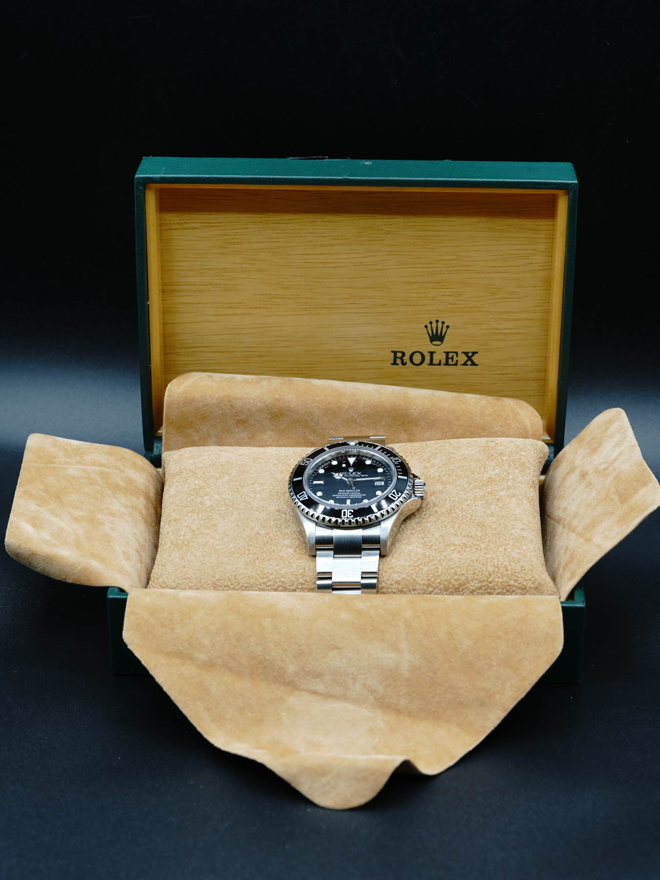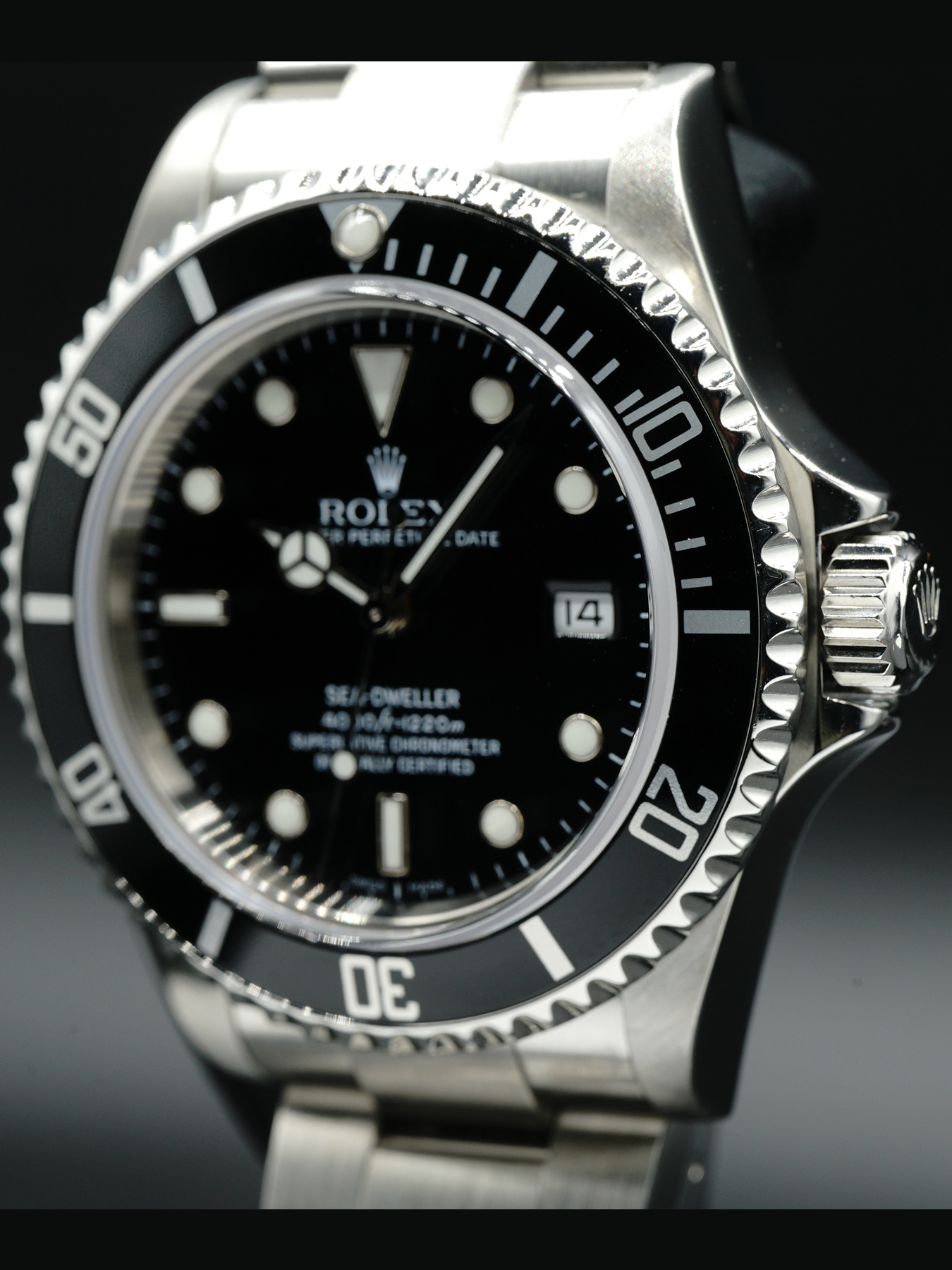 This Rolex Sea-Dweller Watch is in EXCELLENT condition. This watch features a distinctive black dial and large luminescent hour markers. Waterproof to a depth of 1,220 meters with a unidirectional 60 minute rotatable bezel, the Rolex Sea-Dweller is amongst the ultra-resistant divers' watches engineered by Rolex for deep-sea exploration. This watch includes its original box and papers. Model 2005. also known as "The Triple Six".