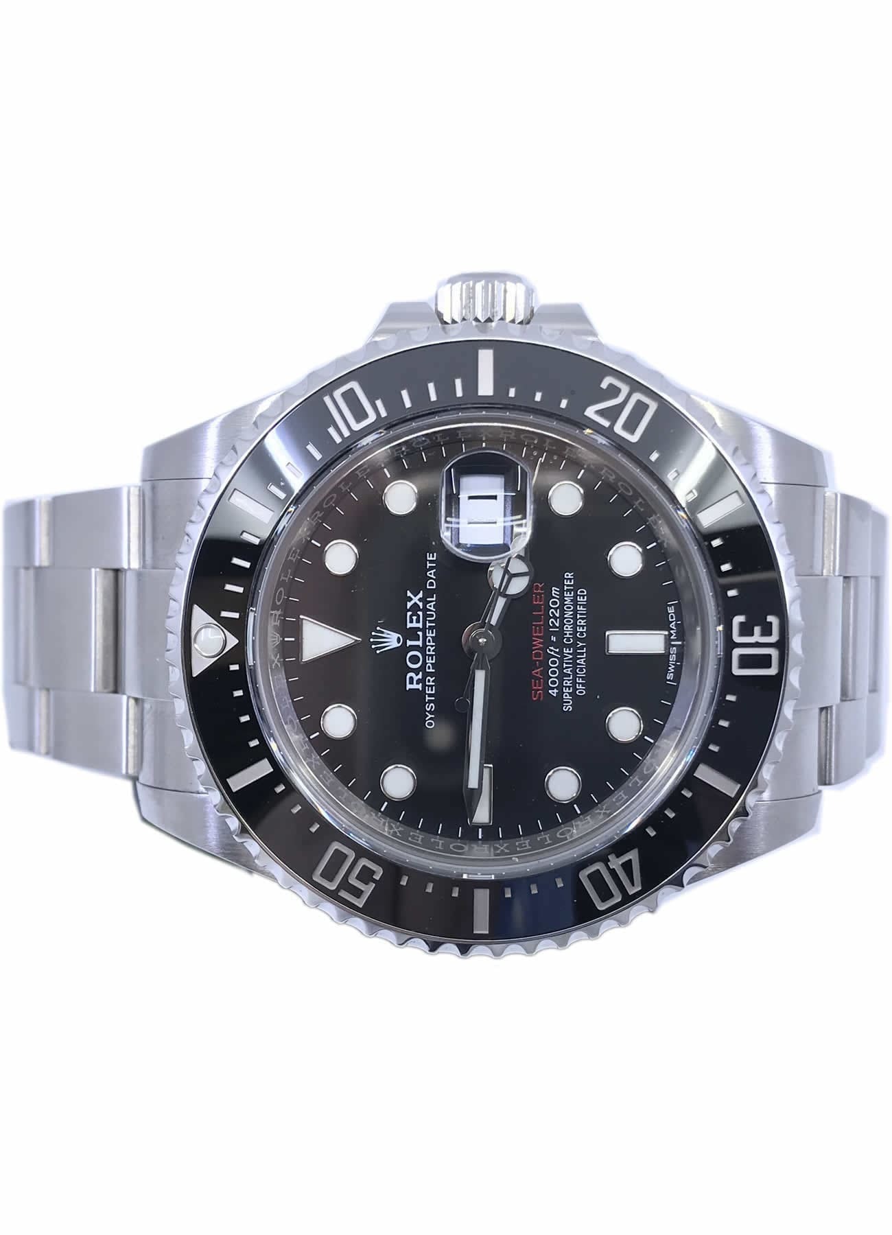The black dial of the Sea-Dweller has the large hands and indices reserved for Rolex professional models. The dial bears the name Sea-Dweller in red, a reference to the first model. The innovative Chromalight display on the dial pushes back the boundaries of visibility in dark environments. Its distinctive blue glow lasts up to eight hours with a uniform luminosity, practically twice as long as that of standard luminescent materials.