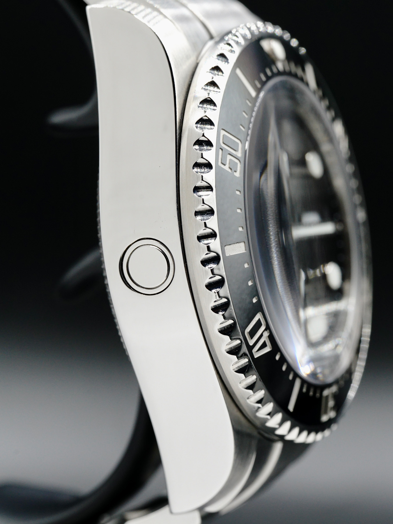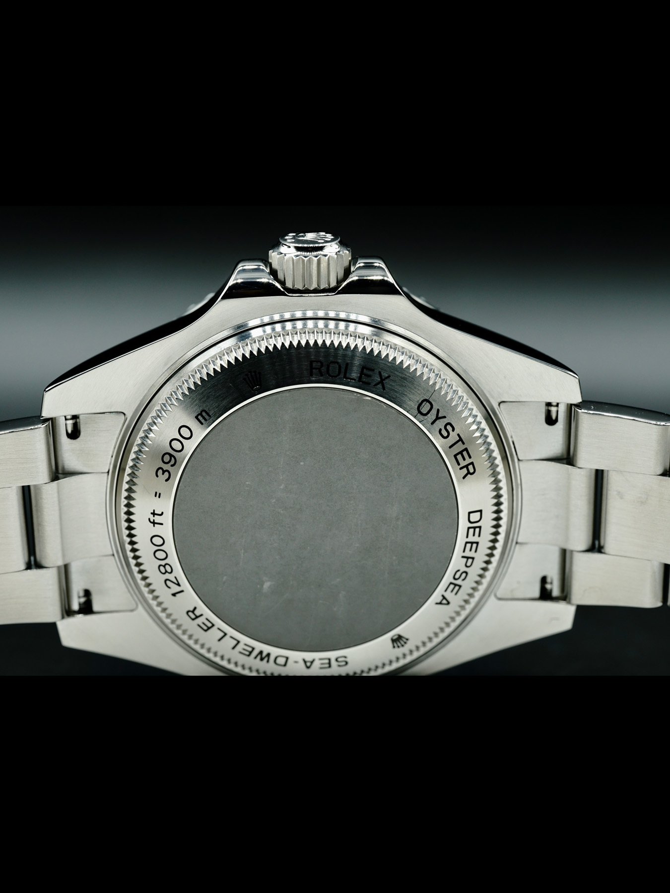 This Rolex Deepsea Sea-Dweller features a 44mm stainless steel case with a solid case back on a stainless steel bracelet. This watch also sports a black dial with Chromalight display and a date display at 3 o'clock covered by scratch resistant sapphire crystal.