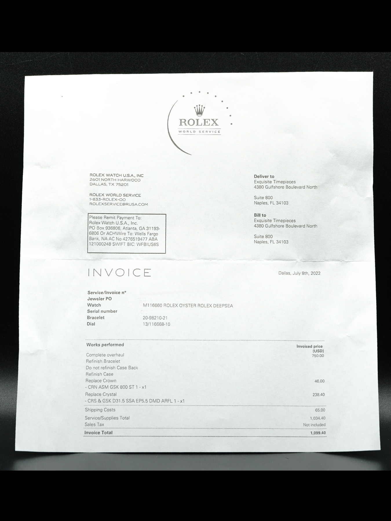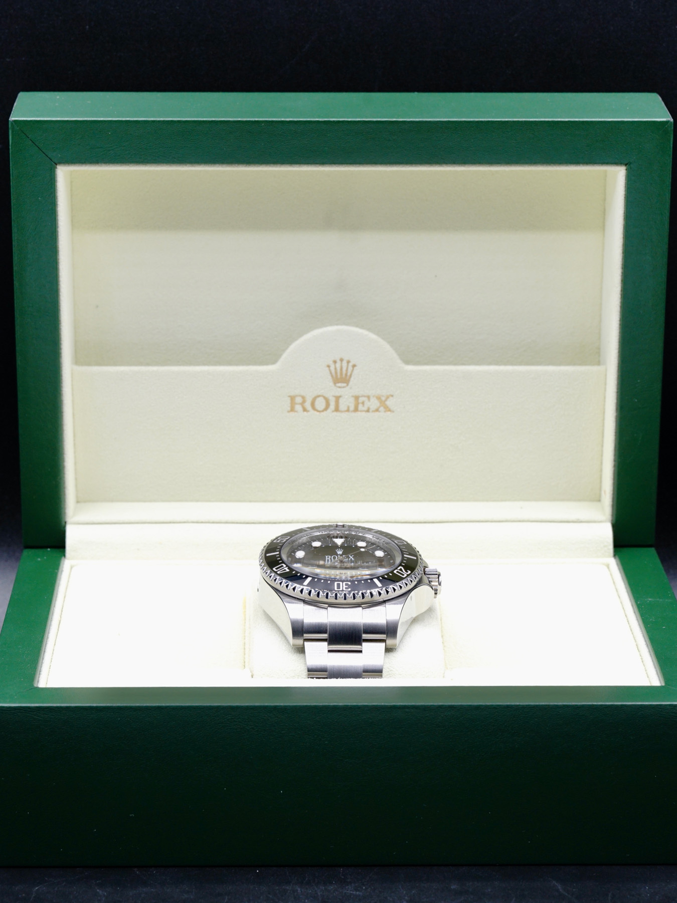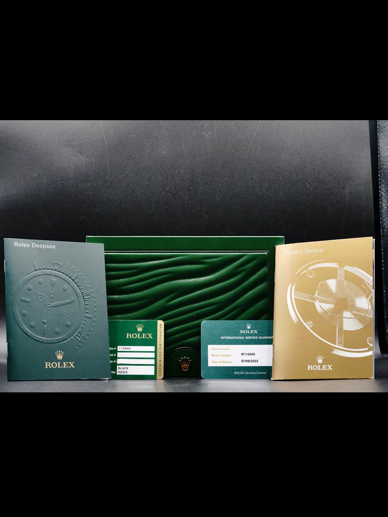This Rolex Deepsea Sea-Dweller 116660 is in EXCELLENT condition. This watch includes its original box, instruction manual, factory service booklet, official chronometer certification, international warranty card dated for July 2011, and international service guarantee dated for July 2022. *Fully serviced by Rolex on July 8th, 2022 and is guaranteed for a period of 2 years from the date of service.*