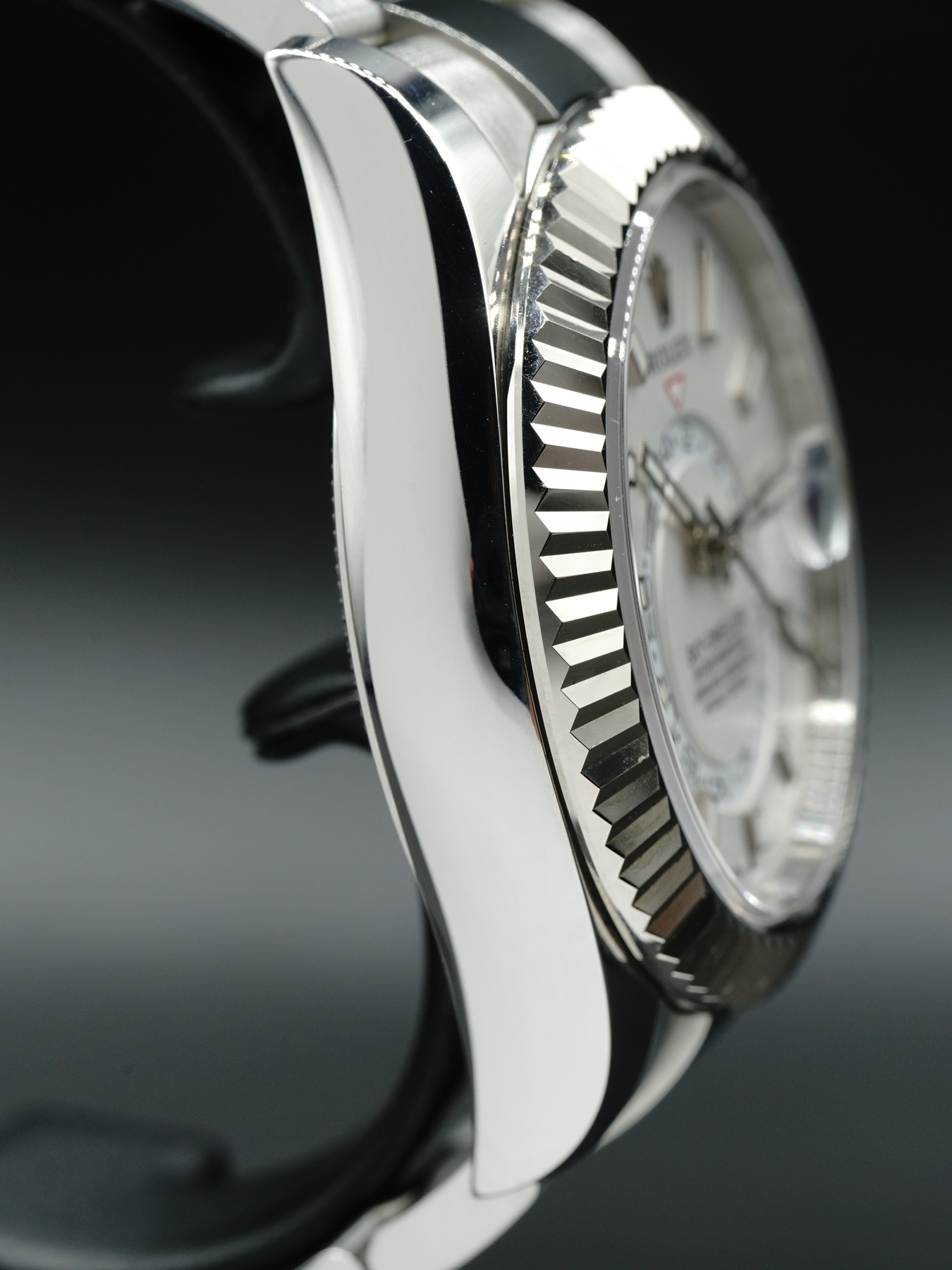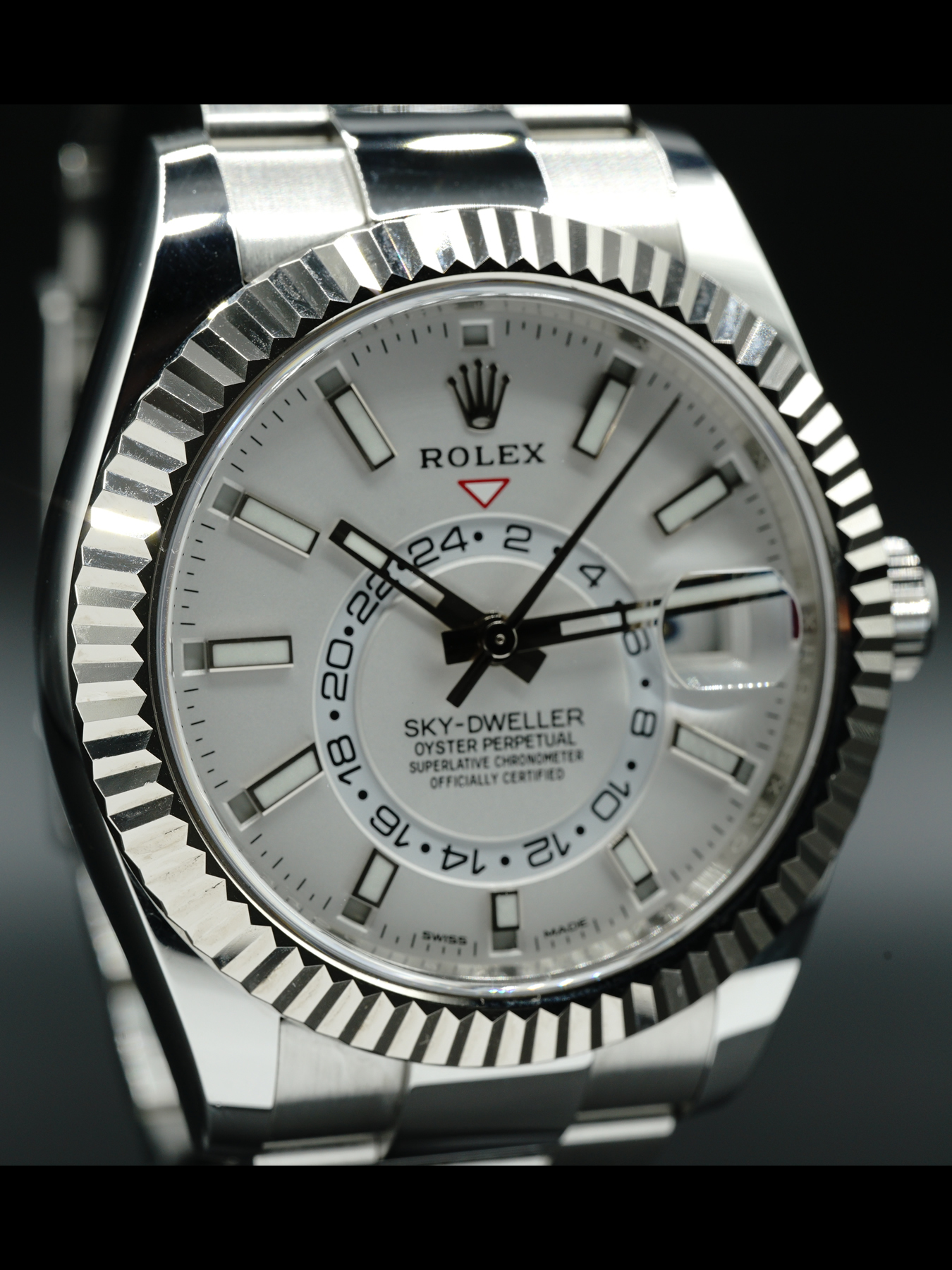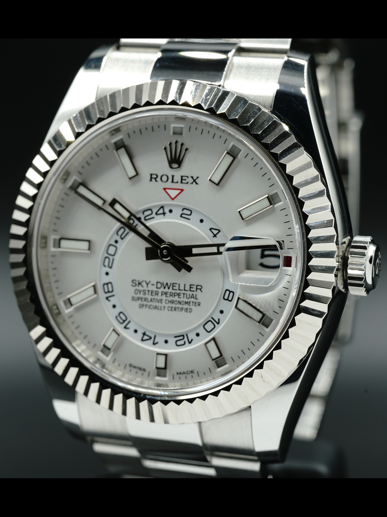 This Oyster Perpetual Sky-Dweller in Oystersteel and white gold with a white dial is in EXCELLENT condition. This watch includes its original box, papers, and warranty dated for April 2018.