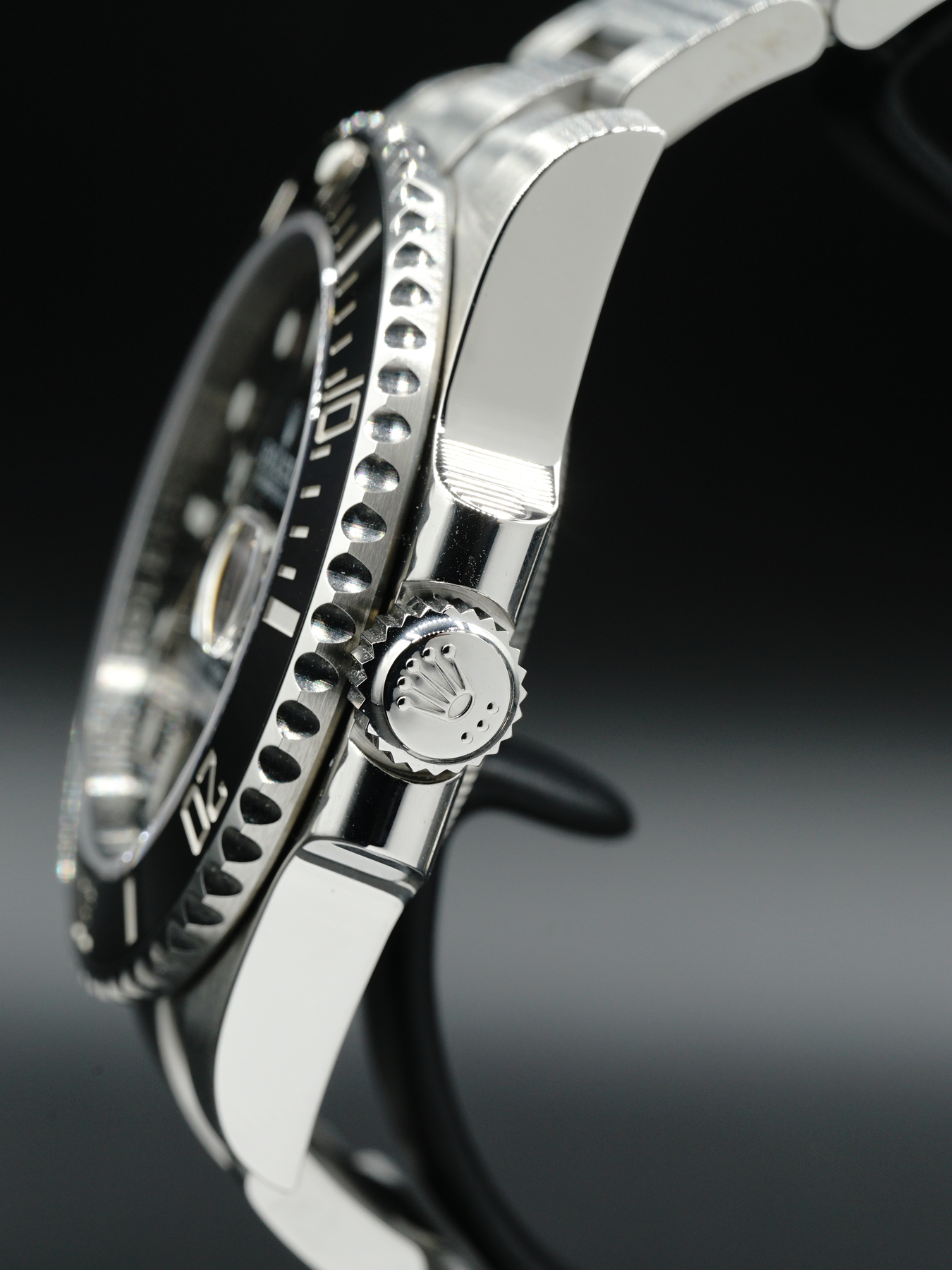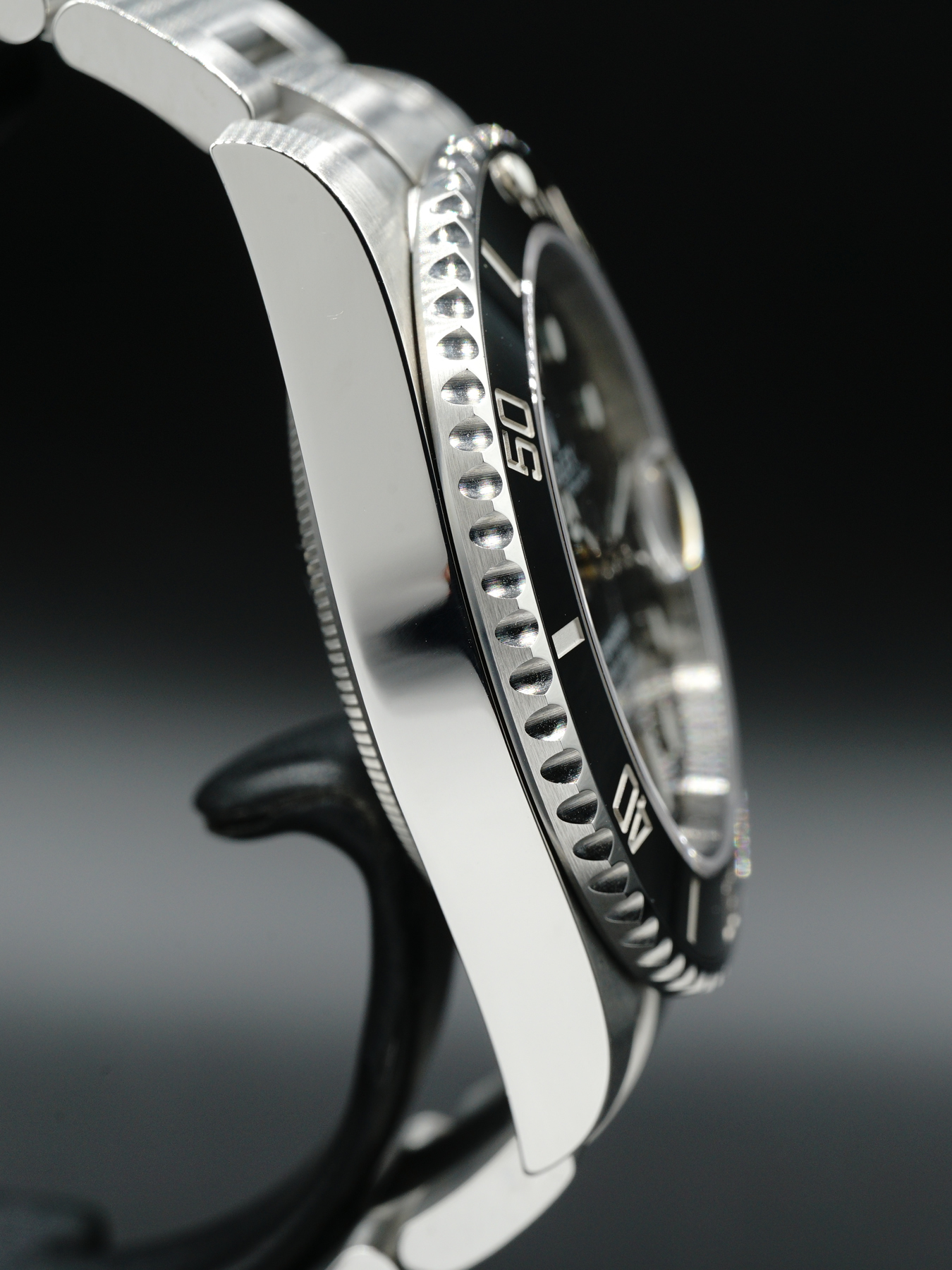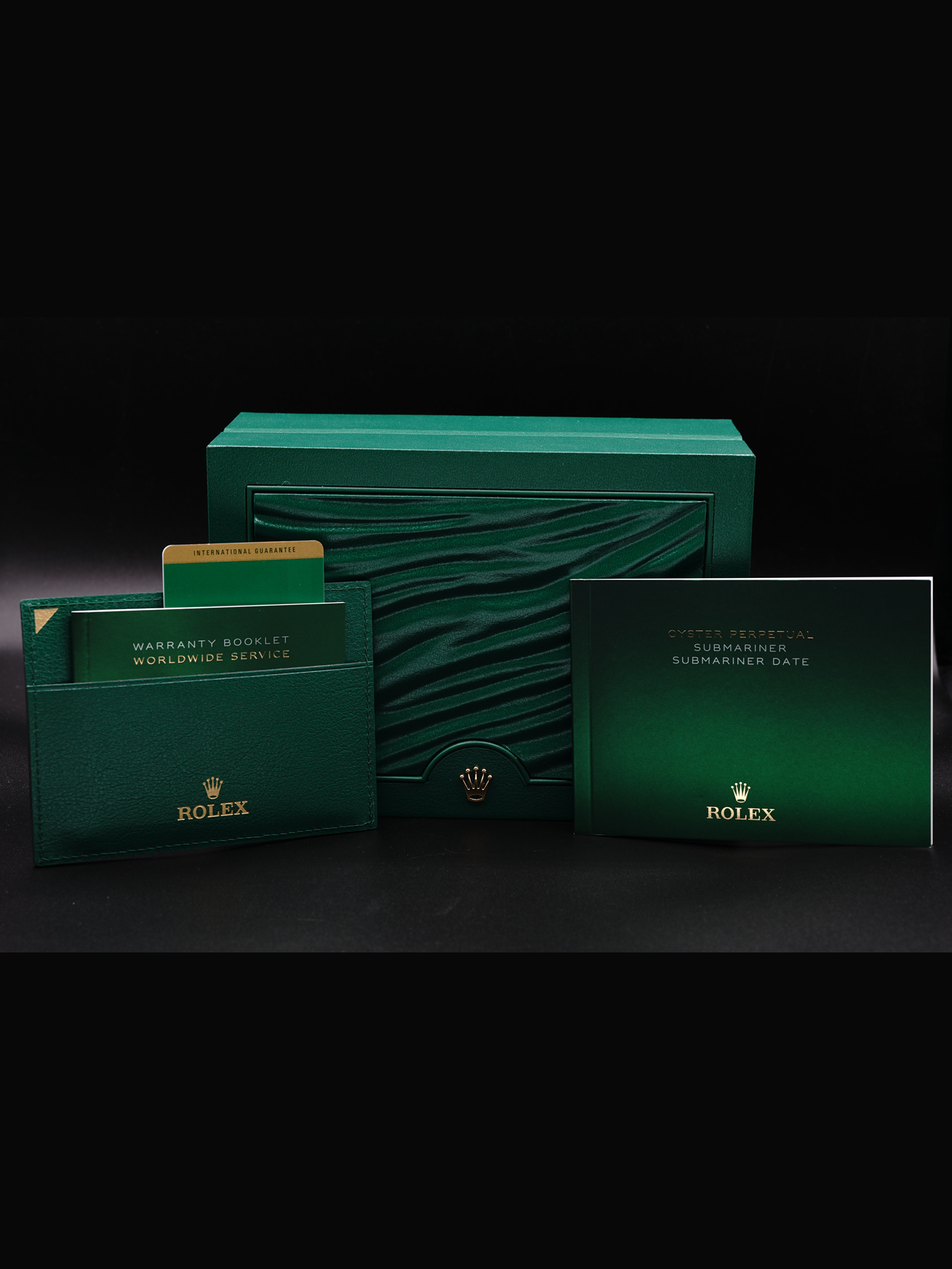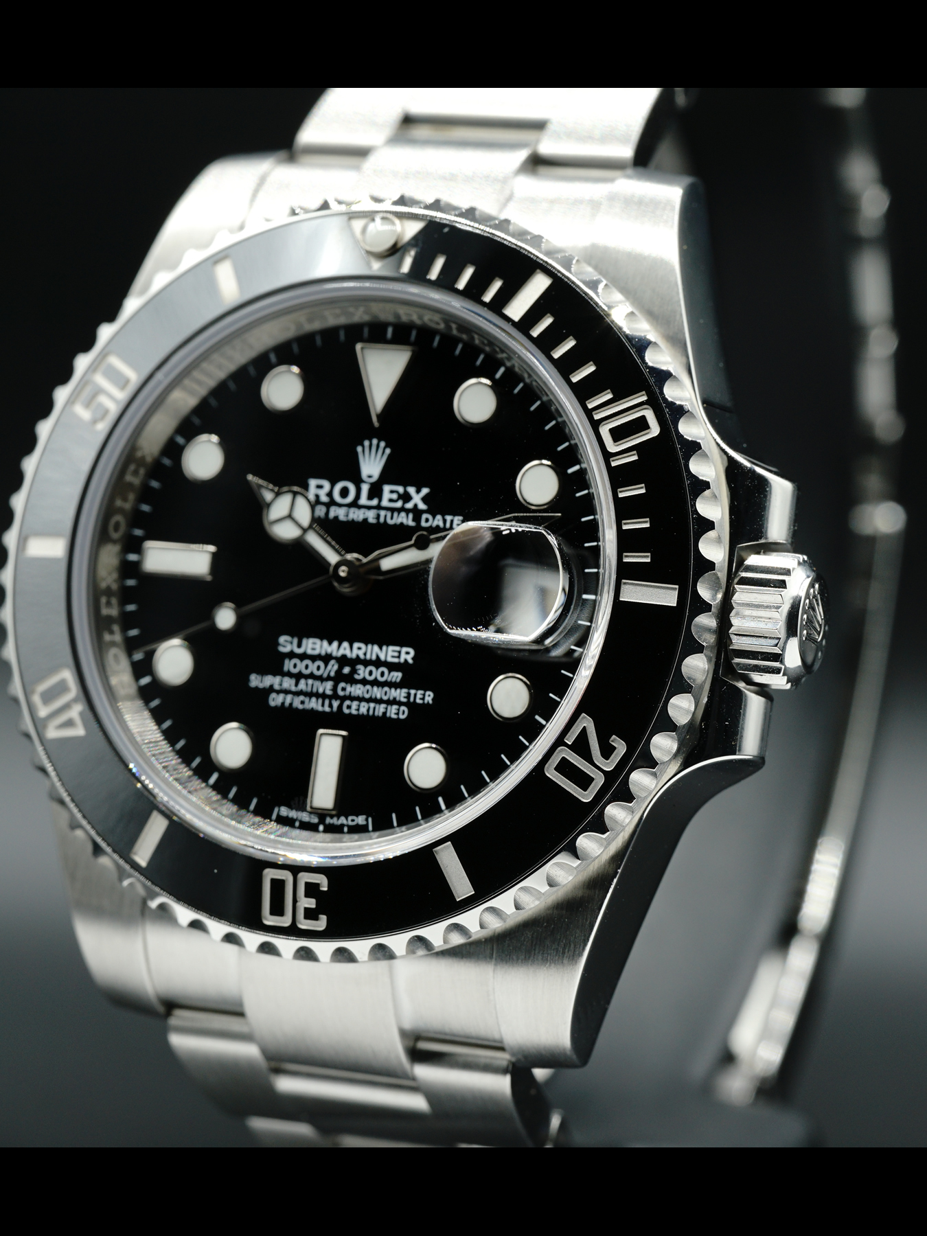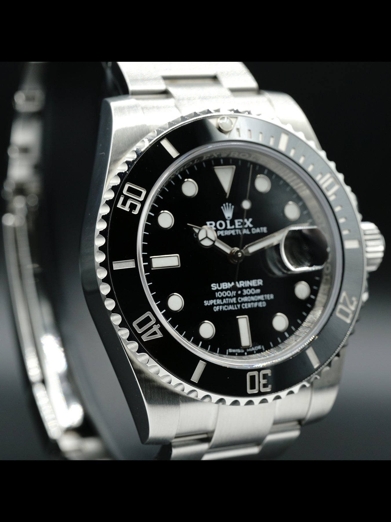 This Rolex Submariner Oyster Perpetual Date stainless steel (oyster steel) is in MINT condition. This watch sports a stainless steel 40mm case with black unidirectional rotating ceramic bezel, scratch resistant sapphire crystal and inner reflector ring. The dial is black with chromalight display and the bracelet is stainless steel oyster with glidelock clasp. This specific watch includes its original box, papers, and international guarantee dated for December 2018.