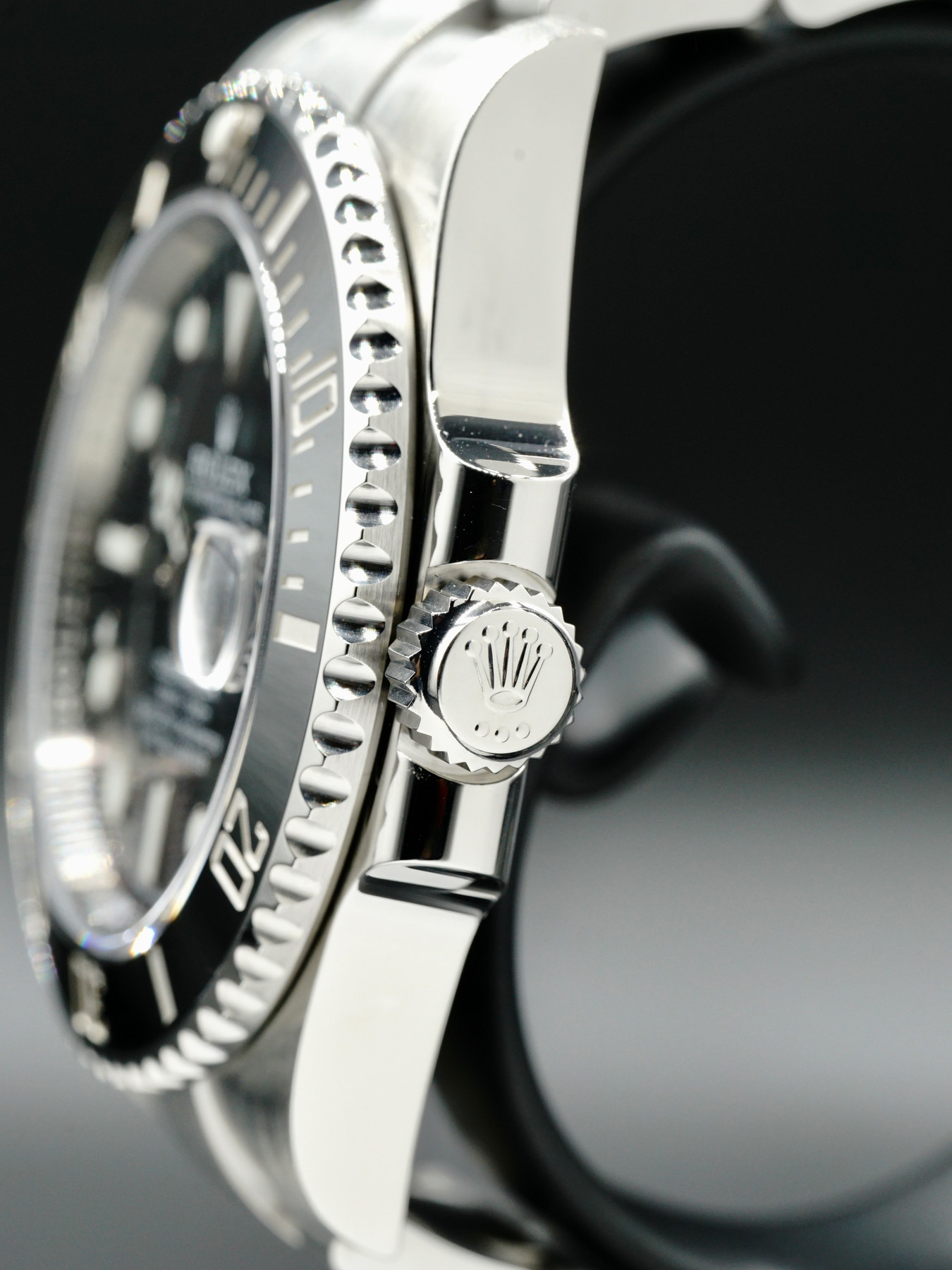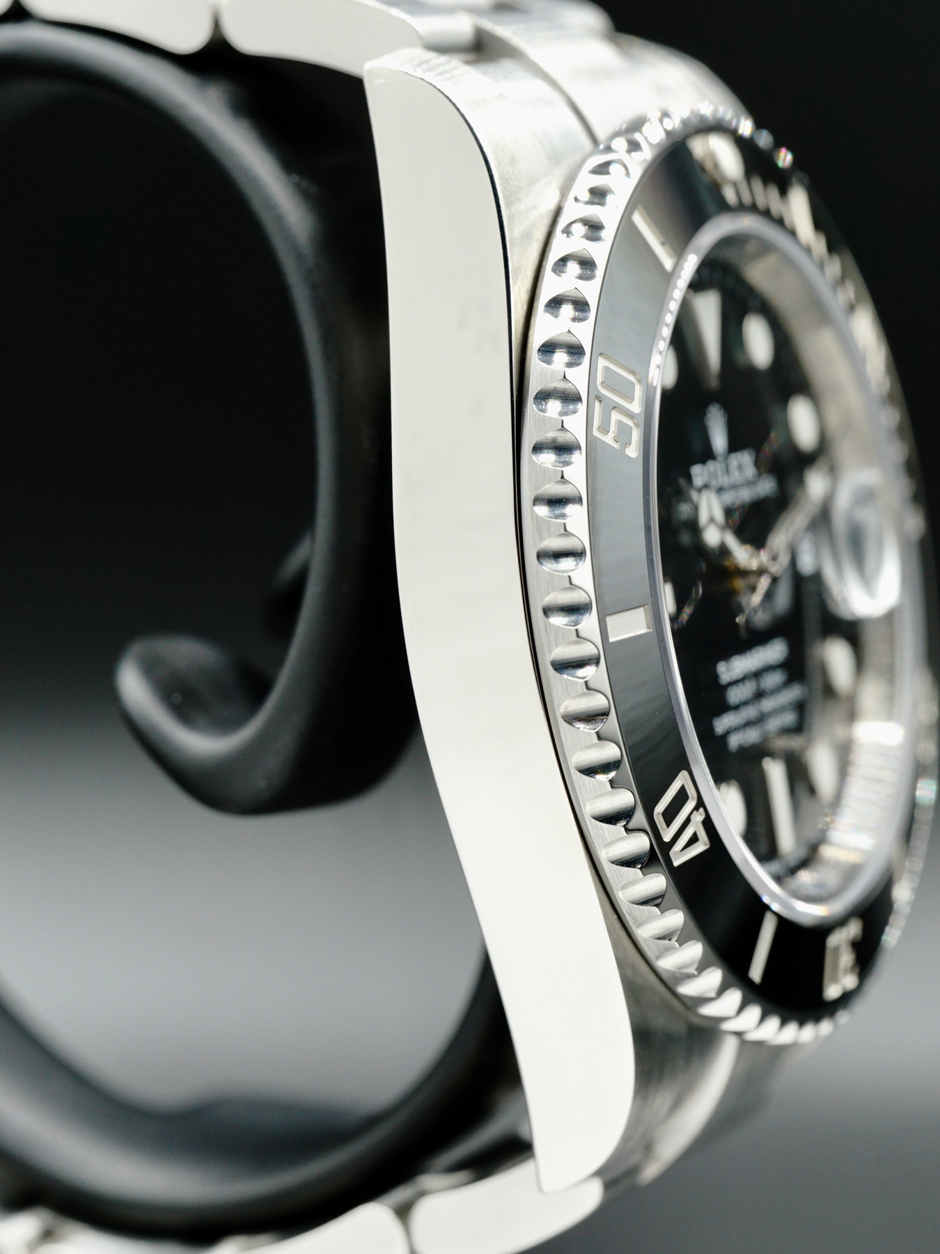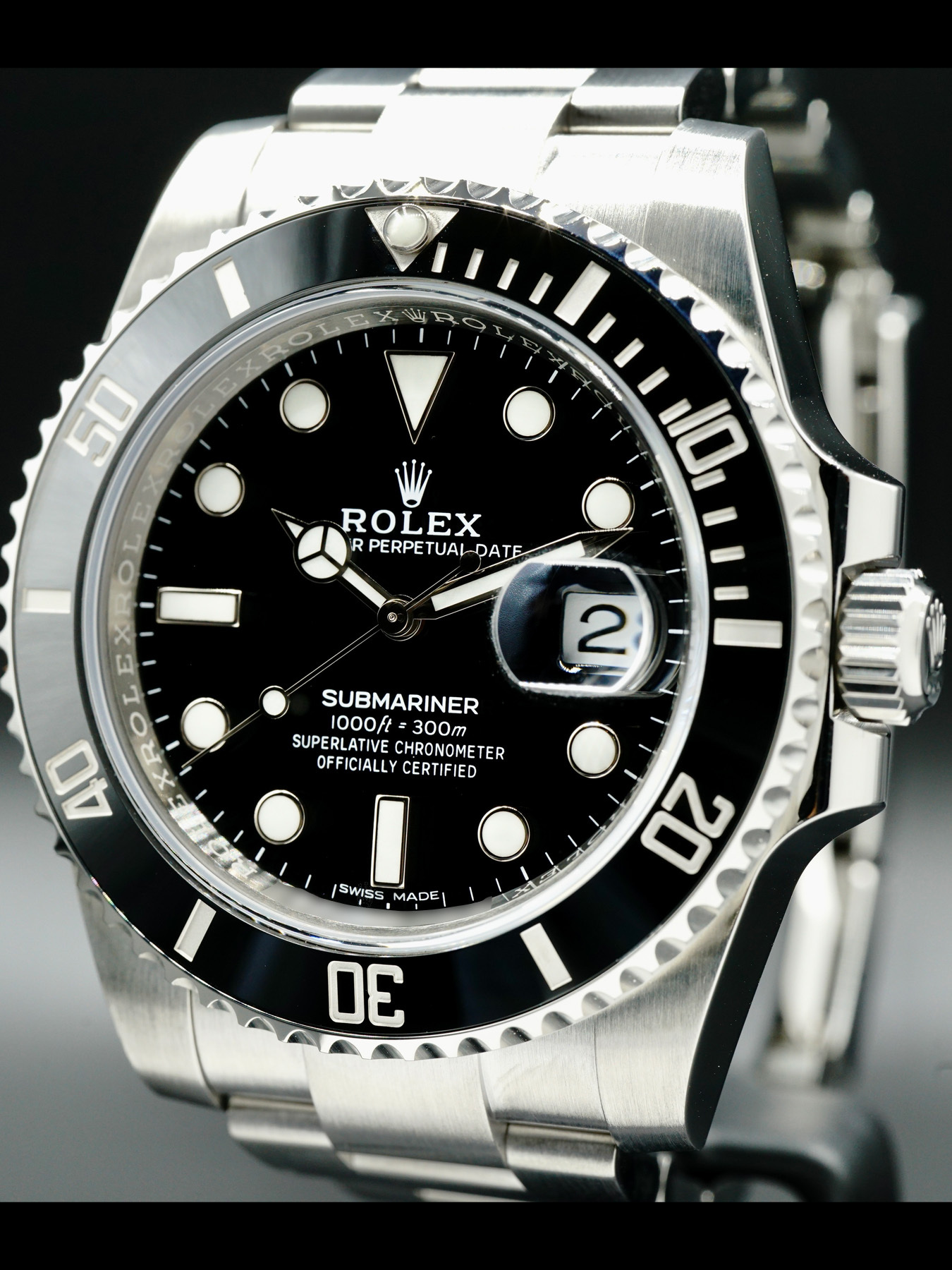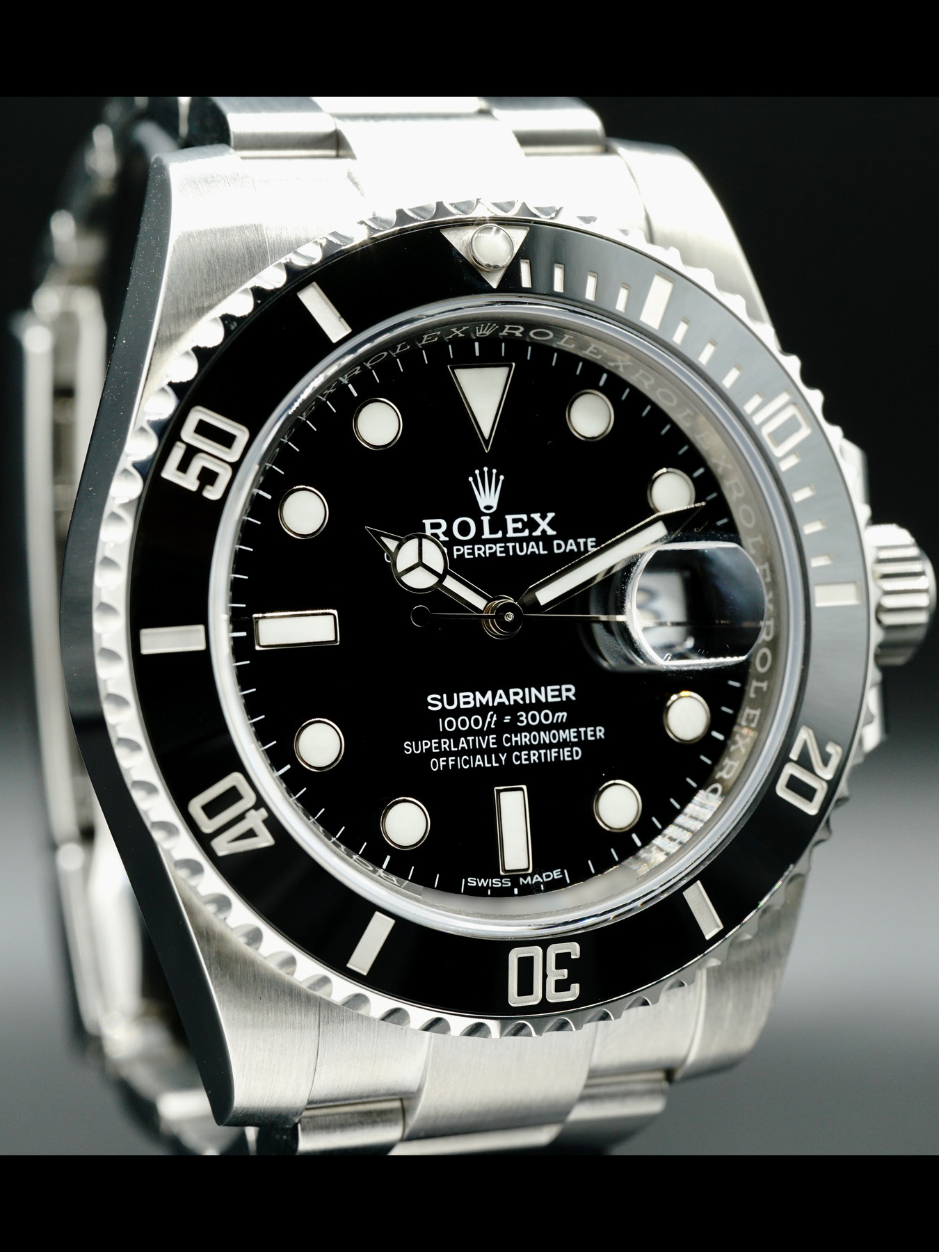 This Rolex Submariner Date features a 40mm stainless steel case with a solid case back on a stainless steel bracelet. This watch also sports a black dial with luminous hands and index dial markers covered by scratch resistant sapphire crystal.