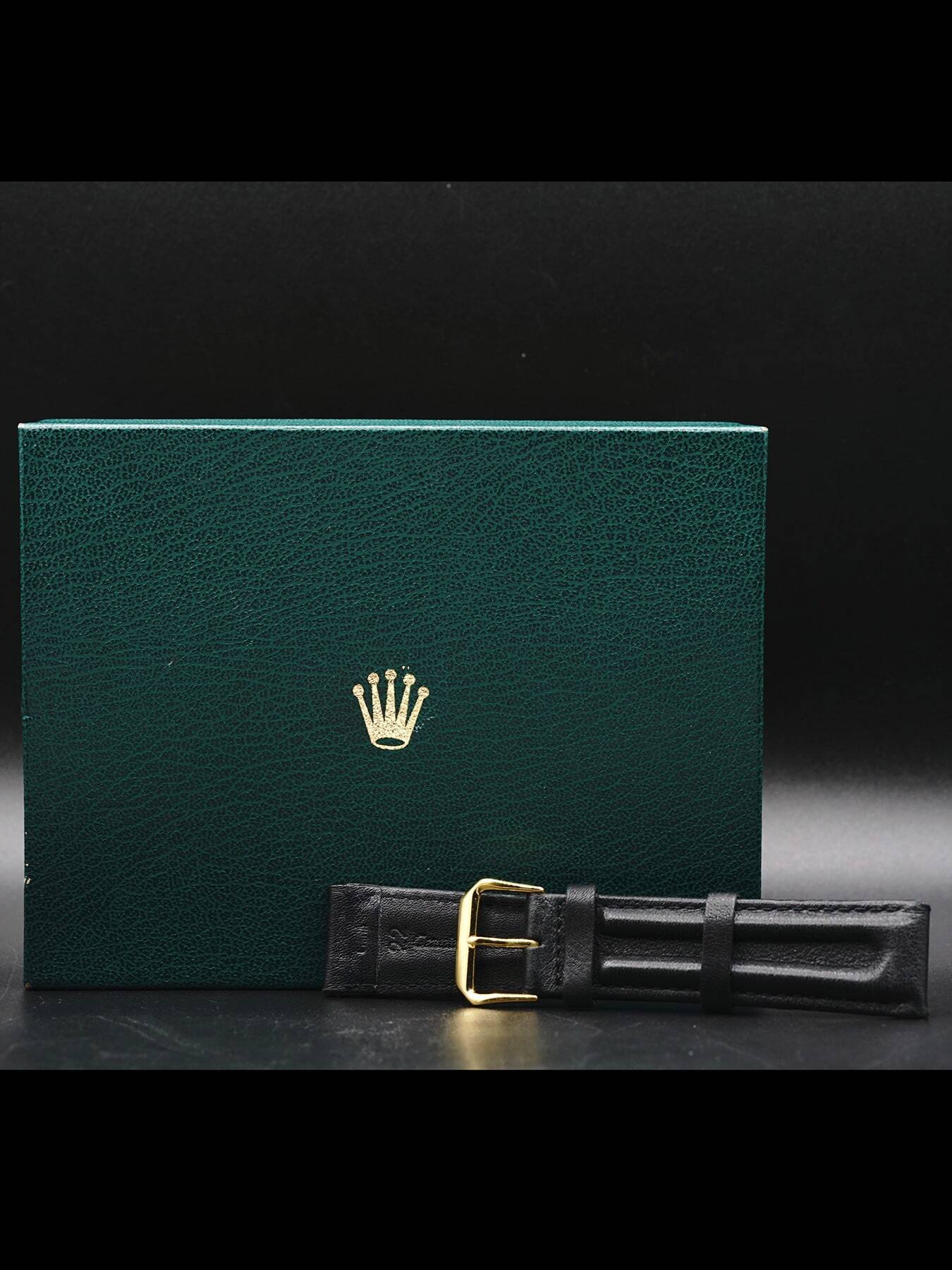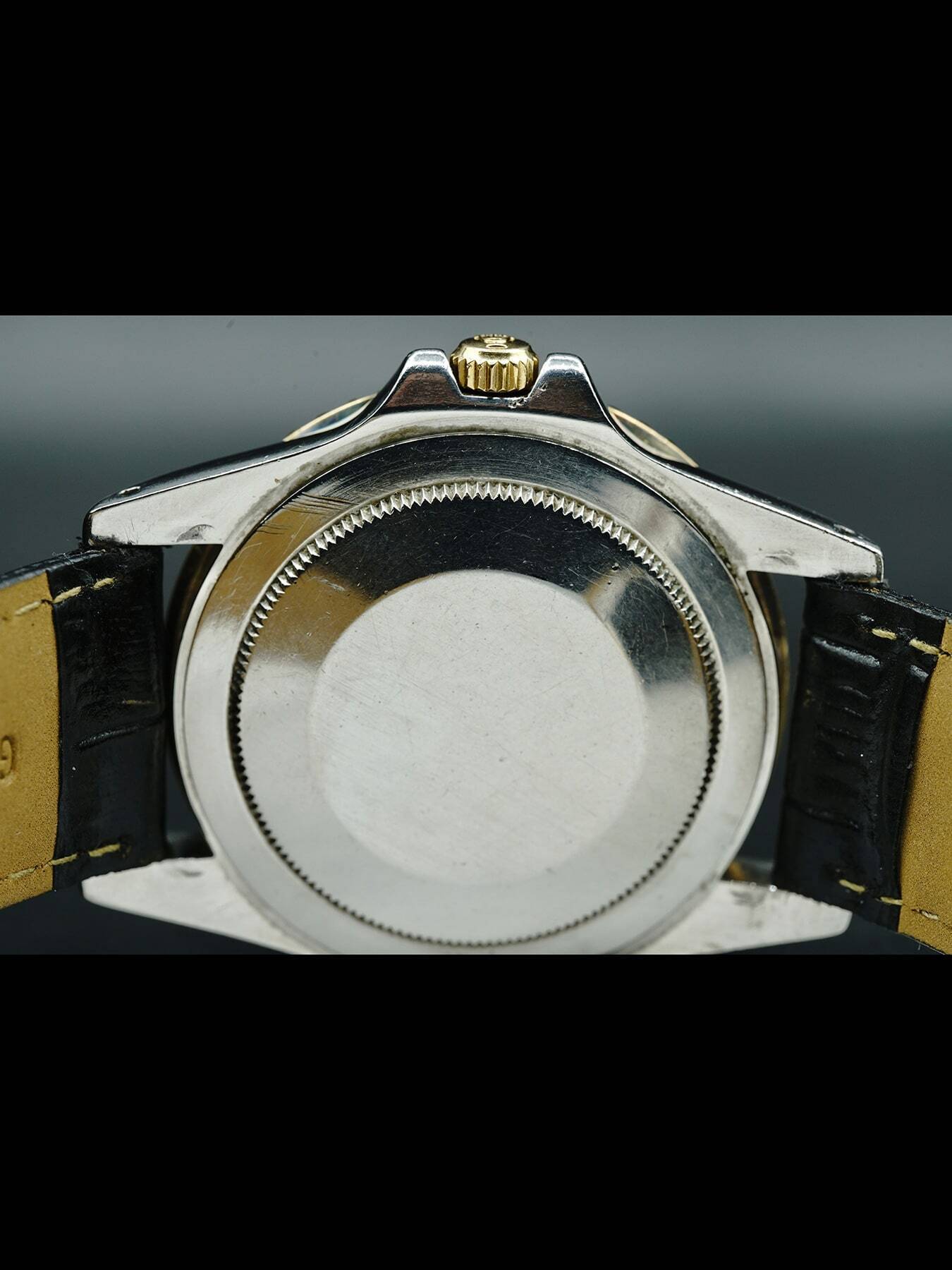 This Rolex GMT-Master features a 40mm stainless steel case with an 18k yellow gold bezel and crown on a black leather strap. This watch also showcases a black dial with tritium hands and hour markers covered by acrylic crystal.